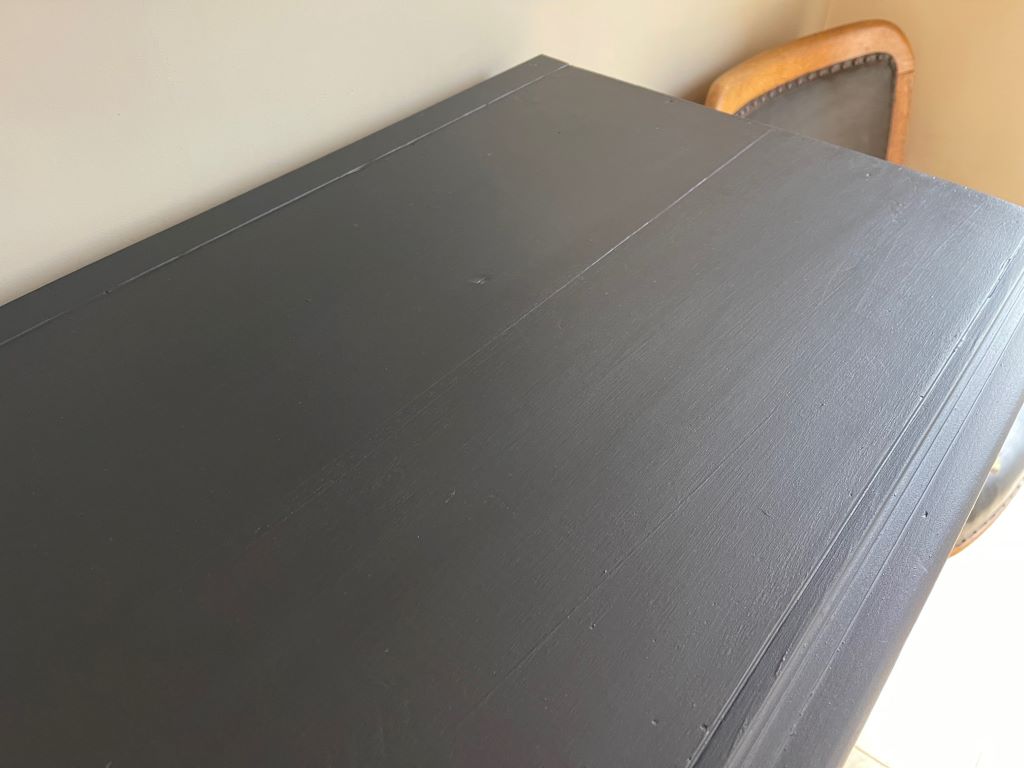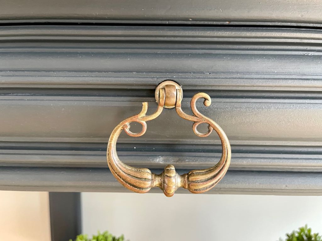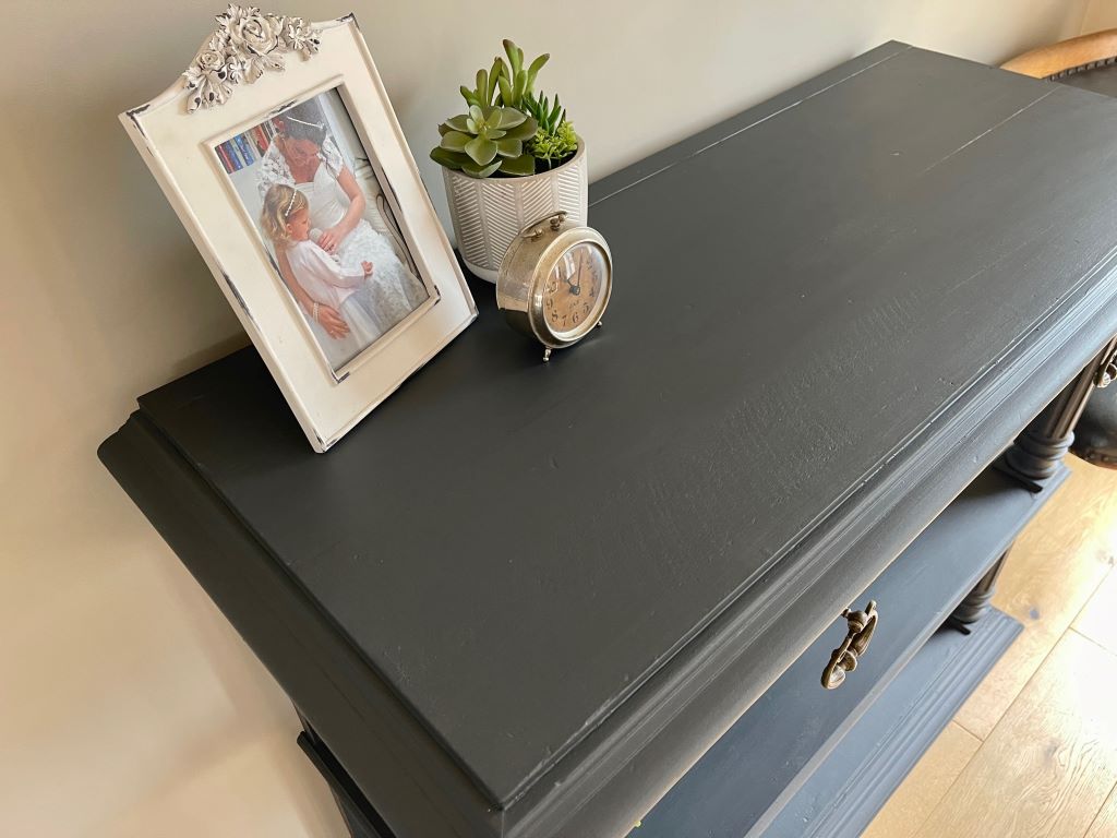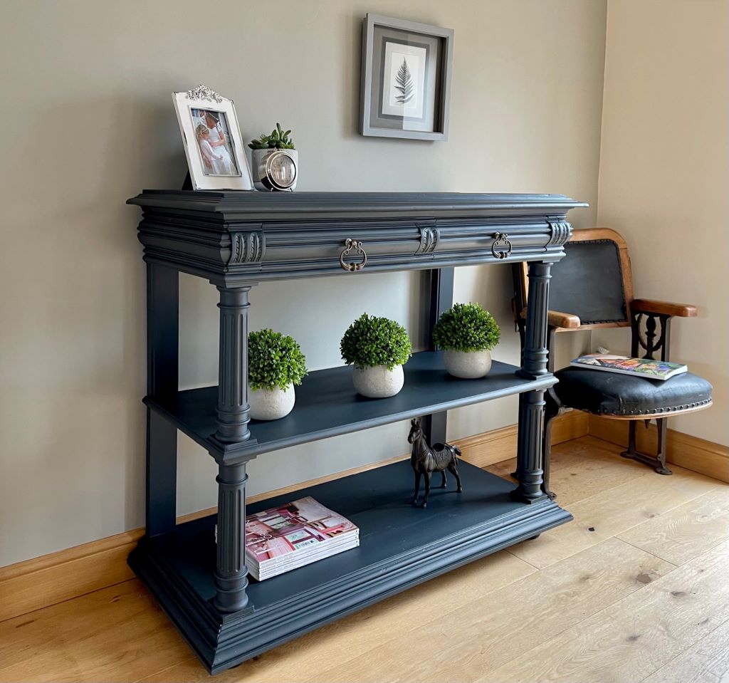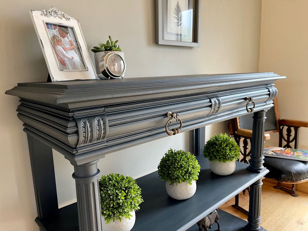This console is an elegant solid wood console table produced circa 1930’s to 1940’s.  It has some very decorative features with carved and fluted columns to the front and decorative carvings on the top framework. It retains its original brass drawer handles (one very small scroll section missing). The piece has a nice quality feel and weight to it, solid and sturdy, not flimsy in any way. It came to us in a tired state of dull dark brown. We fully stripped the whole piece and refinished it in Farrow & Ball Railings.  A clear coat of Annie Sloan chalk paint wax has also been applied, to seal against water and spills.
