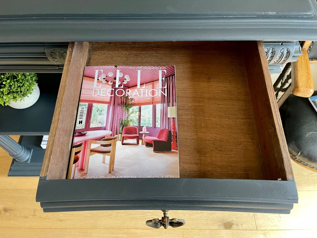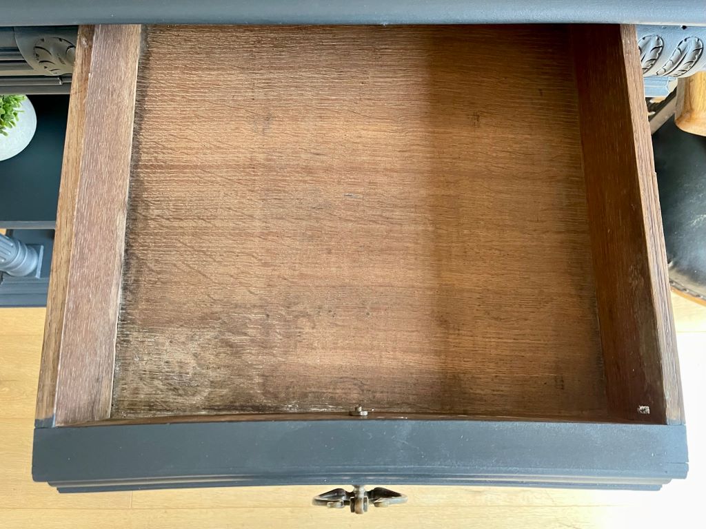 We think it now offers a classic and chic console table with plenty of storage on its top, shelves and two generous drawers. Both drawers are clean and run easily. Reclaimed and refinished furniture is so much better for the planet too!