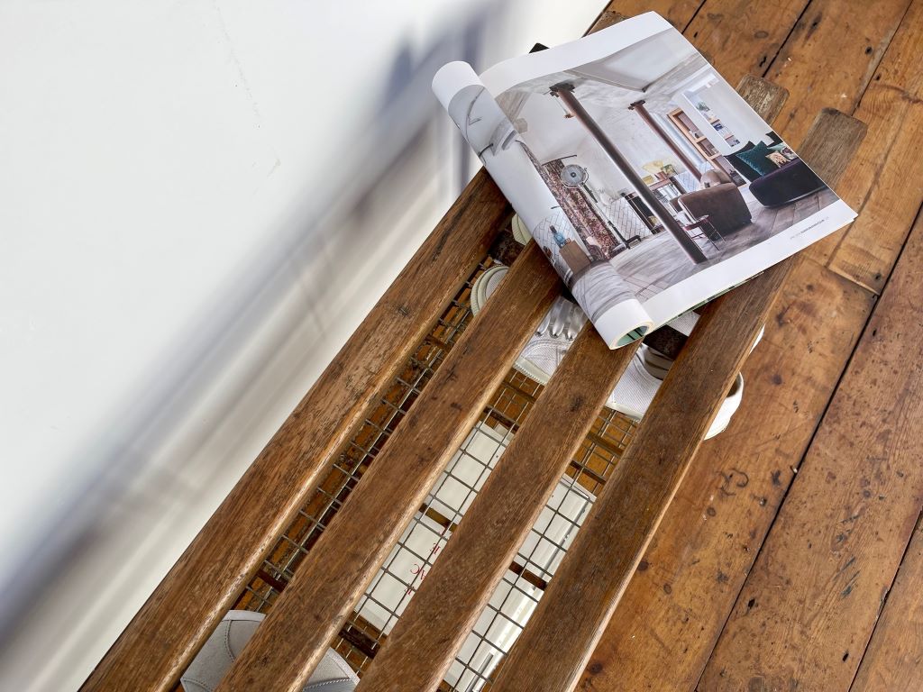 This gym/ changing bench dates to the early 1950’s and came to us straight from a school near Wimborne in Dorset. It is in completely original condition; fully stable with no wobbles and perfectly aged wear on the baskets, legs and slatted top. Constructed from steel box section and solid oak slats it has a really good solid weight and looks fantastic We just gave it a good clean, and lightly waxed the oak with a clear wax for replenishment and a refresh.