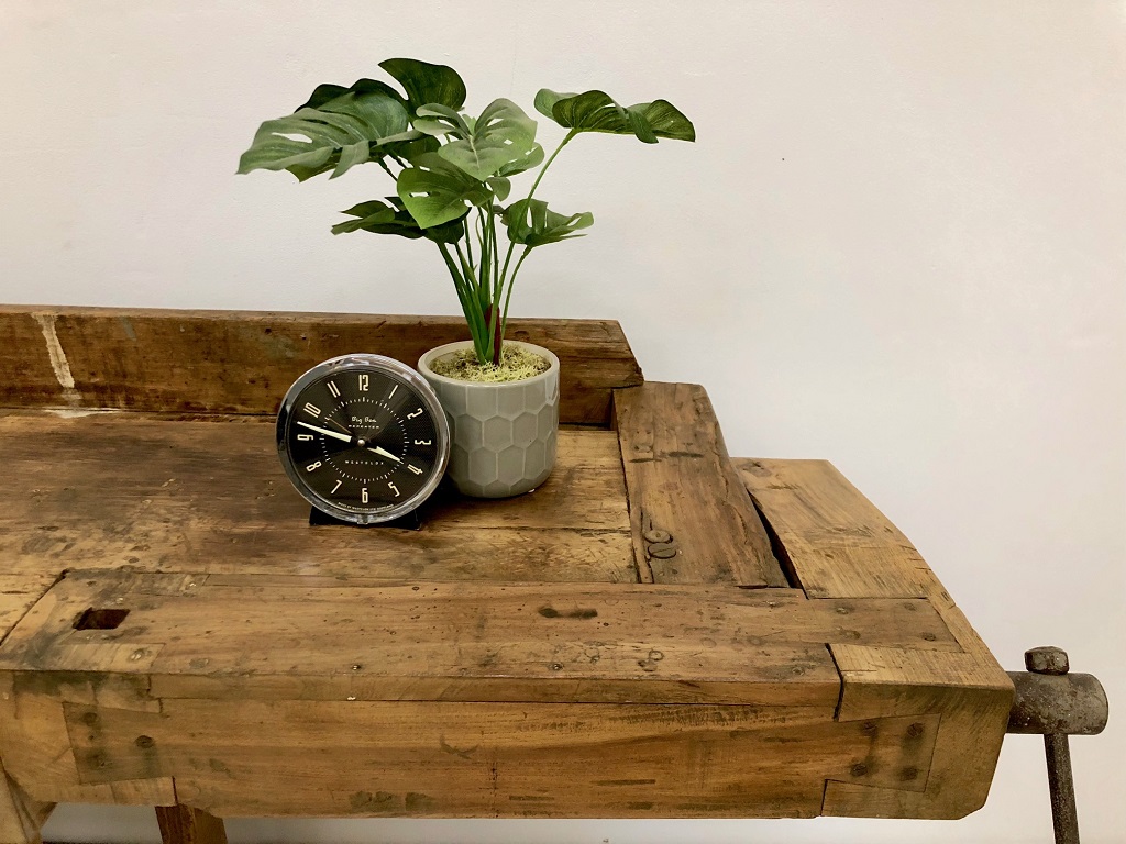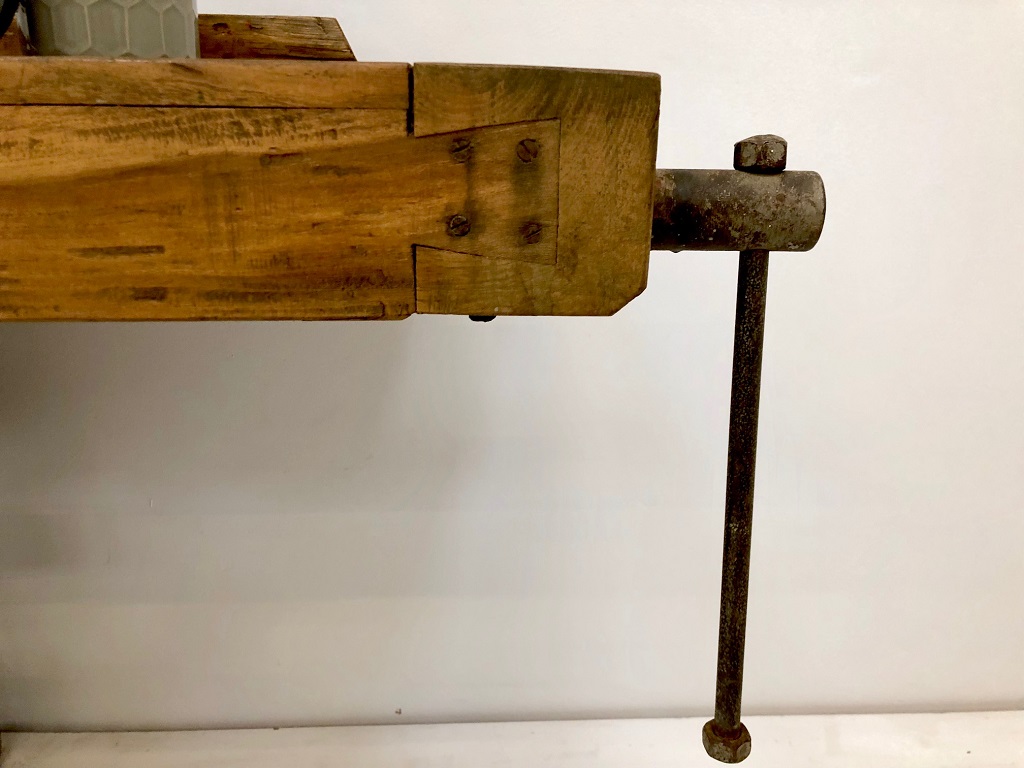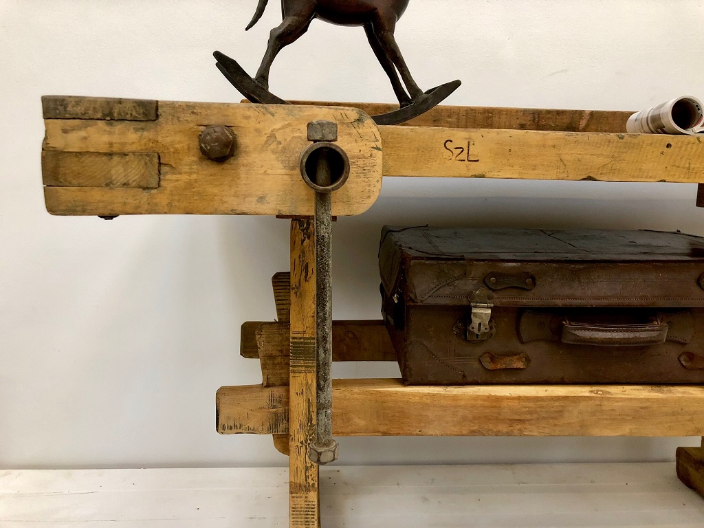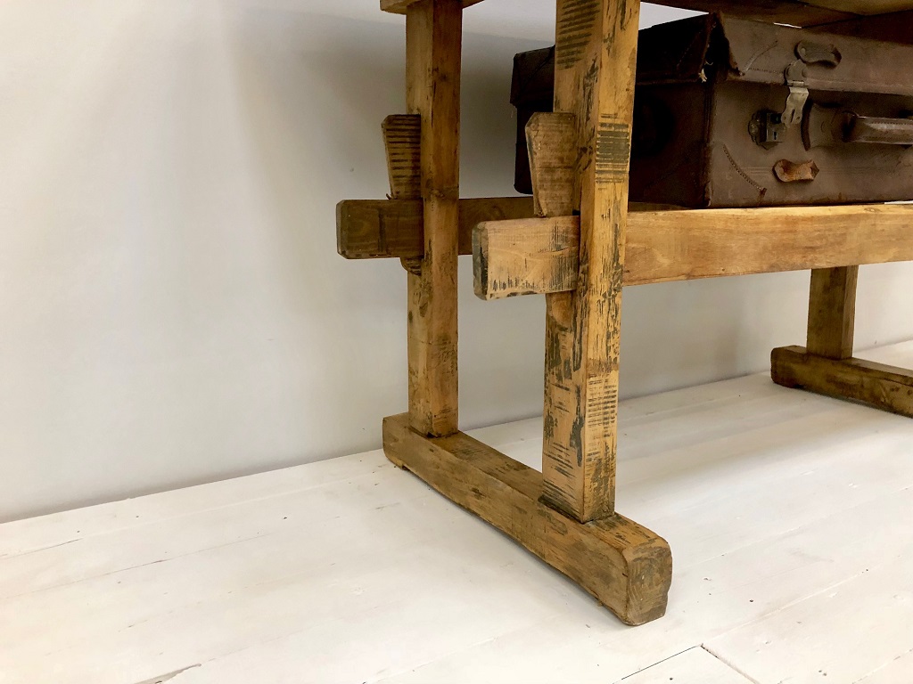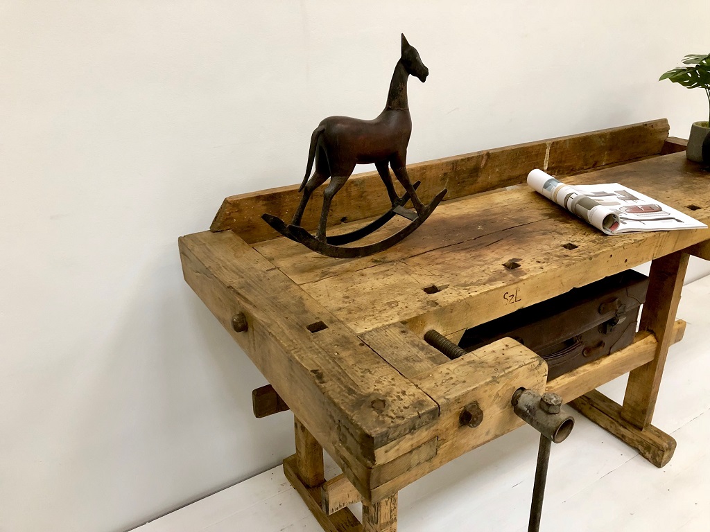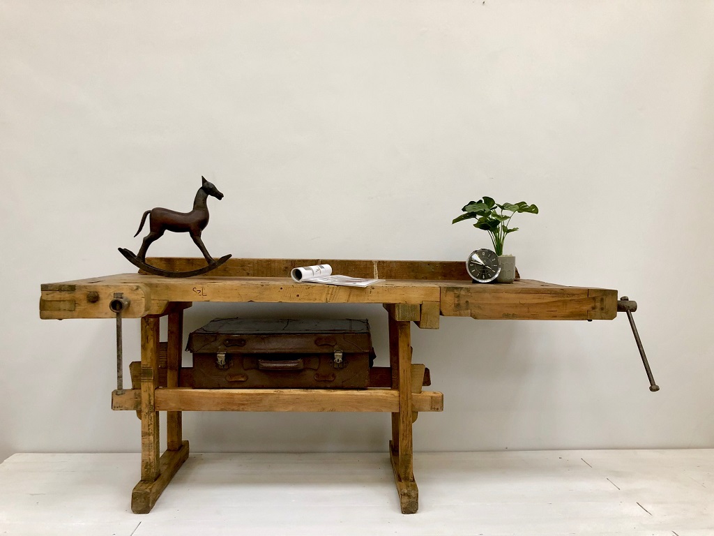 An original antique Carpenter’s Bench, dating from around 1920-30. An original rustic piece with colour and patina.  Totally original condition with some beautiful solid carpentry to the joint work. Original vices still fully operational.