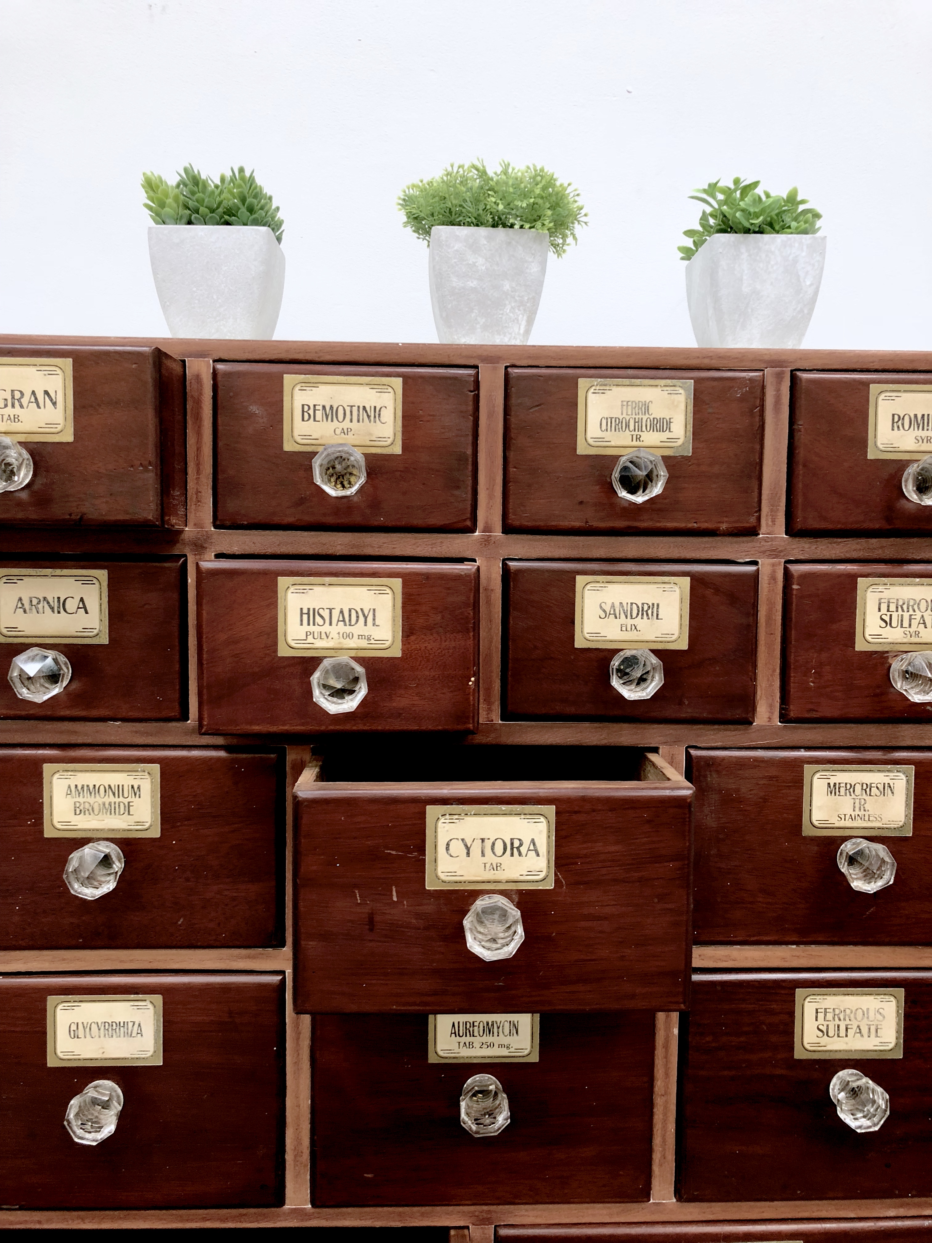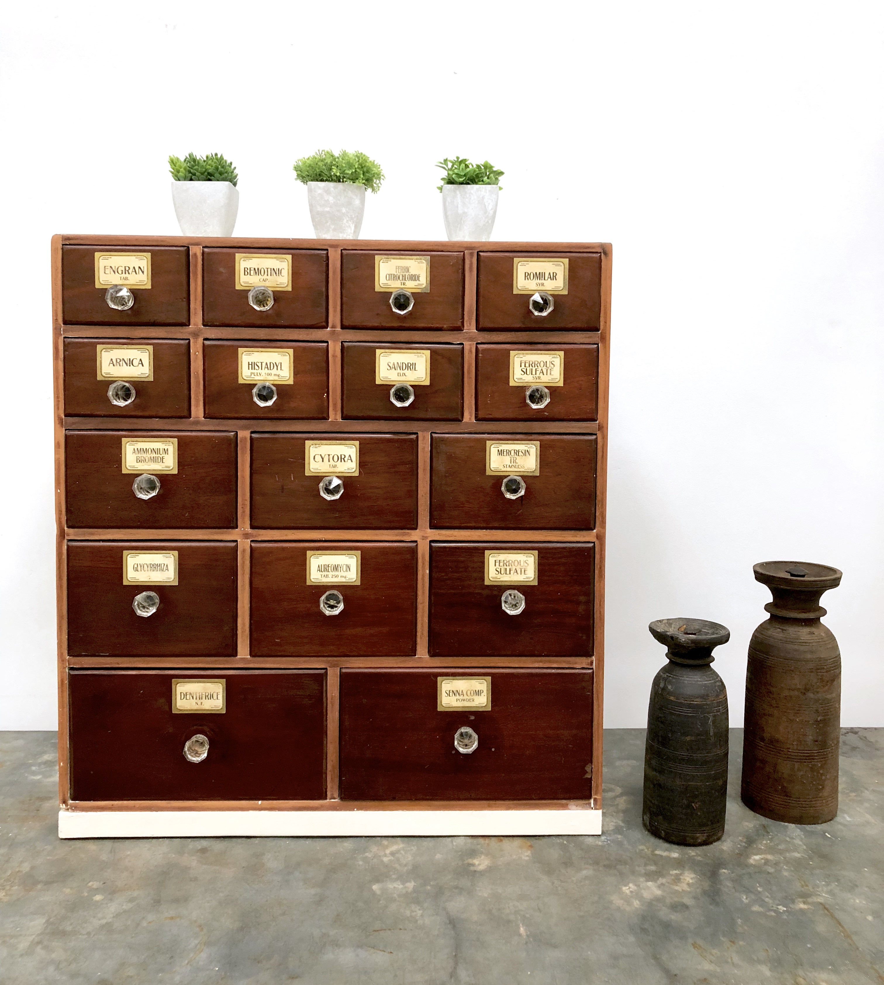 A simply stunning apothecary cabinet dating from circa 1920-30. Made from mahogany, the cabinet has been stripped back, waxed to the front and painted to the sides and top in Farrow & Ball Shaded White. 16 Mahogany Drawers in total graduating from the top two rows to the two large drawers at the bottom. All labels and handles are original and in amazing condition. Very usable, extremely stylish and highly desirable.