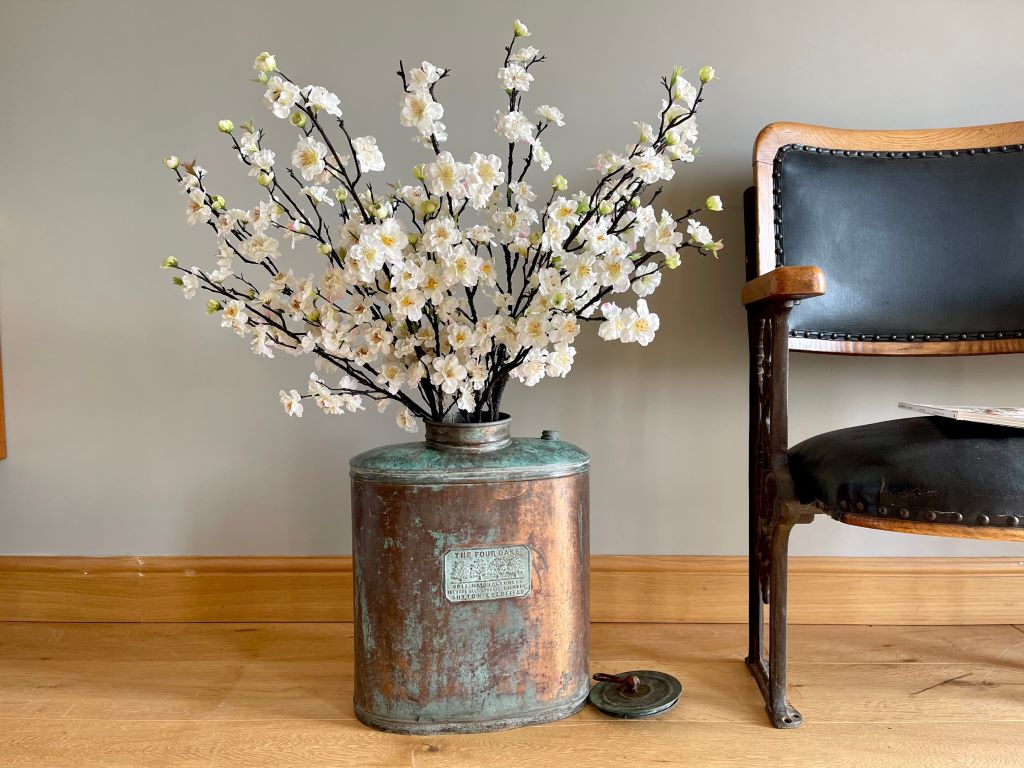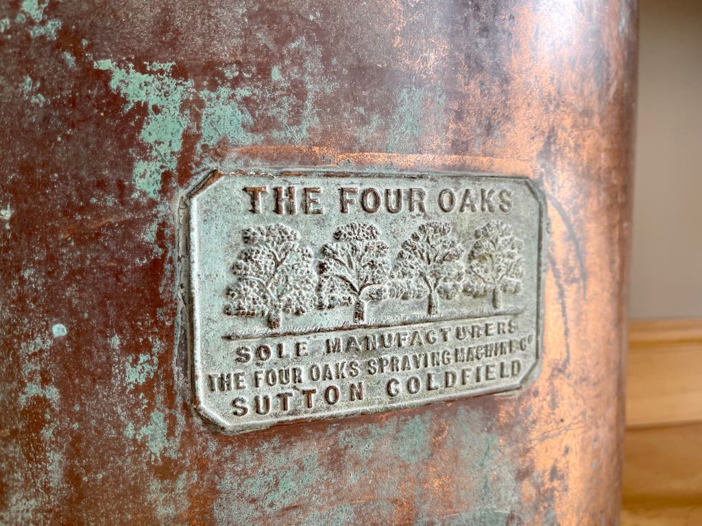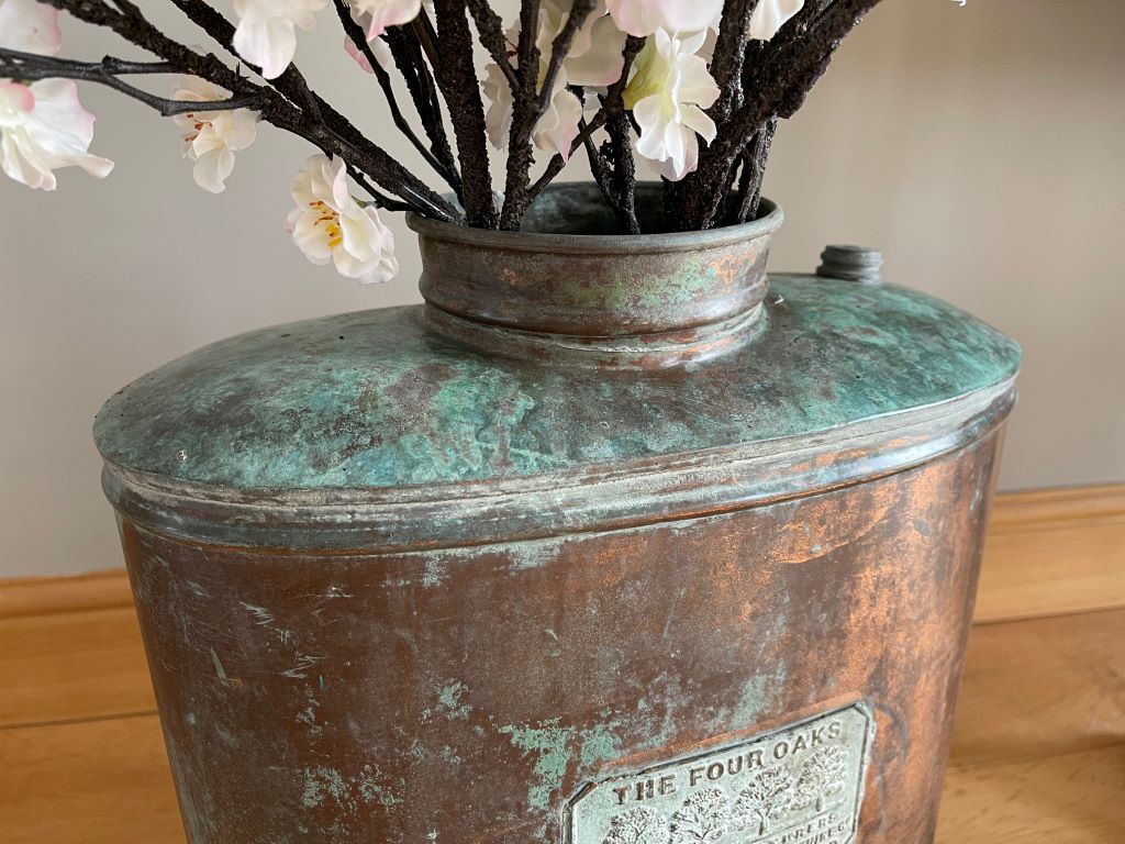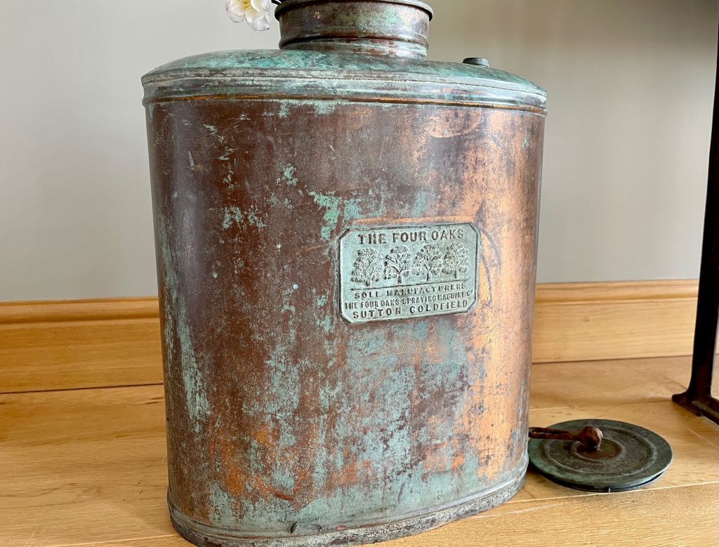 A beautiful early 20th Century traditional crop sprayer, produced by The Four Oaks in Sutton Coldfield (circa 1930’s). We adore the perfectly aged copper displaying the beautiful verdi gris colours and patina. The piece has been fully cleaned and clear waxed for protection and shine. It now makes a different and very attractive storage vessel for dried flowers, pampas grass, driftwood etc. or as an umbrella stand. However you choose to style. The flowers in the photographs are not included within the sale price. It comes with its original lid.