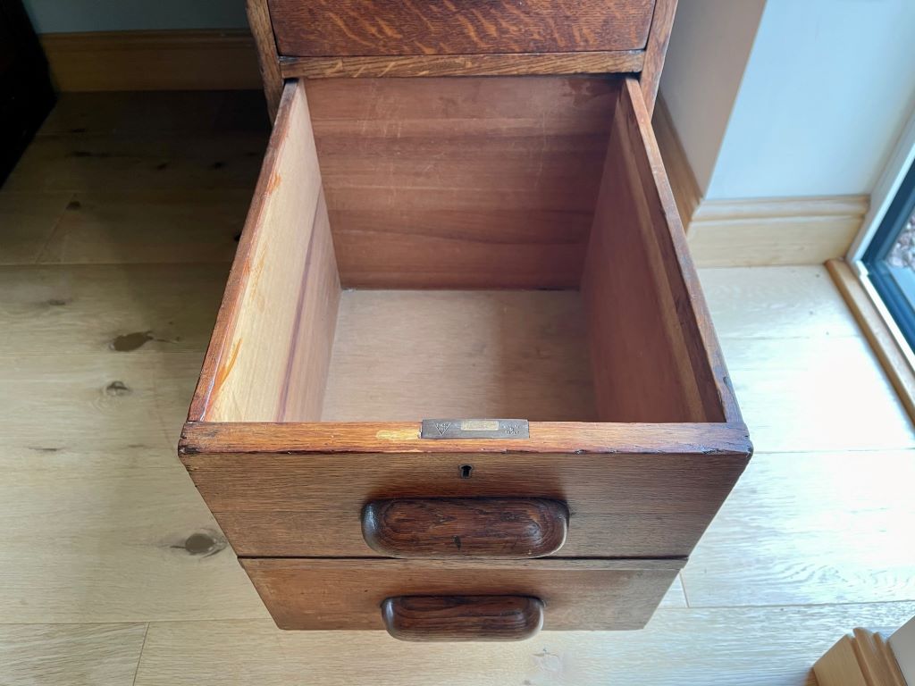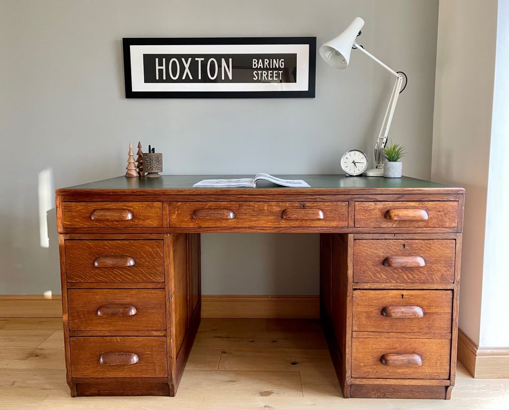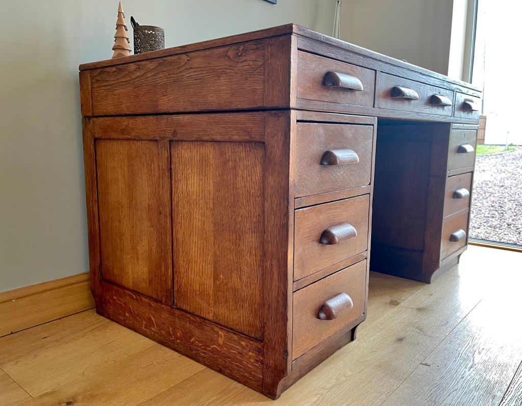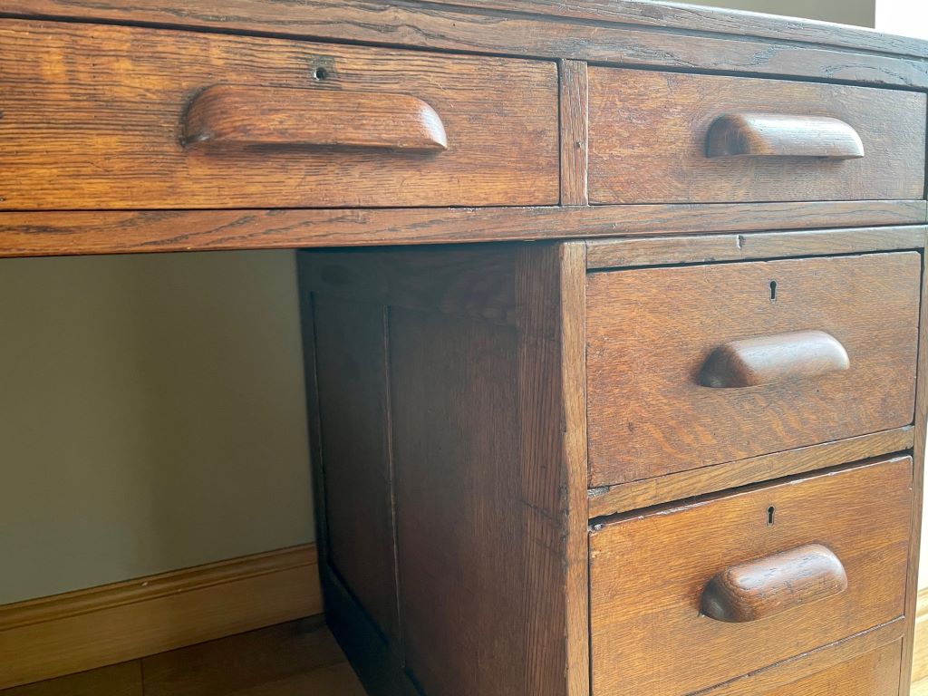 A very attractive and stylish double pedestal desk dating from around the late 1920’s to the 1930’s. These desks are often referred to as teachers desks. This one comes in quality oak with a beautifully coloured aged patina. The top is also original and in excellent condition for the age of the piece. The desk also has the advantage of easily splitting down in to three parts for ease of transportation and positioning in to the room of your choice.  The top lifts off in one piece to reveal the two pedestals separately. It is a great size for home with lots of workspace and plenty of very useful storage. All drawers are clean and run smoothly. The bottom right hand drawer is a double height filing type drawer.