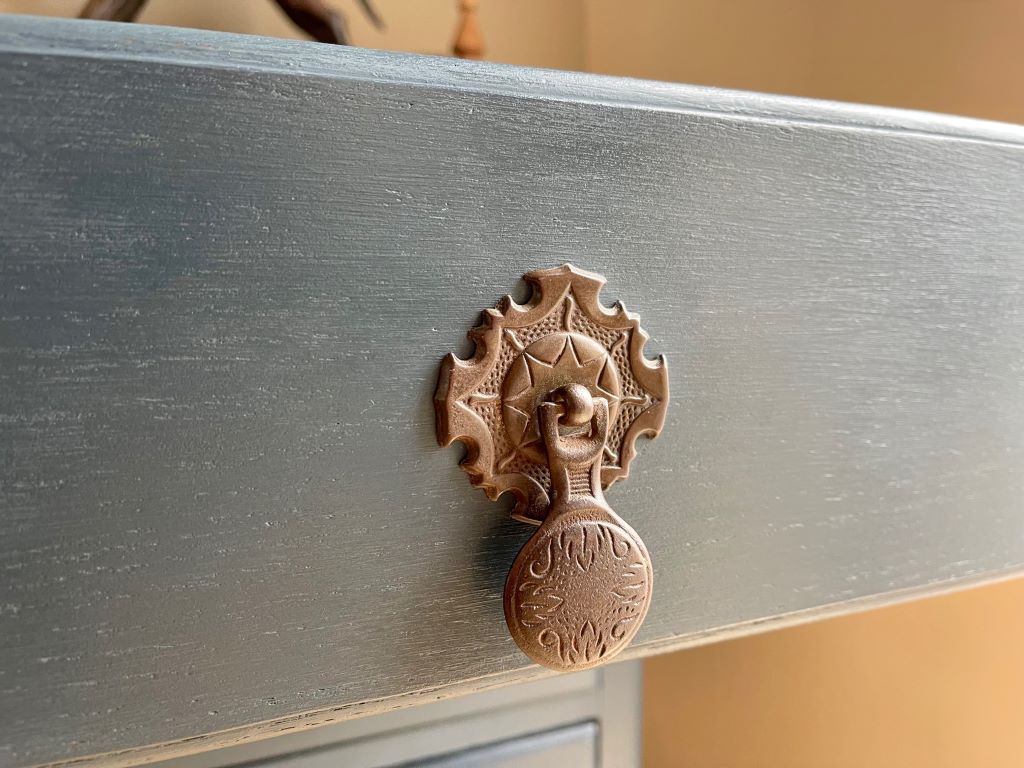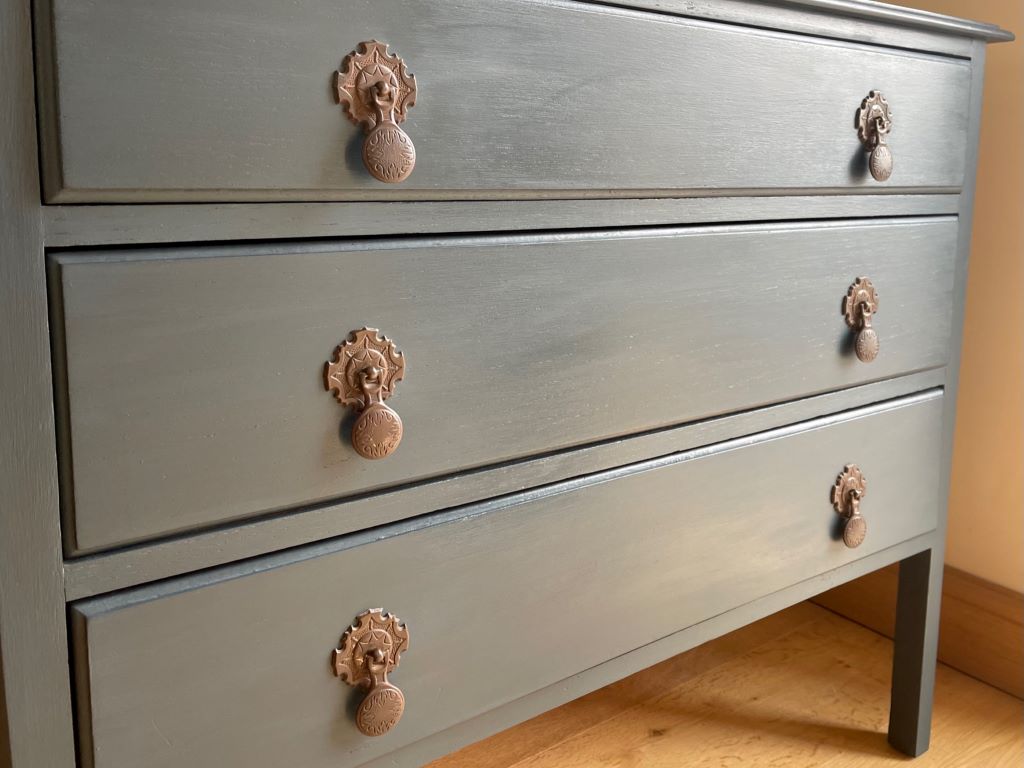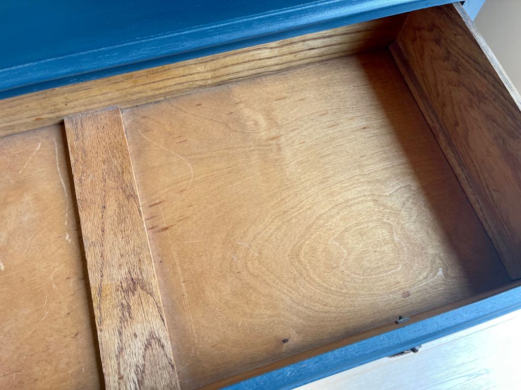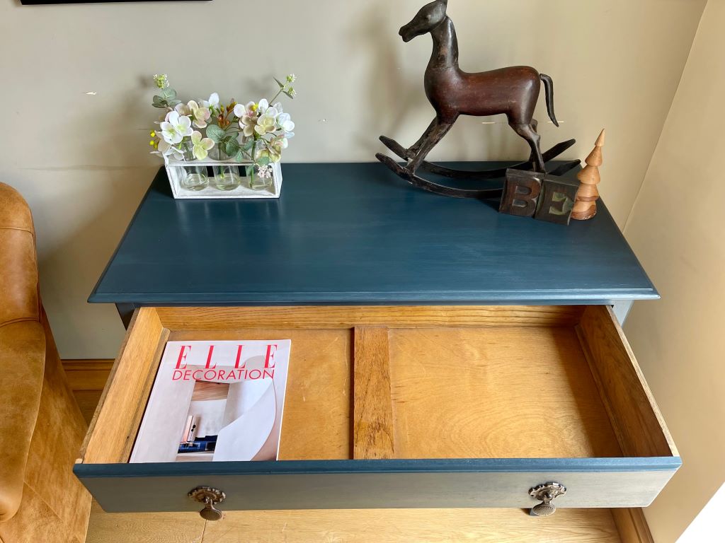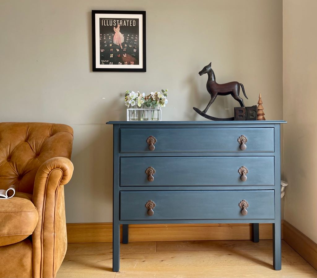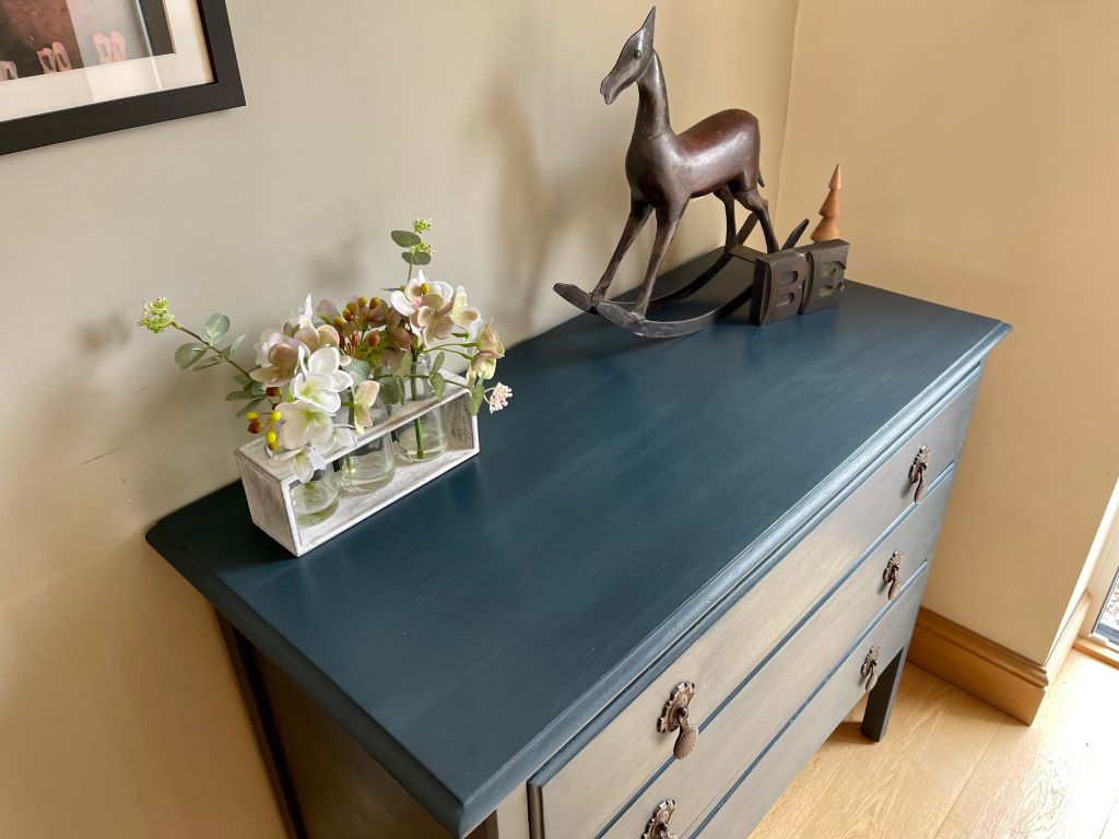 This is an original antique chest of drawers originally produced circa early 1900’s. It came to us in a tired state of dull dark brown and in need of restoration. We fully stripped the whole piece and refinished it in Farrow & Ball Hague Blue Estate Emulsion for a contemporary colour pop and very appealing matt finish. A clear coat of Annie Sloan chalk paint wax has also been applied, to seal against water and spills. The chest has some nice weight to it, reflecting some quality of handmade construction. Not a lightweight flimsy piece. We love the size and clean lines, together with the gorgeous original drop handles for detail.