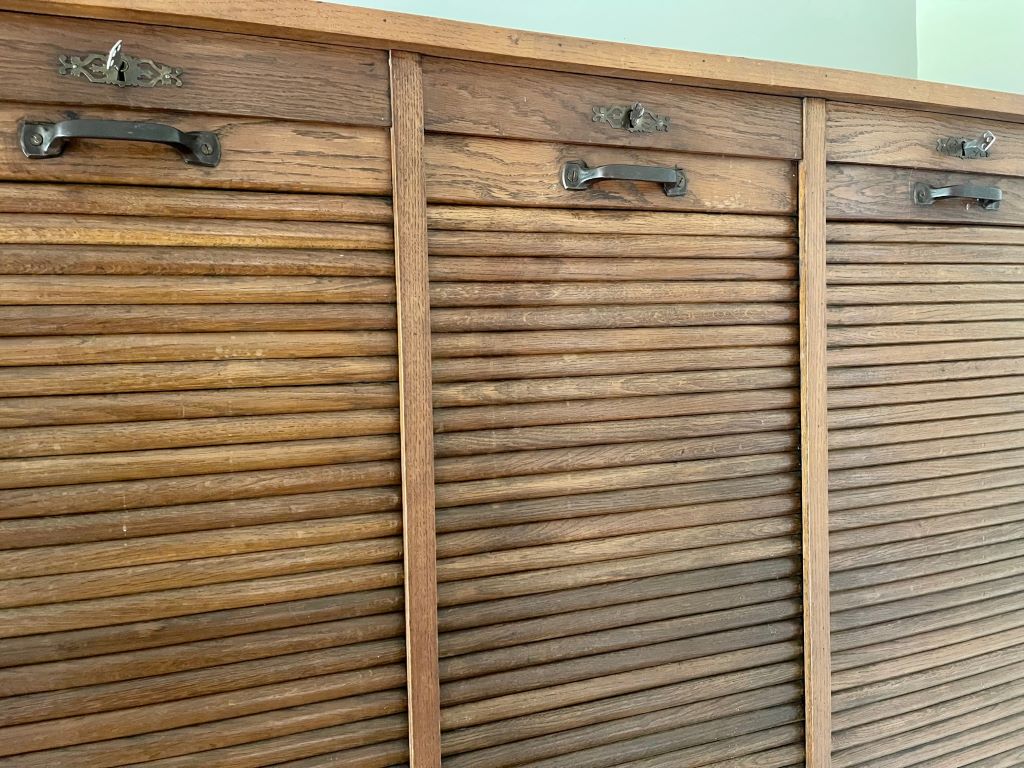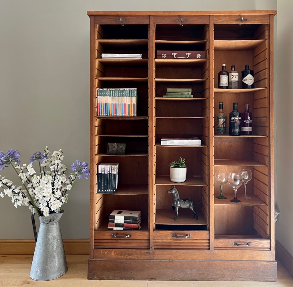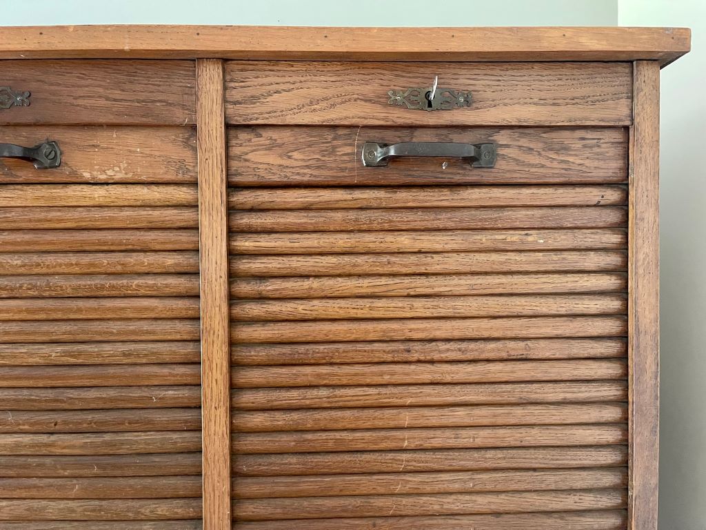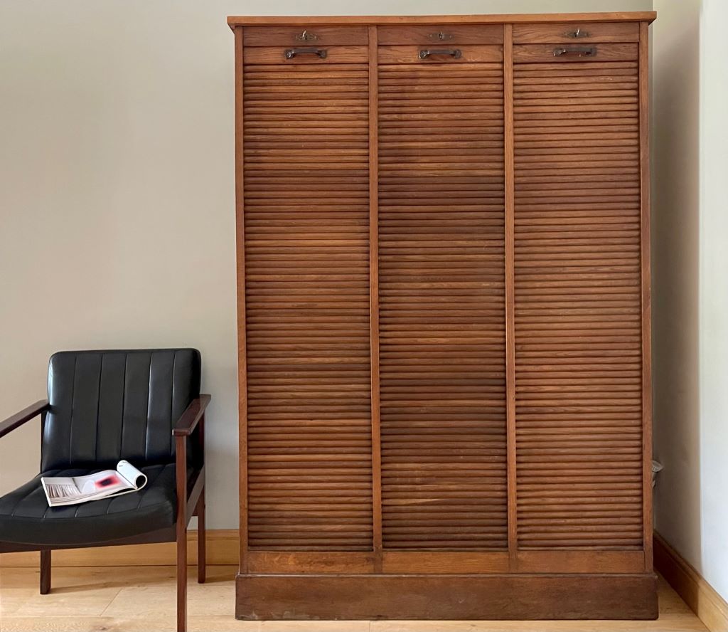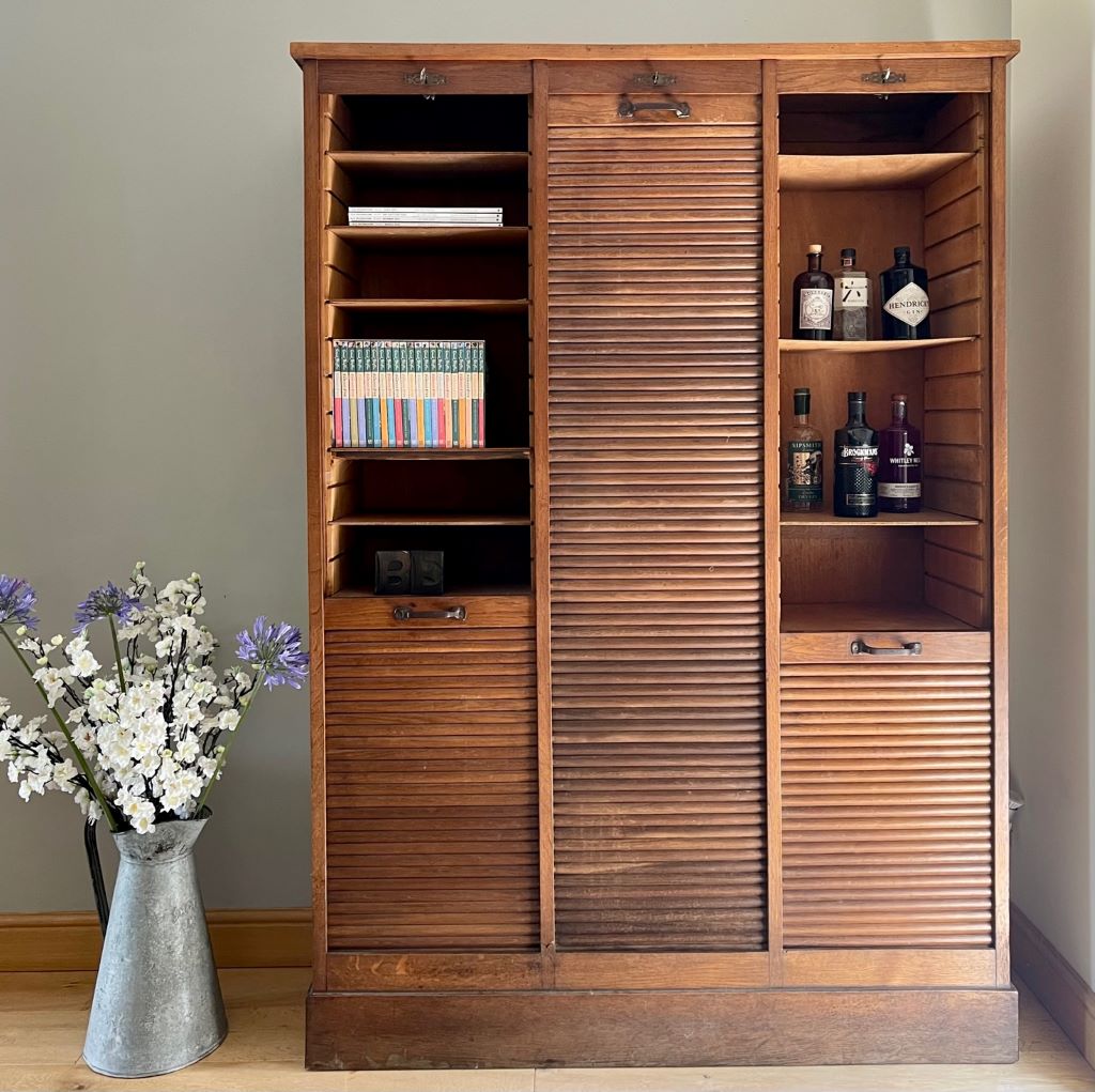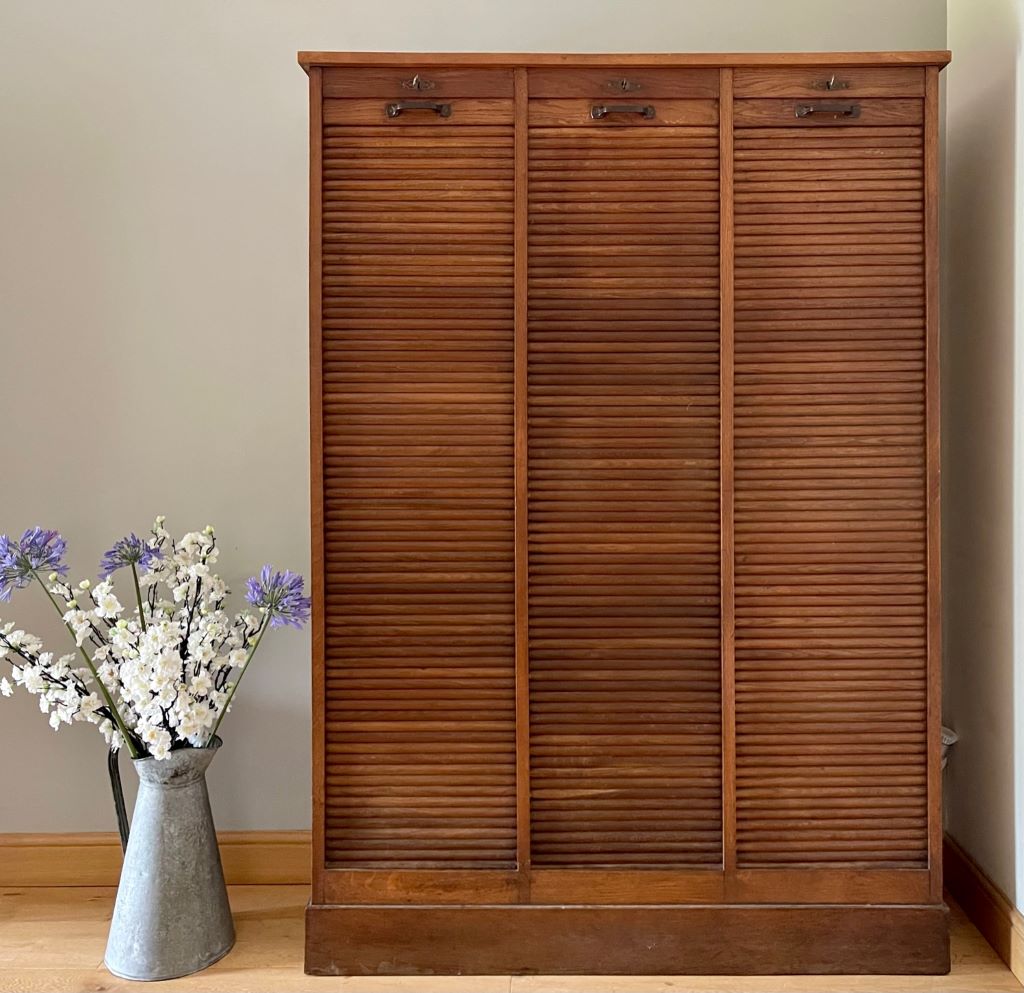 An exceptional antique French triple door tambour cabinet in Oak, dating from the early part of the 20th Century (c. mid 1930’s to late 1940’s). It comes with original handles, three working locks and three keys, together with lots of removable and adjustable internal shelves. We adore the colour, size and condition on this cabinet. The size is very impressive and offers a true statement piece. There is lots of flexible storage by removing shelves, changing the spacing between them, adding new ones etc. You can get the configuration of shelves exactly as you need them, depending what you would like to use it for. All three doors run exactly as they should and the locks work well (spring loaded release).