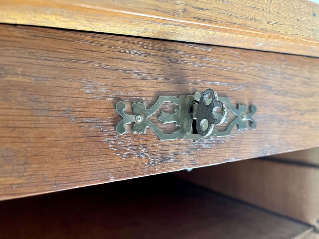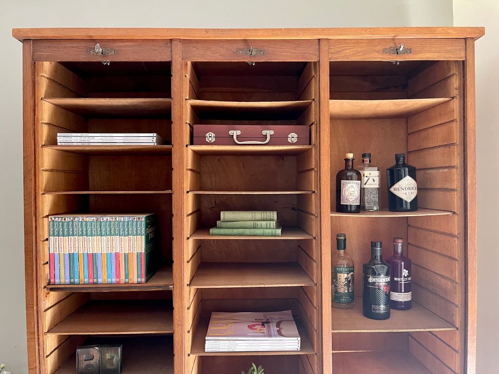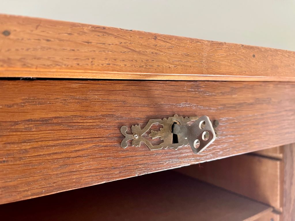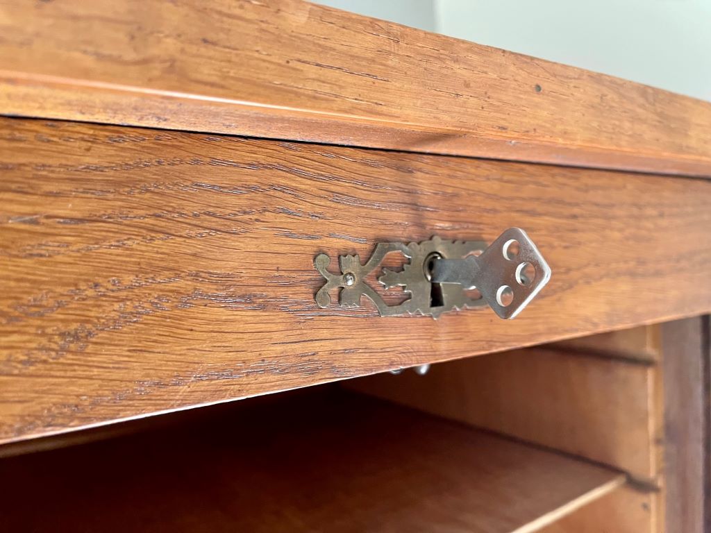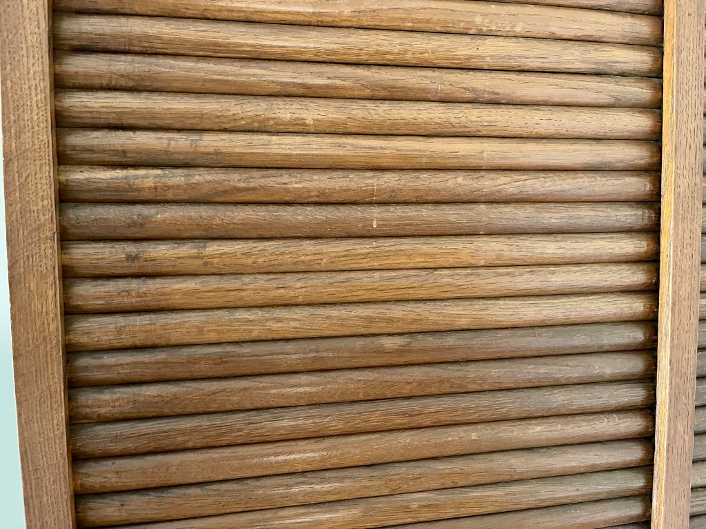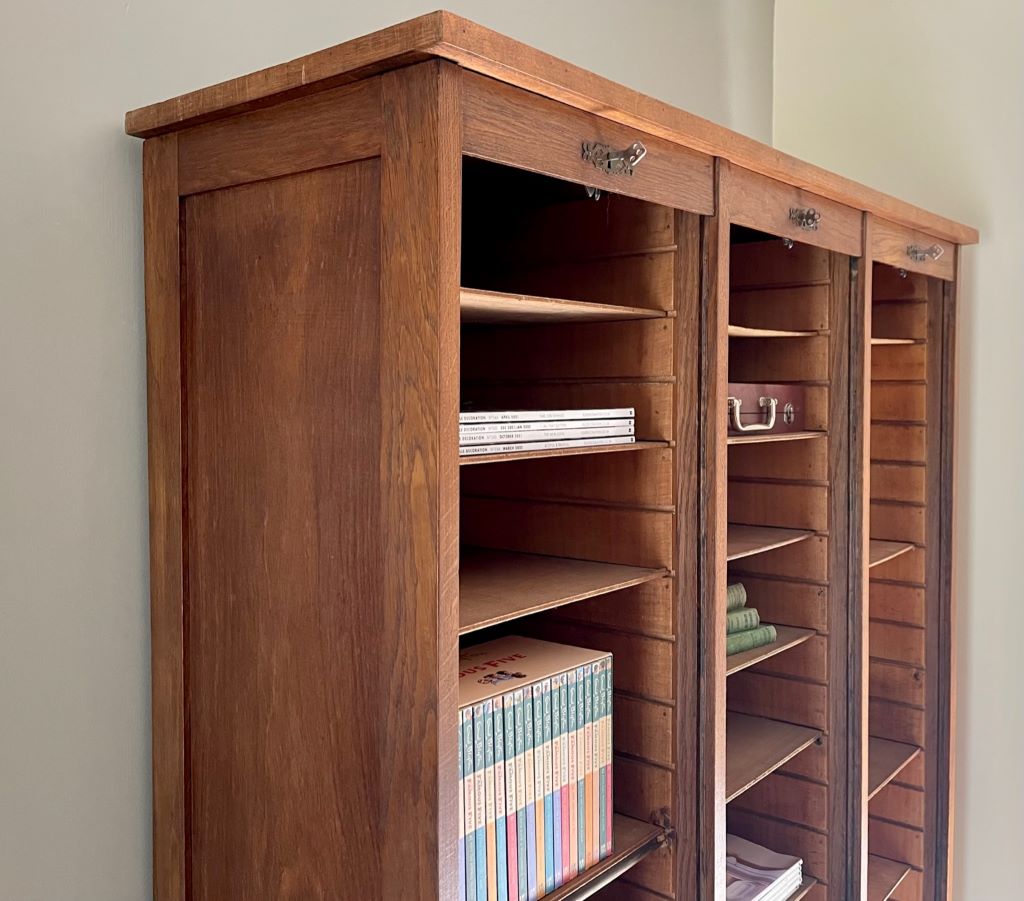 An exceptional antique French triple door tambour cabinet in Oak, dating from the early part of the 20th Century (c. mid 1930’s to late 1940’s). It comes with original handles, three working locks and three keys, together with lots of removable and adjustable internal shelves. We adore the colour, size and condition on this cabinet. The size is very impressive and offers a true statement piece. There is lots of flexible storage by removing shelves, changing the spacing between them, adding new ones etc. You can get the configuration of shelves exactly as you need them, depending what you would like to use it for. All three doors run exactly as they should and the locks work well (spring loaded release).