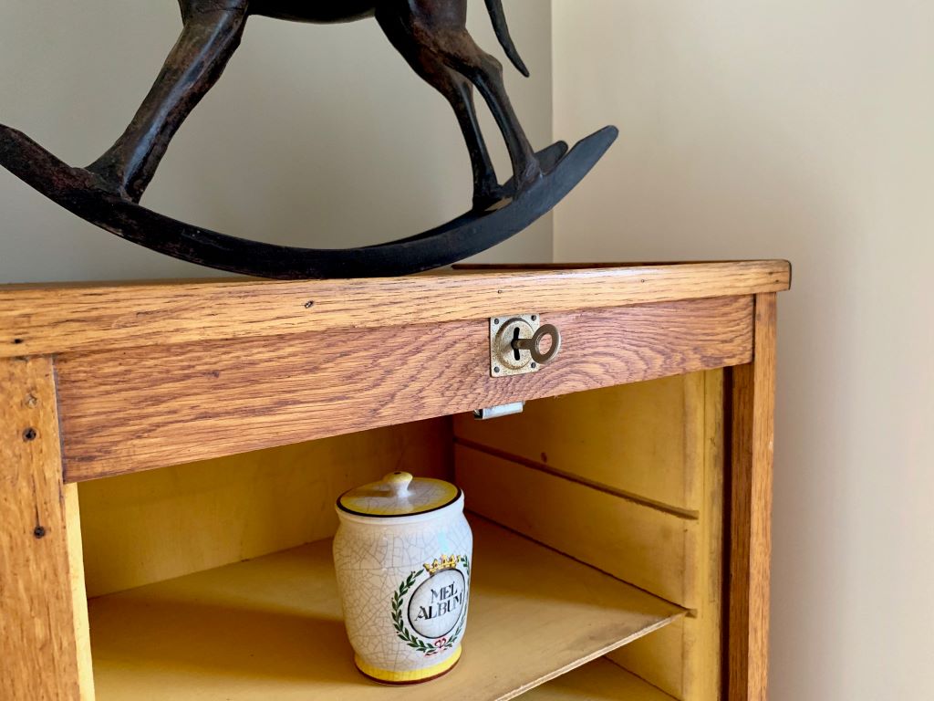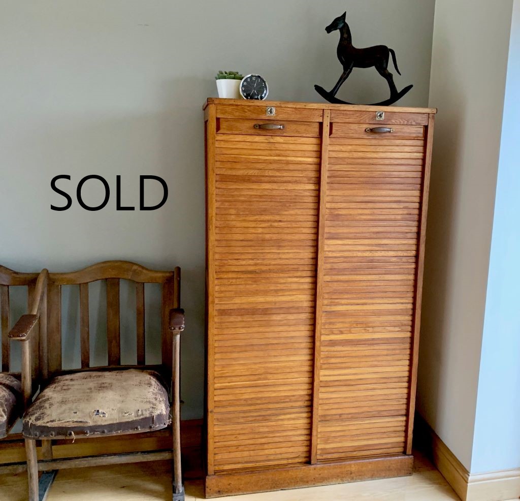 A very nice Antique German double tambour cabinet in Oak, dating from the early 20th Century (c. 1920-30).  It comes with original handles, locks and two keys, together with lots of removable and adjustable internal shelves. The colour and condition of the oak are beautiful and the size is perfect for the home. Not too large to over power but offering lots of storage and having a real presence.
