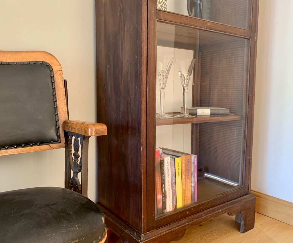 A gorgeous early 20th Century glazed dresser / cabinet in oak. It dates from around the early 1930’s and has completely original cabinetry, glass, lock and key. We added a new solid wooden clad back panel and painted it white. This has brought the piece right on trend. We think it would make a fantastic and individual kitchen / diner cabinet. However, it could also be a bathroom cabinet, bookcase, display cabinet etc.