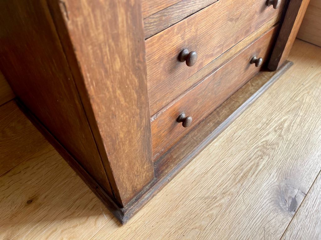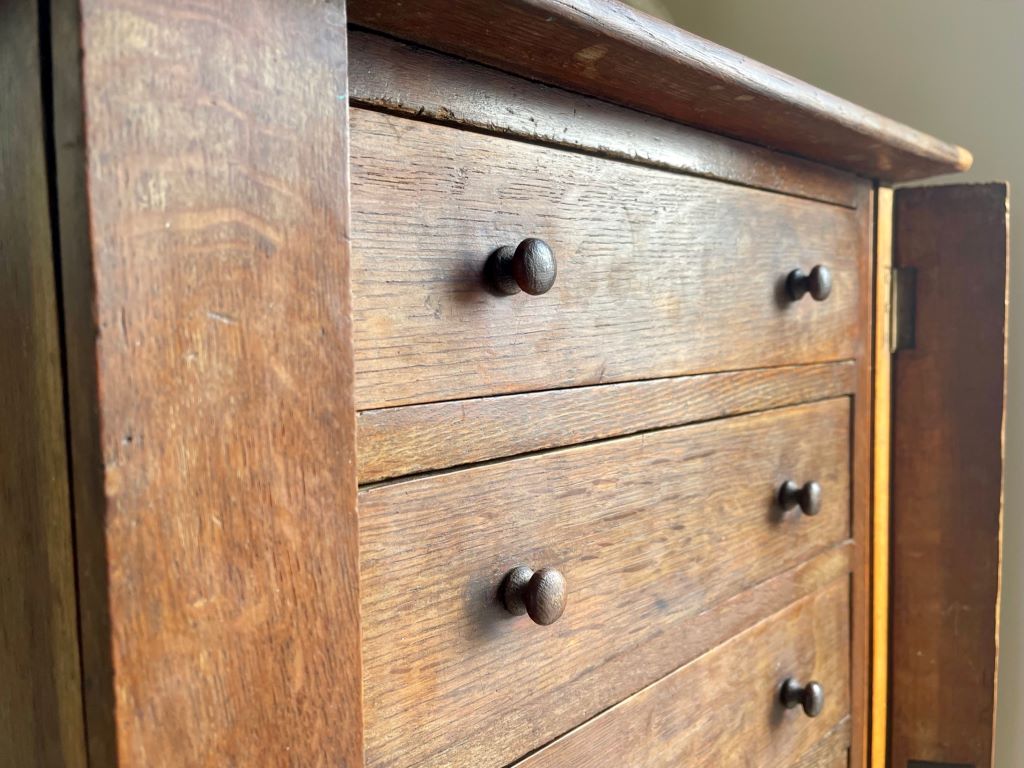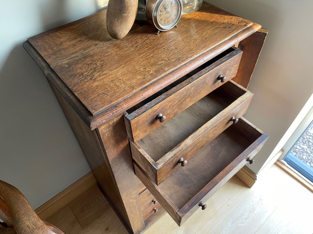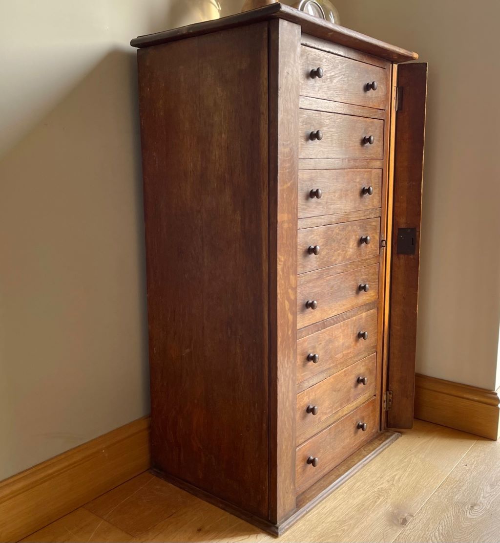 A beautiful early 20th Century Wellington chest of drawers in oak. They date from around the 1920’s to 1930 and are presented in beautiful quality radial cut oak throughout. All eight drawers run smoothly and are hand made with pin dovetail joints and their original oak turned button handles. The colour and grain of the oak are amazing. Such a beautiful piece perfect for storing whatever you treasure – sewing, crafts, magazines, collectables etc. It could also be a superb tall lamp or side table.