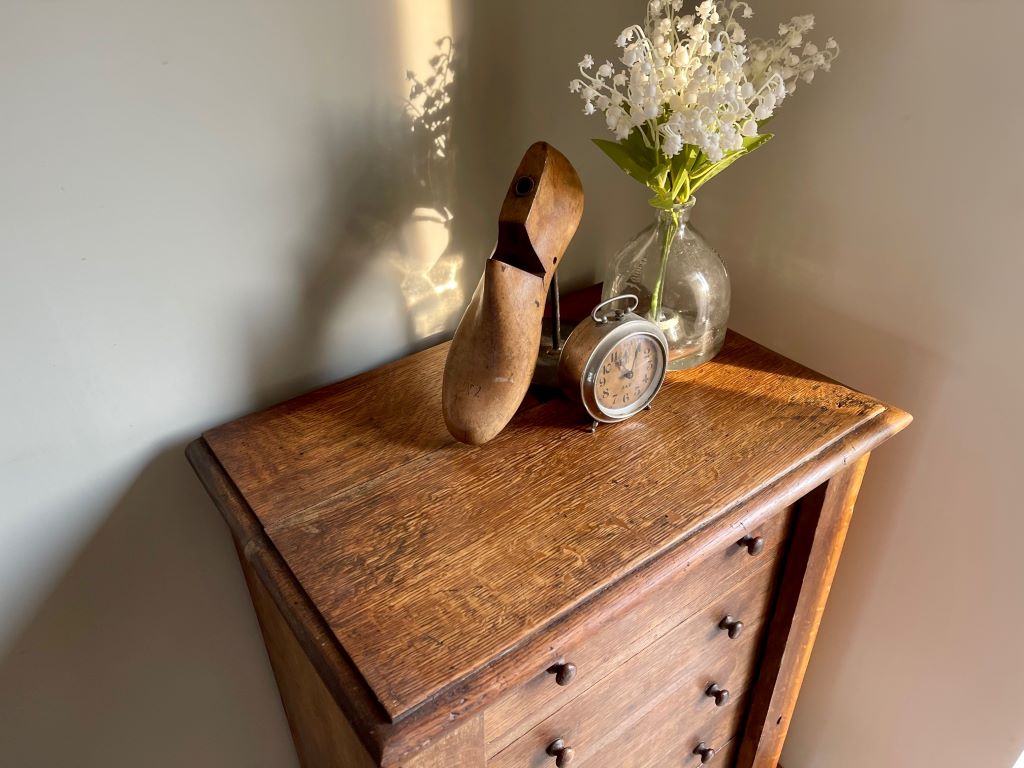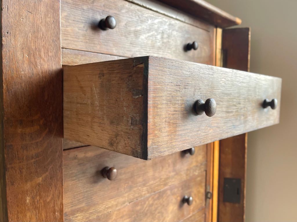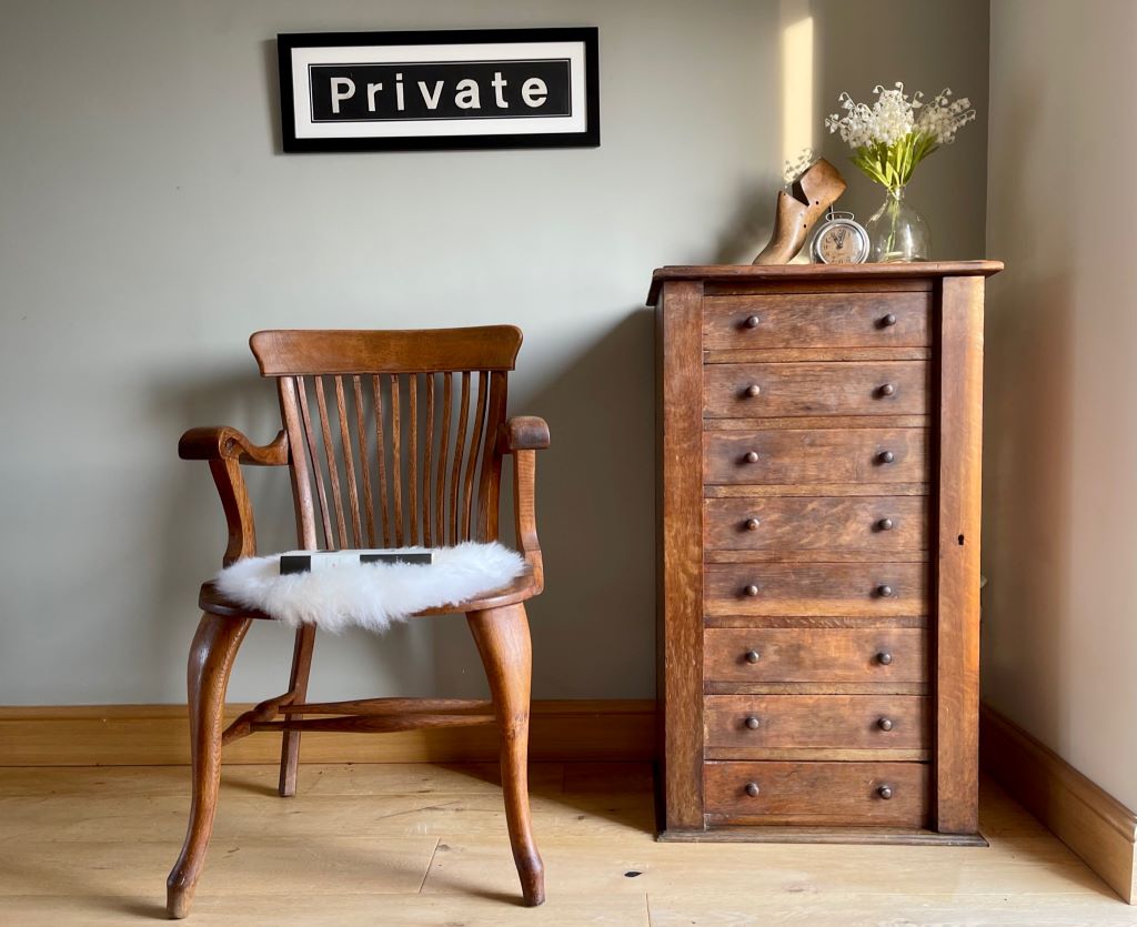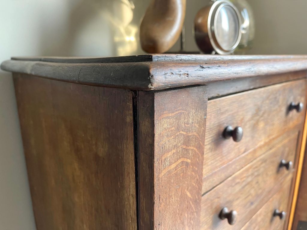 A beautiful early 20th Century Wellington chest of drawers in oak. They date from around the 1920’s to 1930 and are presented in beautiful quality radial cut oak throughout. All eight drawers run smoothly and are hand made with pin dovetail joints and their original oak turned button handles. The colour and grain of the oak are amazing. Such a beautiful piece perfect for storing whatever you treasure – sewing, crafts, magazines, collectables etc. It could also be a superb tall lamp or side table.