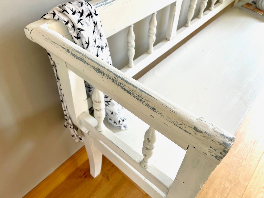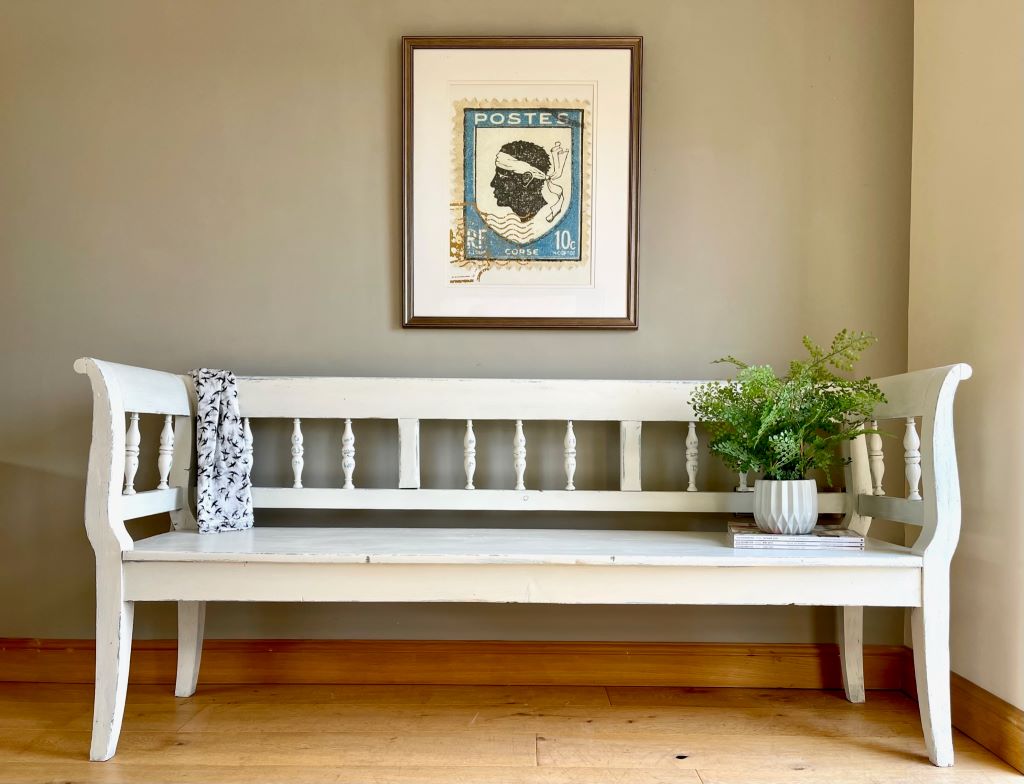 An original early 20th Century settle bench in pine. We stripped the piece of its later brown paint. It was then sanded, made structurally solid and fully repainted. It’s first coat of primer was followed by Farrow & Ball Manor House grey, then Gustavian Blue and finally two top coats of School House White. We then distressed the bench in the natural wear points to bring that fantastic mix of gorgeous colours together. Can seat 3 people very comfortably. A fantastic alternative to chairs at the main dining table or a superb hall bench.