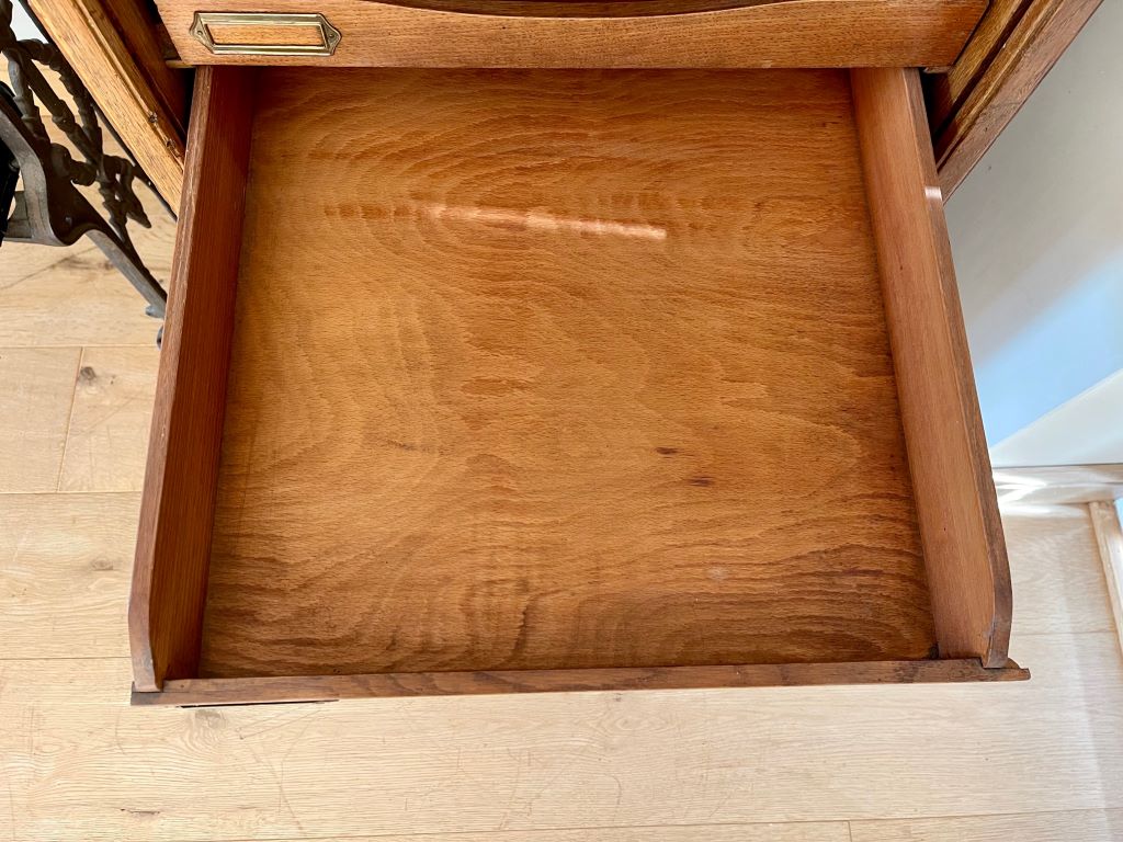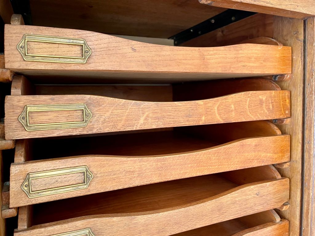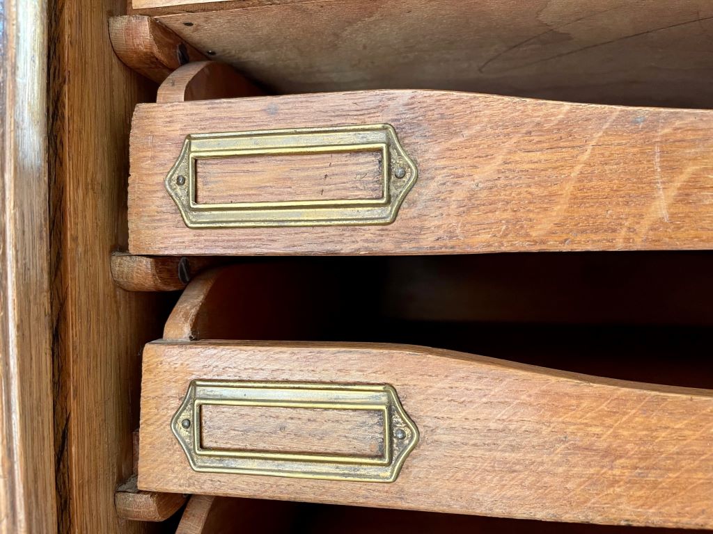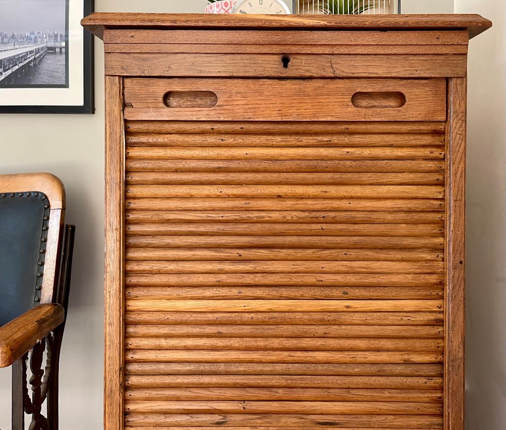 A very attractive and beautifully coloured single tambour cabinet in Oak, dating from the early 20th Century (c. 1930’s). The cabinet comes with its original pull out haberdashery type shelves and brass label holders, which are just gorgeous and rare to find in these cabinets. All of the trays are easily removable, or height adjustable to accommodate whatever you need to store. We love the colour, size and quality of oak on this cabinet. The size is perfect for the home and could be used as a cabinet for drinks, books, magazines, towels, CD’s etc etc.
