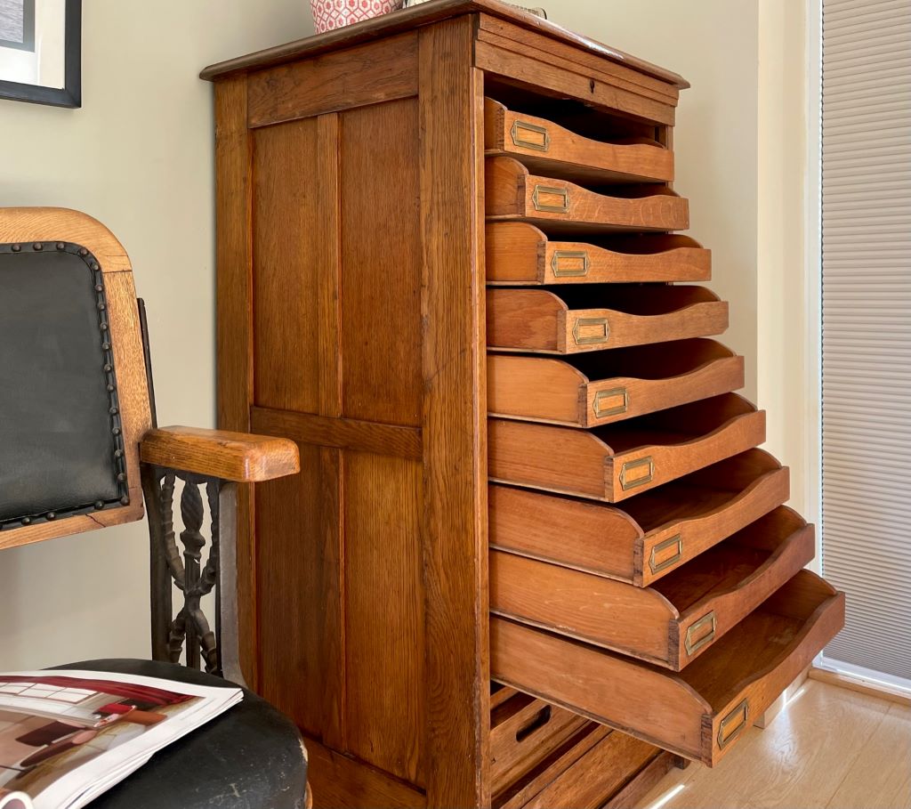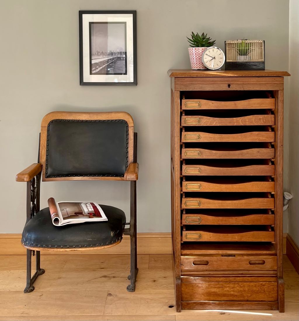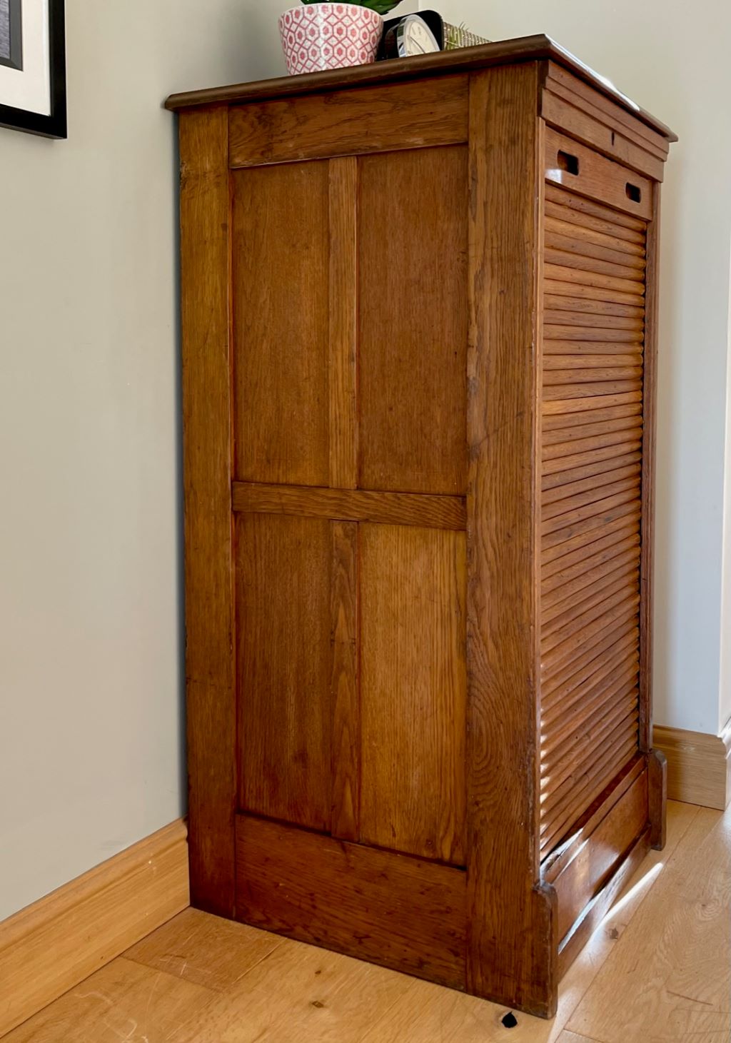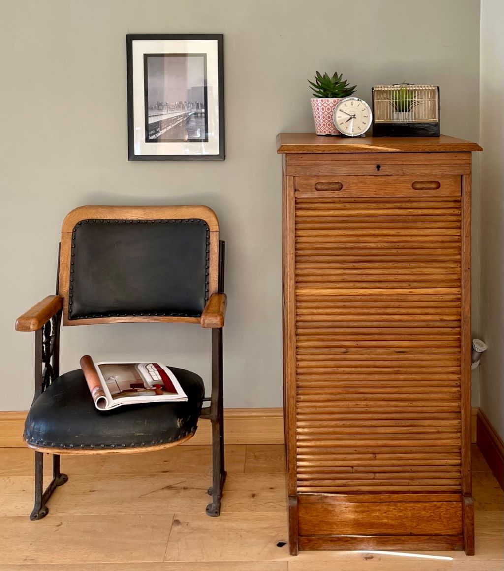 A very attractive and beautifully coloured single tambour cabinet in Oak, dating from the early 20th Century (c. 1930’s). The cabinet comes with its original pull out haberdashery type shelves and brass label holders, which are just gorgeous and rare to find in these cabinets. All of the trays are easily removable, or height adjustable to accommodate whatever you need to store. We love the colour, size and quality of oak on this cabinet. The size is perfect for the home and could be used as a cabinet for drinks, books, magazines, towels, CD’s etc etc.