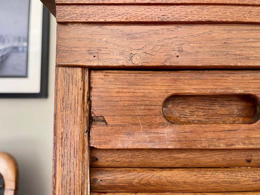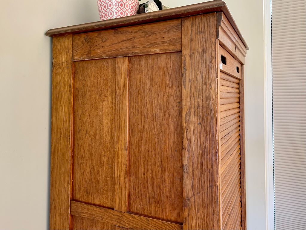 The carcass does have a couple of cosmetic ‘dings’ as can be expected with the age of the piece. The door has two old split slats (photographed) and there is no lock or key for the door. The door does close and stay close without the latch/ lock mechanism. Pleas see all photographs for the condition and just ask if you would like any further details or photographs.