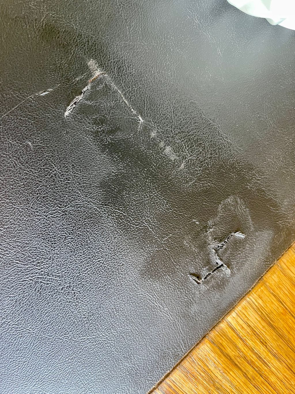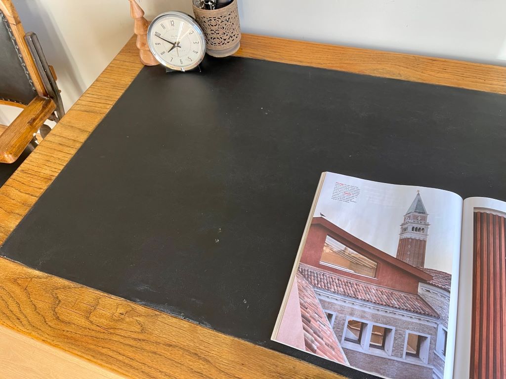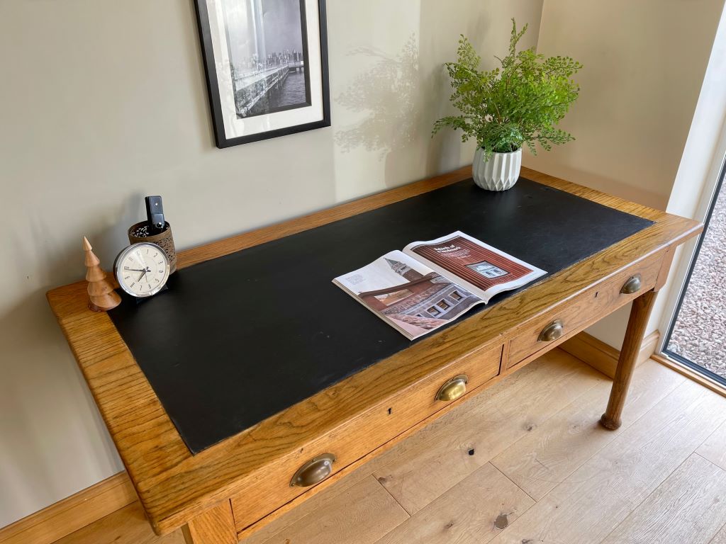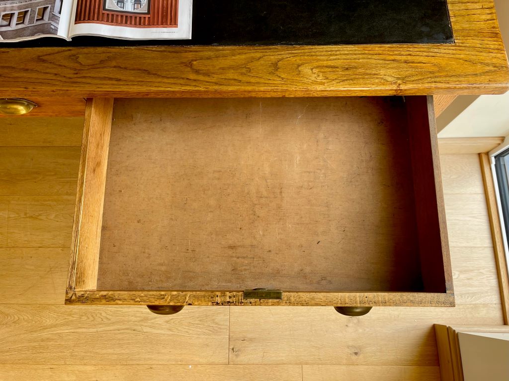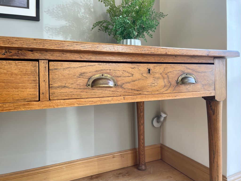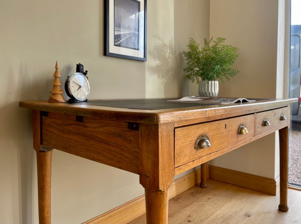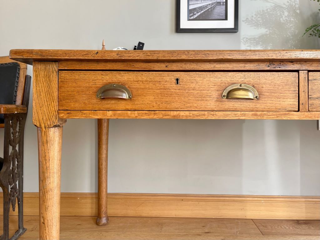 A beautiful antique desk in solid English oak, dating from the late 192o’s to early 1930’s. It is completely original throughout, with the original leather top and superbly aged brass cup handles. We adore the shape of the legs. The desk is perfectly sized for home – nice and wide but not too deep to be able to pass through most doorways. A very nicely sized work surface but not a mission to be able to get in to the room you need. Both drawers run freely and are clean inside. The leather top does have two old tears of circa 3cm each (please see photographs) but they are to the side and could easily be hidden under a lamp or plant if you prefer.
