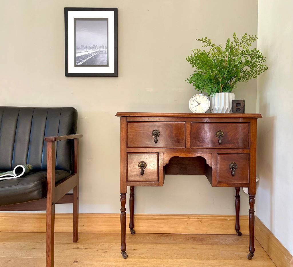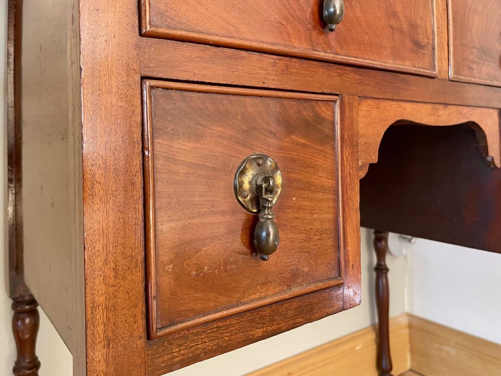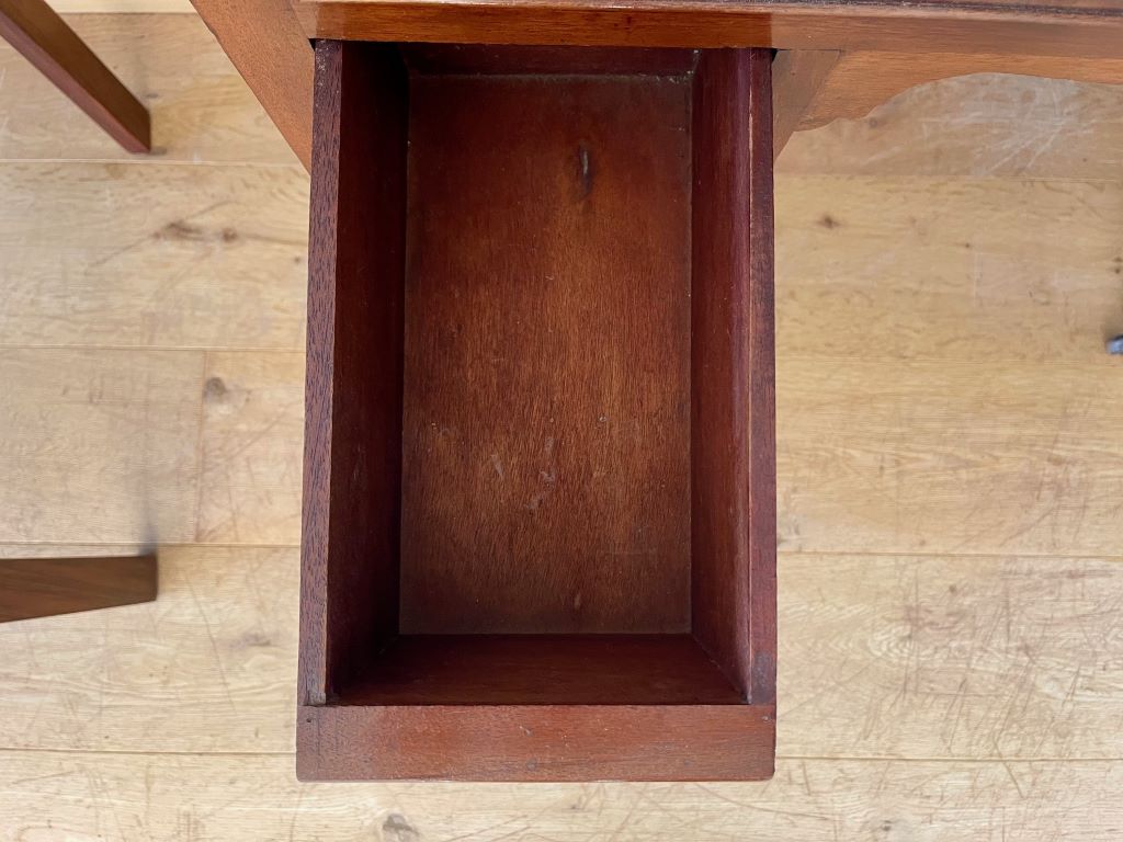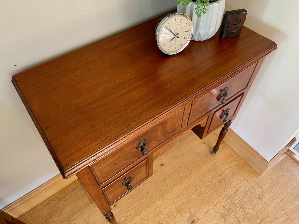 This console is an original antique produced in the early 20th Century (c 1900-1915). It was hand made in mahogany with elegant hand turned legs, typical of the Edwardian period. We think it is a very pretty and elegant piece that could fit in a hallway as a console table, a bedroom as a compact dressing table or a bathroom for toiletries; amongst other possibilities. It is in very good antique condition with just a small amount of old damage to one corner (see photograph). All drawers run smoothly and are clean internally.