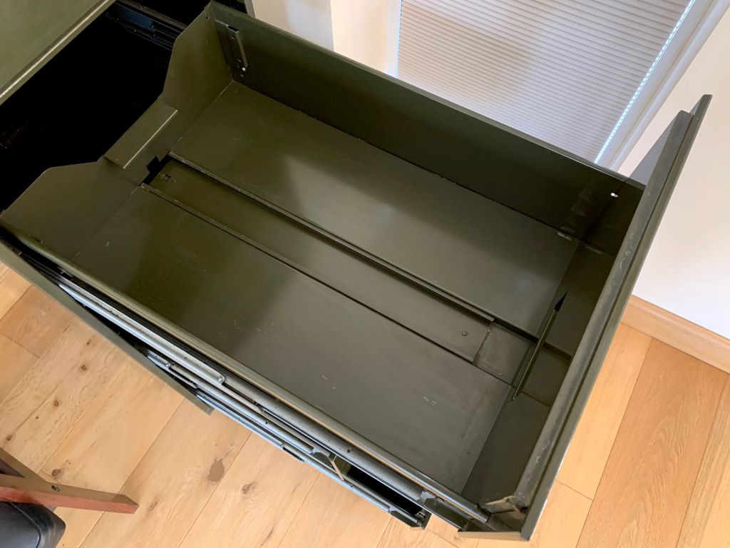 An exceptionally clean and original set of mid century steel filing drawers by Roneo (later to become Roneo Vickers). Great colour, perfect brass ware and a very nice size for home or office. The cabinet and drawers have all been fully cleaned and the runners re-oiled. Superb condition. Industrial style and practicality all rolled in to one.