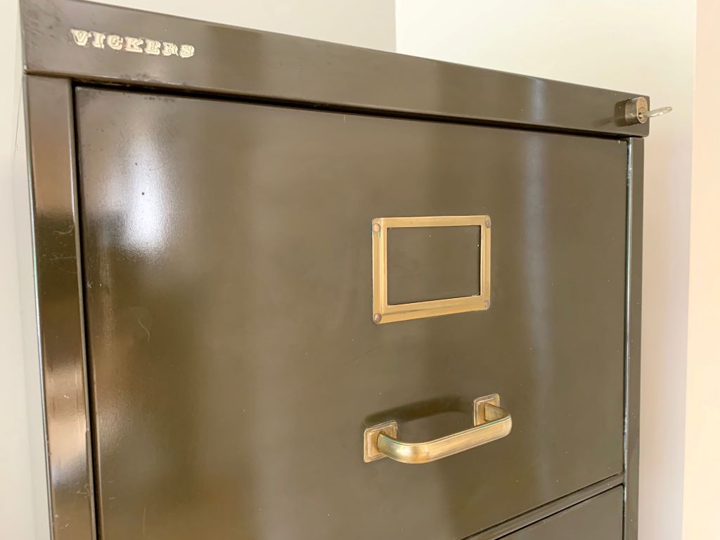 An exceptionally clean and original set of mid century steel filing drawers by Vickers (later to become Roneo Vickers, post 1966 buy out of Vickers by Roneo). Great colour, perfect brass ware and a very nice size for home or office. The cabinet comes complete with key for the lock. The cabinet and drawers have all been fully cleaned and the runners re-oiled. Superb condition. Industrial style and practicality all rolled in to one.