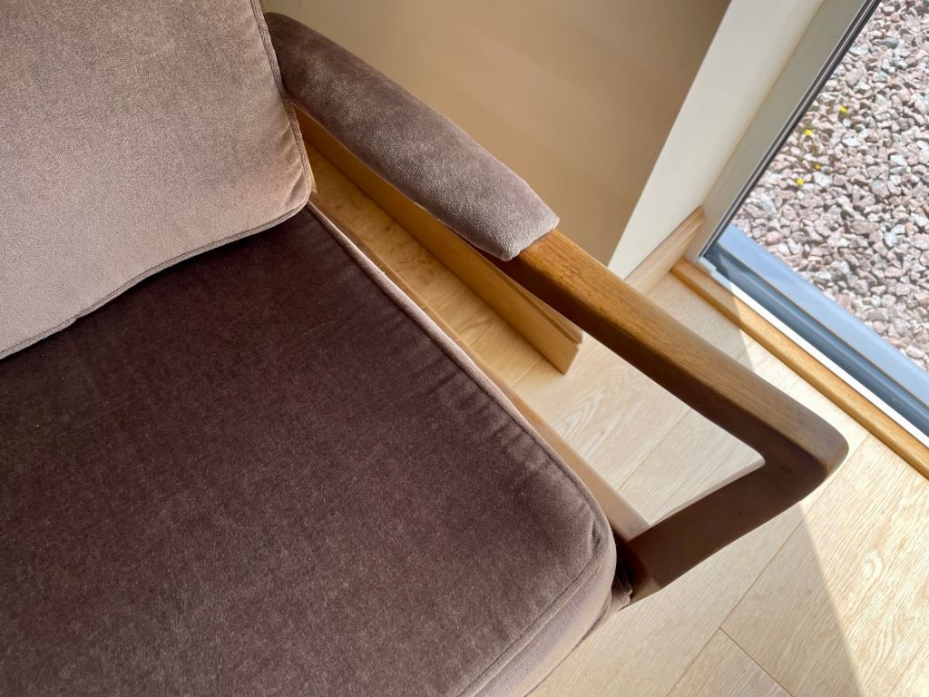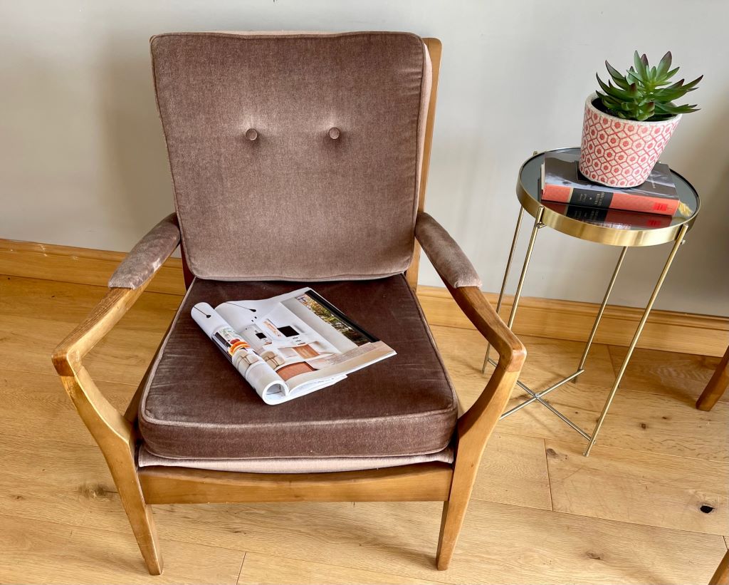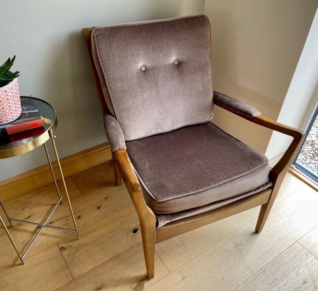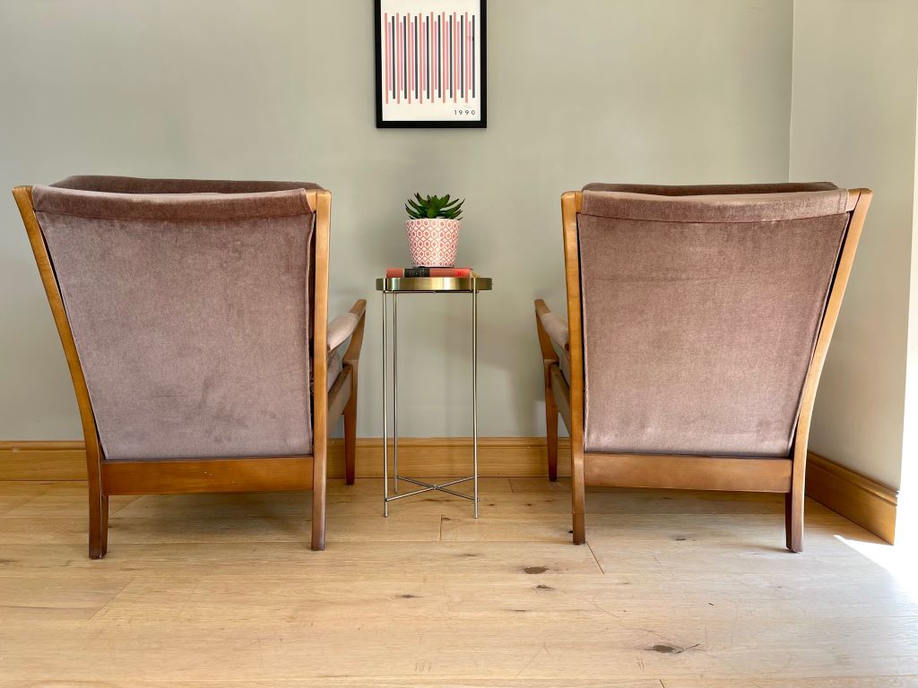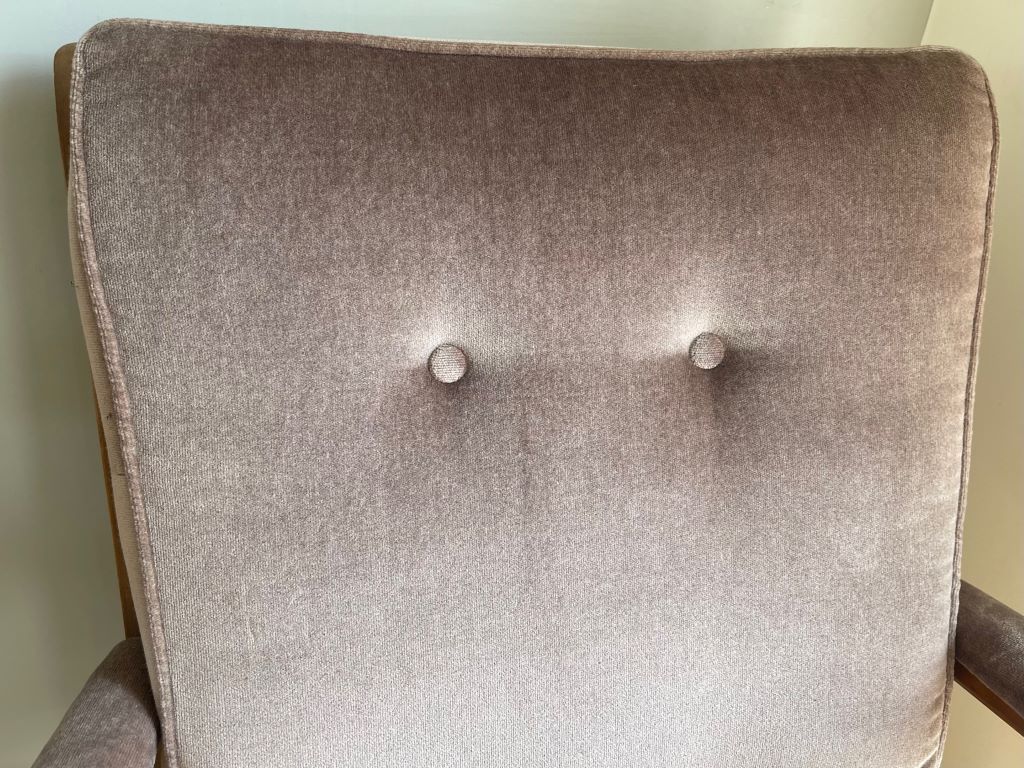 We have a matching pair of these gorgeous 1960’s low armchairs. The chairs are constructed from quality teak framework with beautiful design and offering a really comfortable seat. The upholstery is original and still showing its warm mink colour. All of the springs to the seat and back are their original metal; all in tact and working exactly as they should be. We love the original 1960’s look of the chairs but the condition is truly exceptional for a pair of armchairs that are around 60 years old. No fading to the velour. A beautiful and stylish pair of vintage chairs that will look fantastic when styled and in their new home.