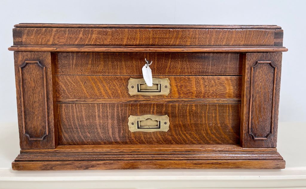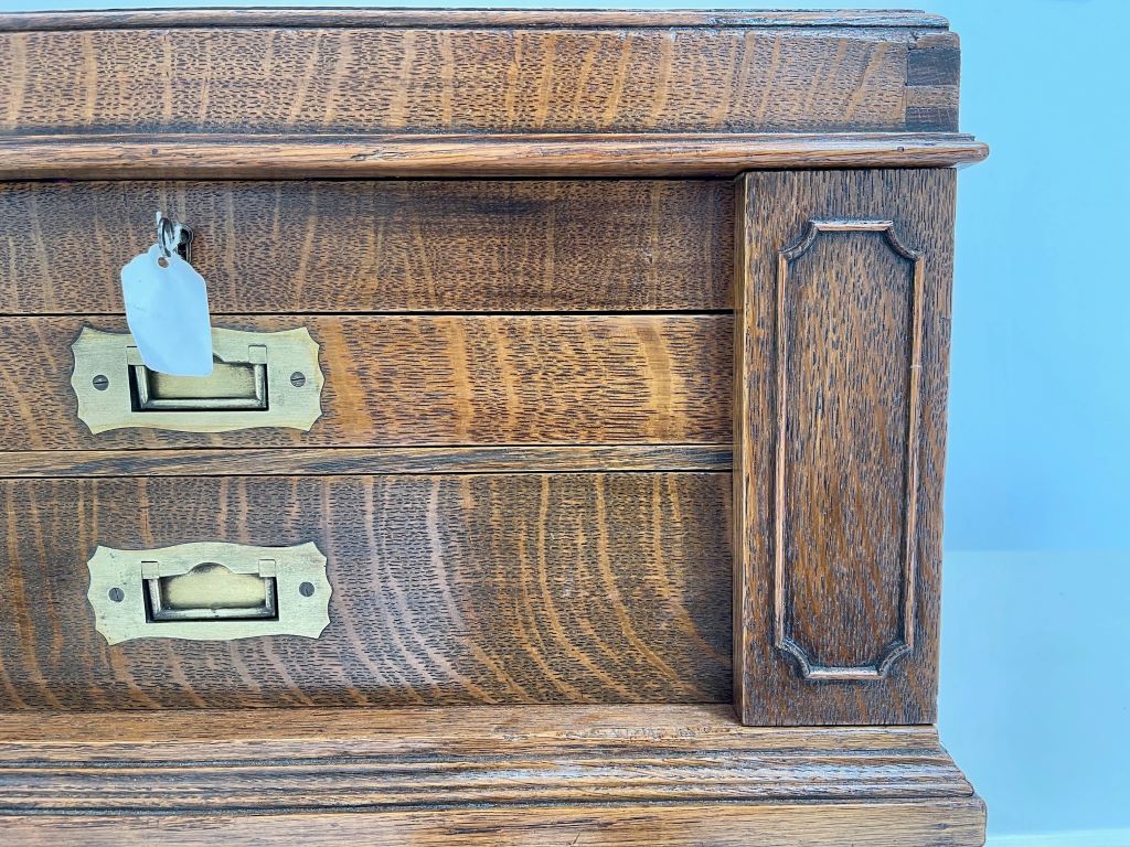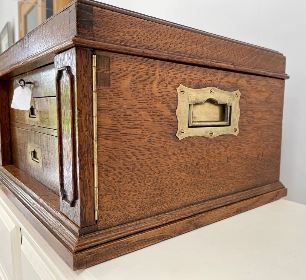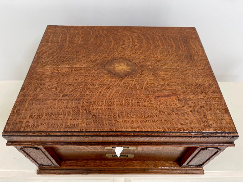 A stunning desk top chest/ drawers of very high quality. The chest is exceptional in so many ways. Firstly it was Elkington & Co. of renowned quality silver and electroplate manufacture (established in Birmingham then opened at 22 Regent Street, London in 1913). To have a quality oak chest with their label on is rare. The quality of the radial cut (Tiger) English oak is exceptional; as are the recessed brass handles to the drawer fronts and both sides. Heavy oak and solid quality brassware make this a chest of quality manufacture and weight. The chest weighs around 12kgs. The design is also a rare example. Styled as a Wellington chest with two front flaps that encase the drawers and become locked in to place by the lock and key that also locks to the top. Even the front wooden banding design work is still all in tact and of very fine order.