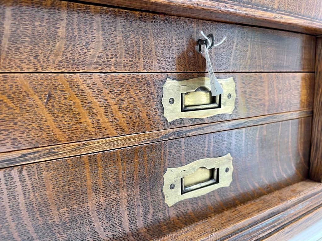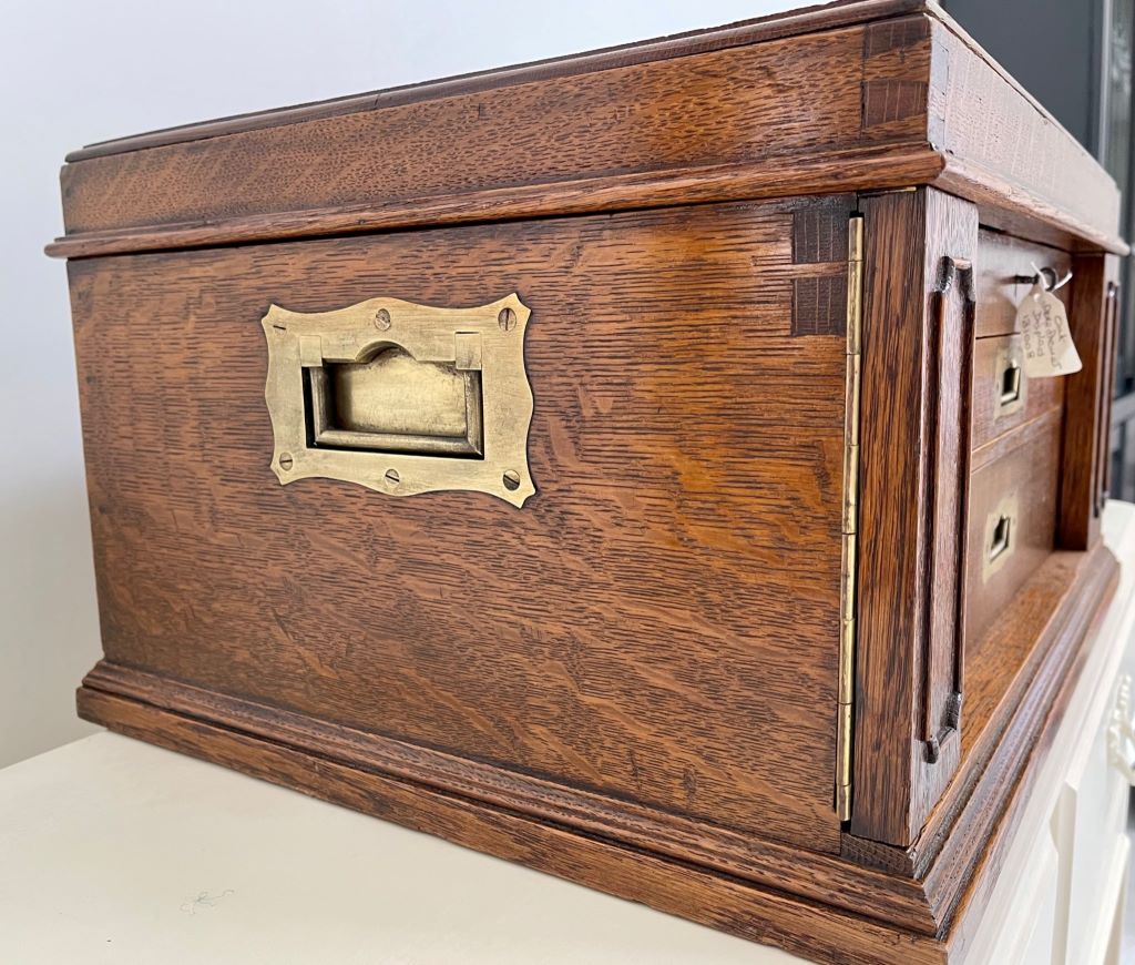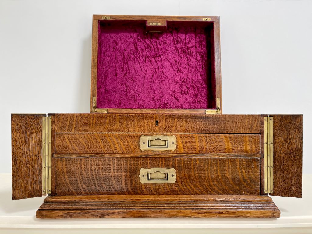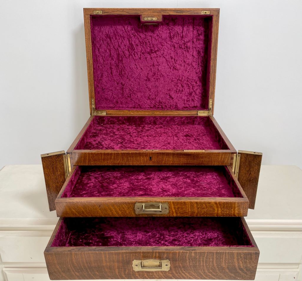 A stunning desk top chest/ drawers of very high quality. The chest is exceptional in so many ways. Firstly it was Elkington & Co. of renowned quality silver and electroplate manufacture (established in Birmingham then opened at 22 Regent Street, London in 1913). To have a quality oak chest with their label on is rare. The quality of the radial cut (Tiger) English oak is exceptional; as are the recessed brass handles to the drawer fronts and both sides. Heavy oak and solid quality brassware make this a chest of quality manufacture and weight. The chest weighs around 12kgs. The design is also a rare example. Styled as a Wellington chest with two front flaps that encase the drawers and become locked in to place by the lock and key that also locks to the top. Even the front wooden banding design work is still all in tact and of very fine order.