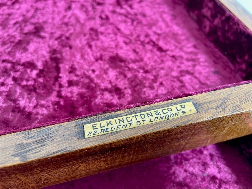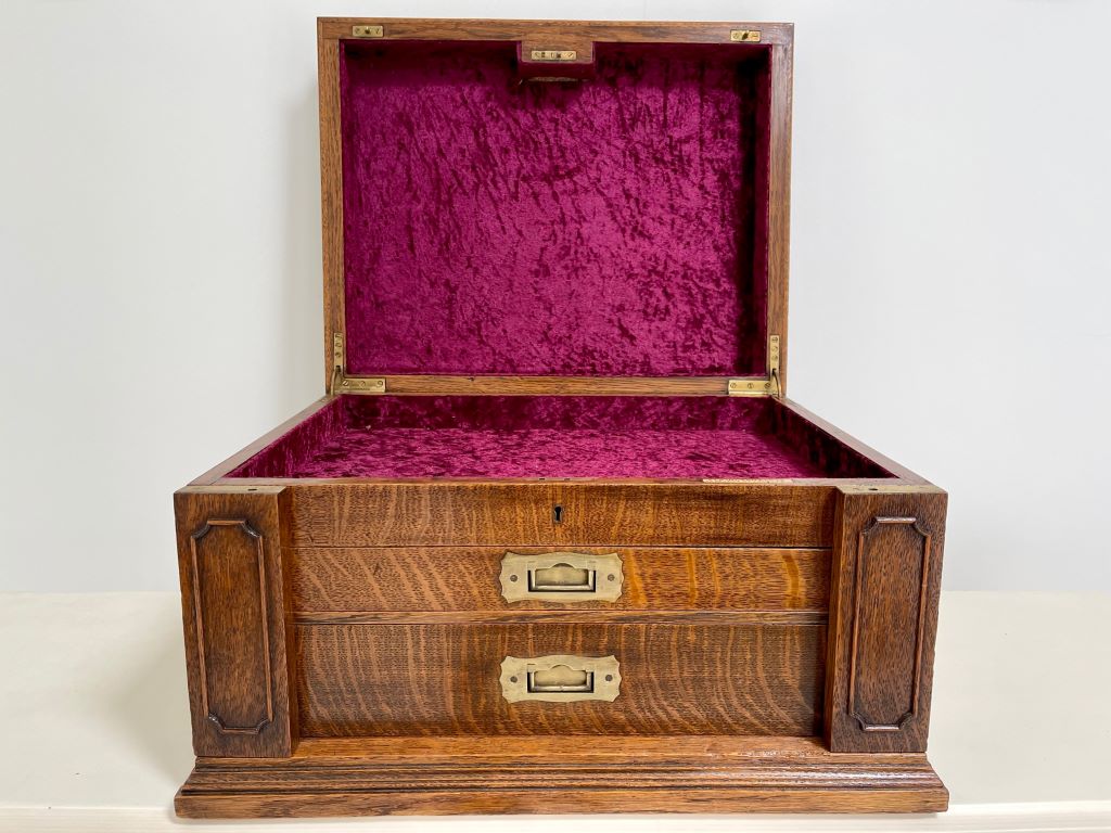 The drawers inners and top have all been later lined in an aubergine coloured crushed velvet. Professionally done, though we do not know by who or when. We very rarely see chests of this size, design and quality – especially with a very well known sellers label still present. Could it be a truly special jewellery box?