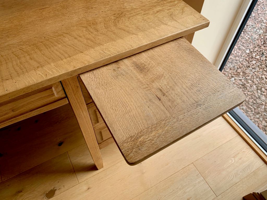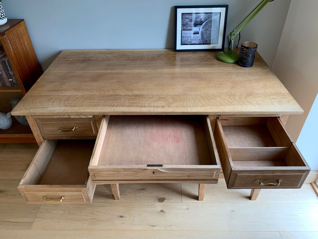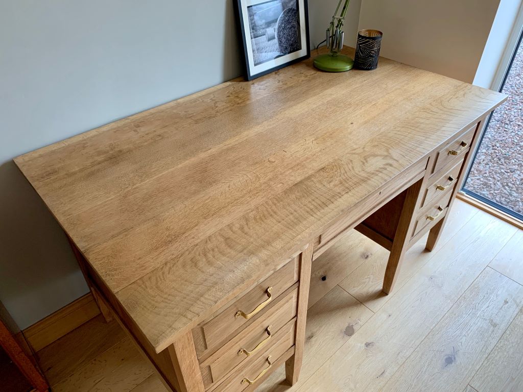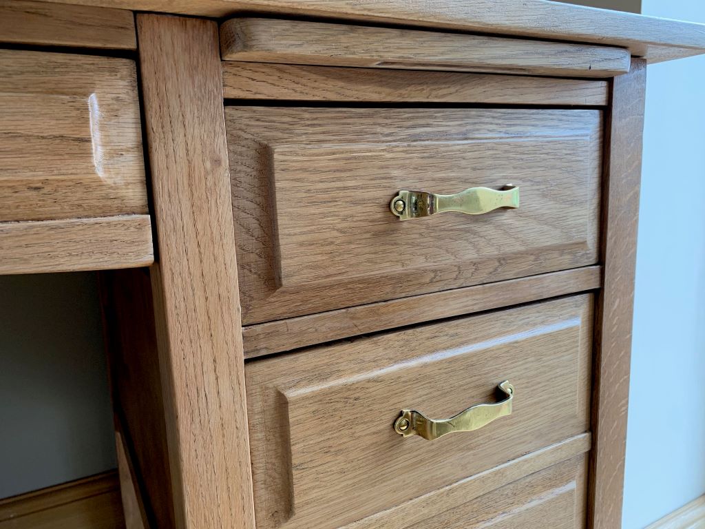 The quality of the radial cut oak meant we did not need to stain or change the colour in any way. We only added a protective finish in satin sheen varnish to seal the oak against spills and stains etc. The handles are original to the desk and we removed them to give them a thorough clean and polish.