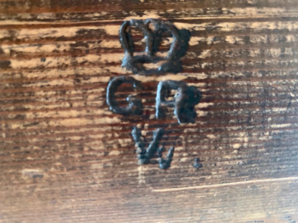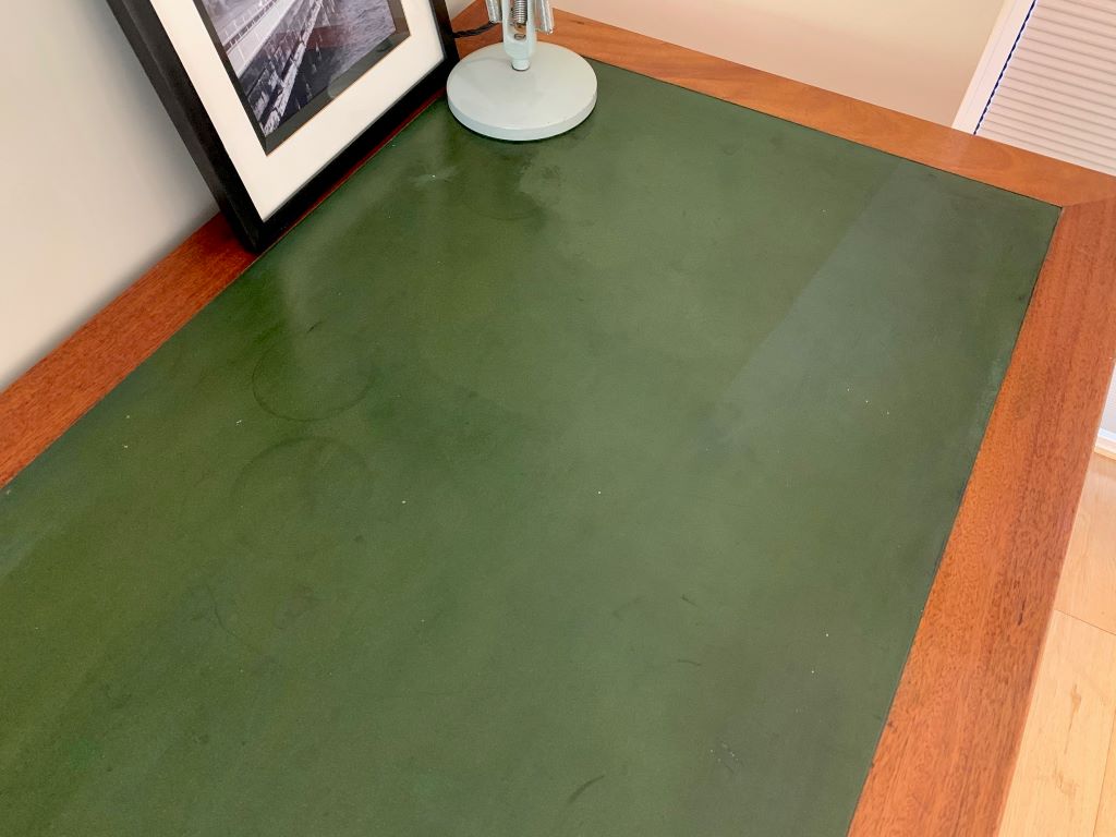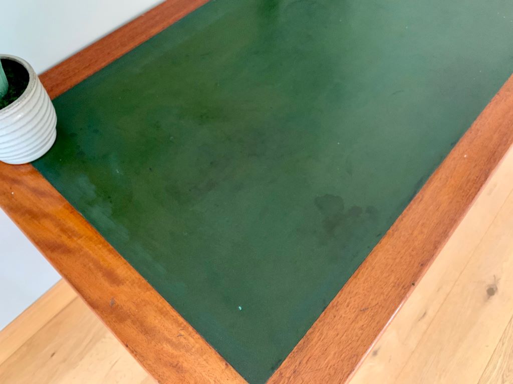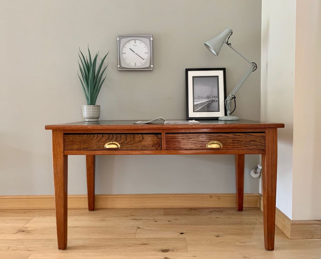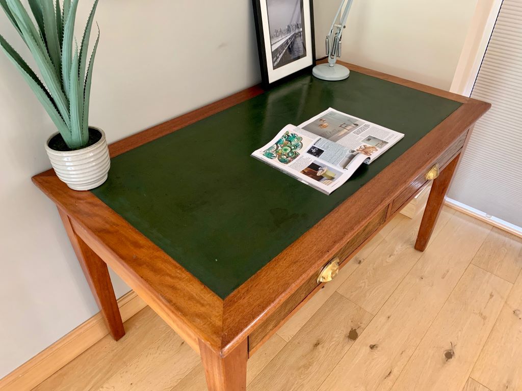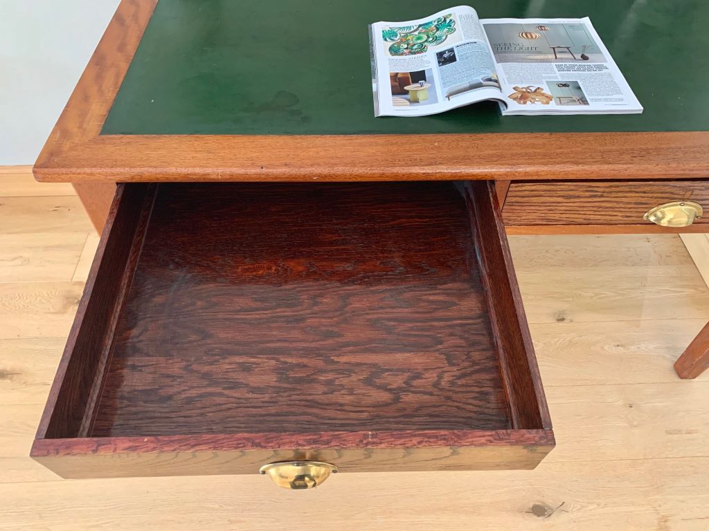 An amazing desk in solid English oak, dating from the late 1920’s to early 1930’s. These desks typically came from a Government office/ Public Service such as Civil Servant Offices, Schools, Railways etc. This desk is stamped with George V and the crown on the underside. Now presented in a beautiful rich oak that only time can offer. The desk also retains its original green top. The top shows some age related marks but we rarely see tops of this age in such good condition.