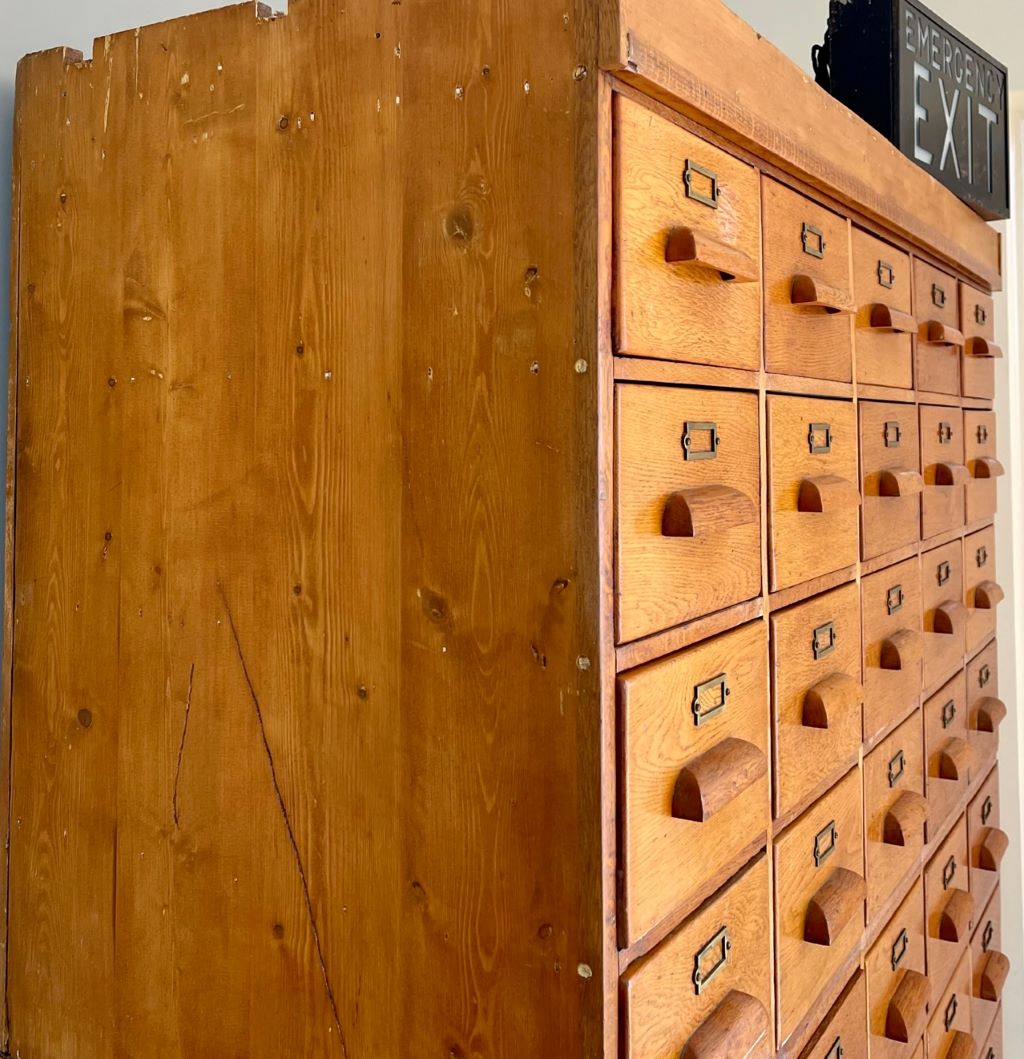 A simply stunning double bank of haberdashery drawers in beautifully aged oak. They date to around the 1930’s to early 1940’s and were supplied by a quality shop fitters – E Pollard & Co. Clerkenwell, London, EC1. They were supplied to a shop/ customer in Taunton, Somerset, according to the original label still stuck on the rear of the drawers. The drawers are all made of solid oak with quality carpentry, including dovetail joints to all fronts and sides. All handles are original and present, along with all of the drawer front label holders. It is incredibly rare to find such a piece in this outstanding original condition.