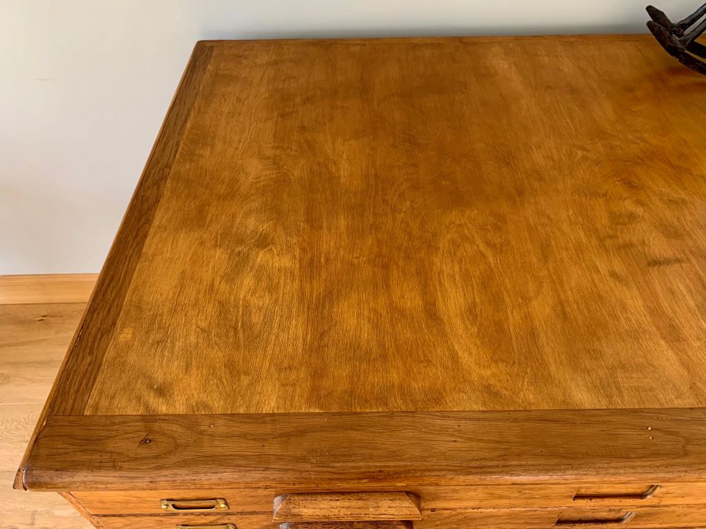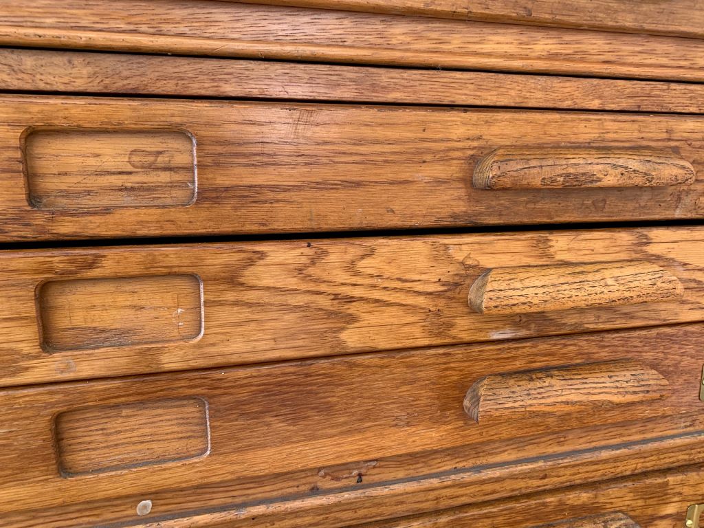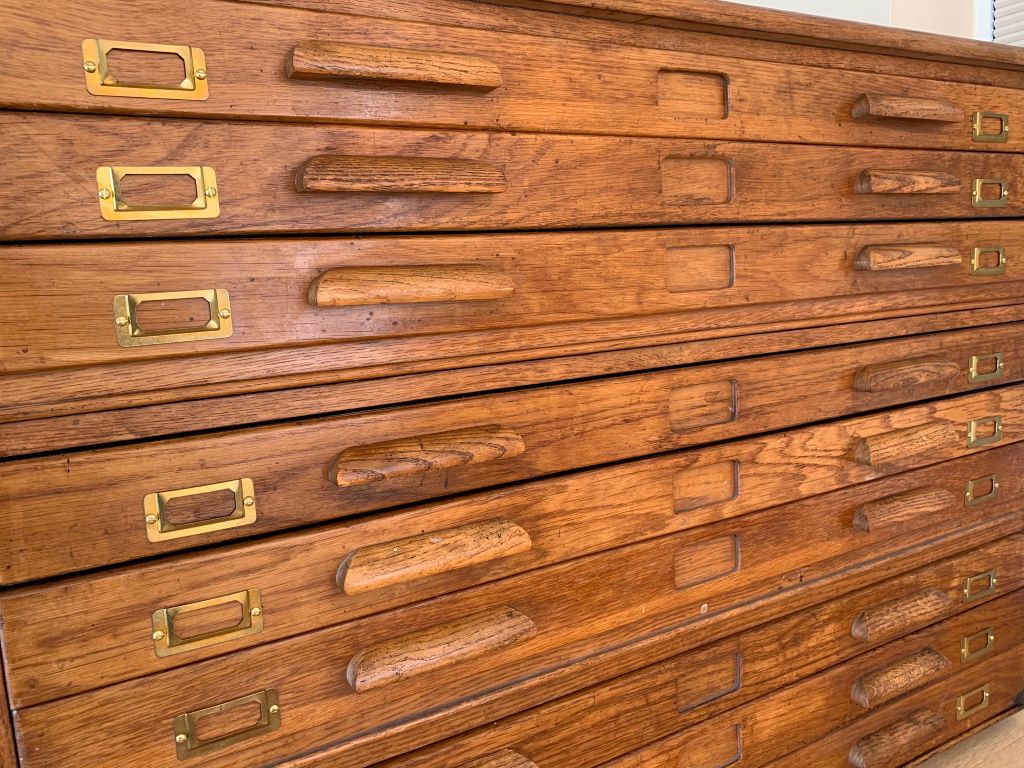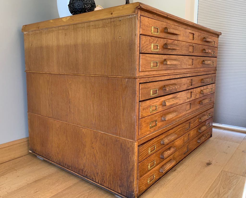 This is a rare large architect’s/ plan chest with 9 full size drawers. It is constructed from good quality solid oak (framework, drawer fronts and handles). The sides and top are oak veneer. The drawer internals are pine. Original central recessed drawer label holders are are still in tact and in beautiful condition. Brass label holders have been added at a later date but do have some age and a nice ageing patina. The chest does split in to three sections for easier transportation and locating to the position you wish. All three sections holds three drawers when separated.