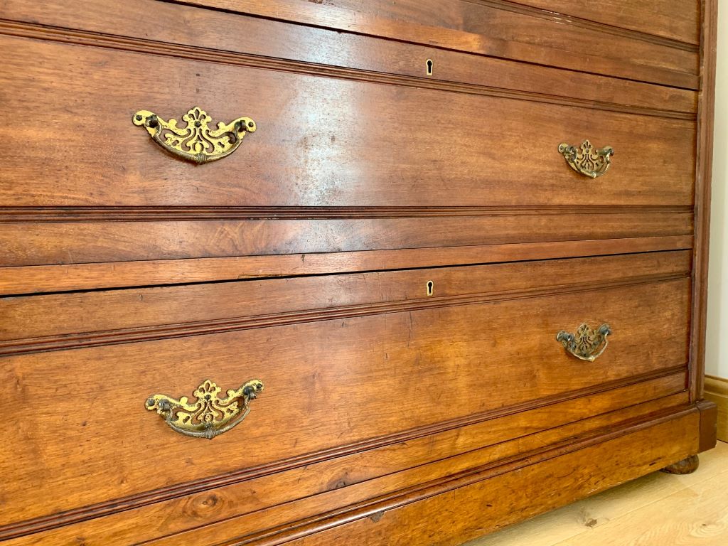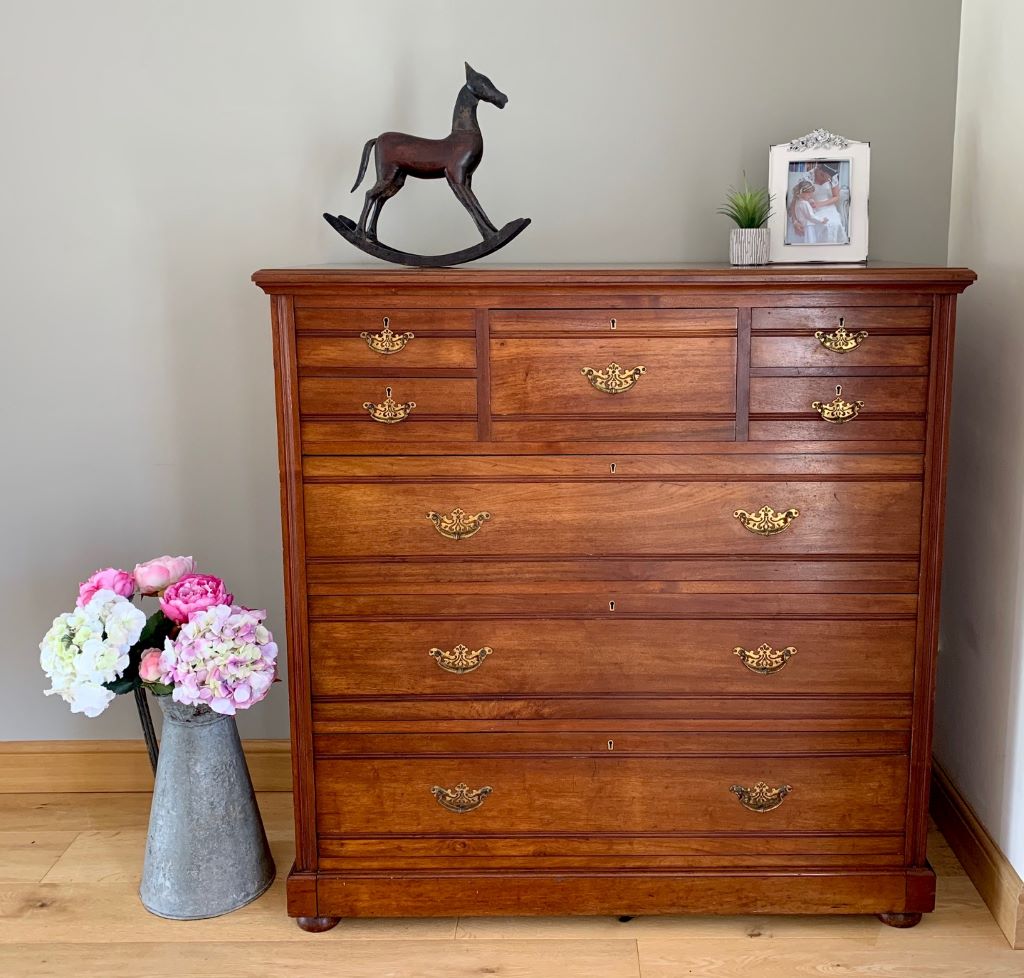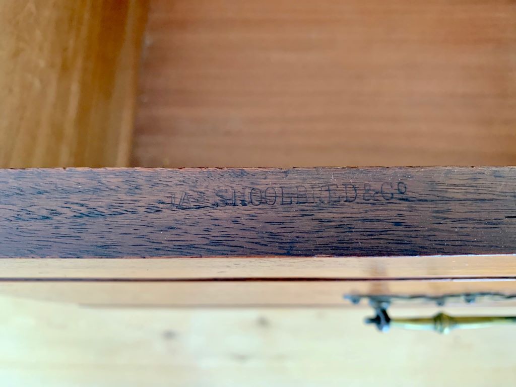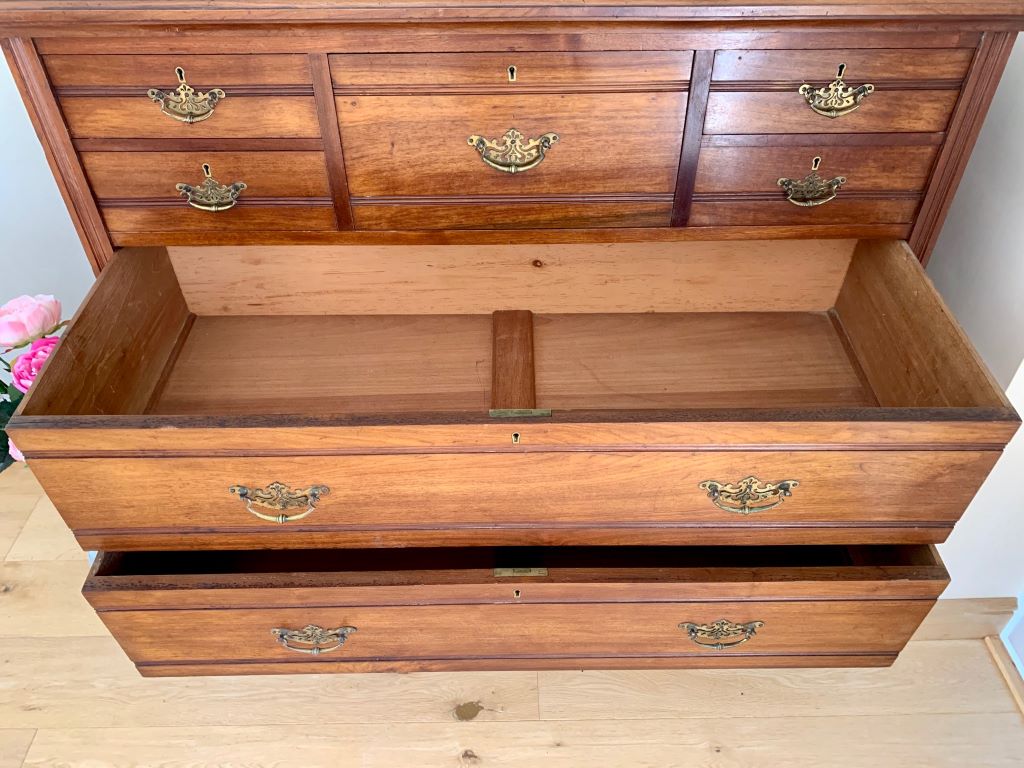 A simply stunning large chest of drawers, dating from around 1915-25. They were produced by the world renowned quality maker Jas (James) Shoolbred of Tottenham Court Road (1820-1931). Constructed form mahogany, this chest is completely original and now offers the perfectly aged colour and patina of a genuine antique quality piece. The style is very much of the Edwardian period in the UK and the original brass handles perfectly reflect this. With 8 drawers in total, the chest offers an incredible amount of very useful storage. All drawers are very clean and free running.