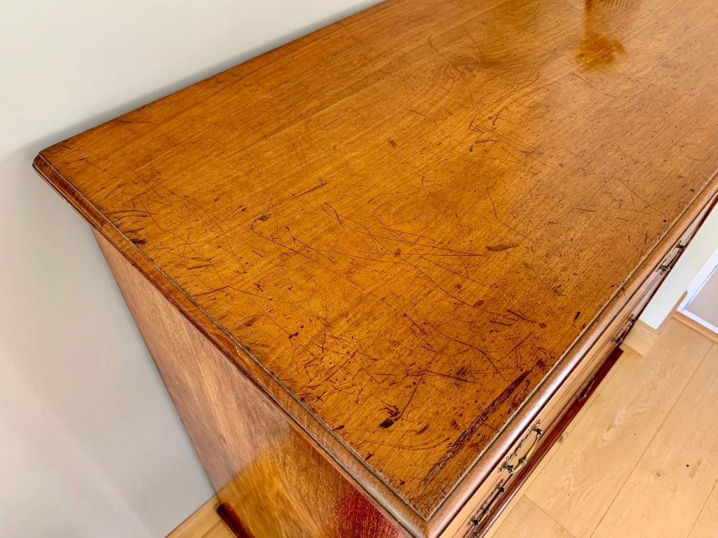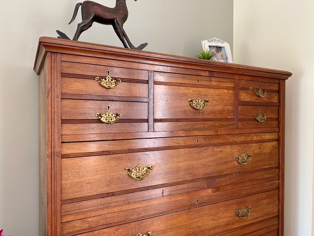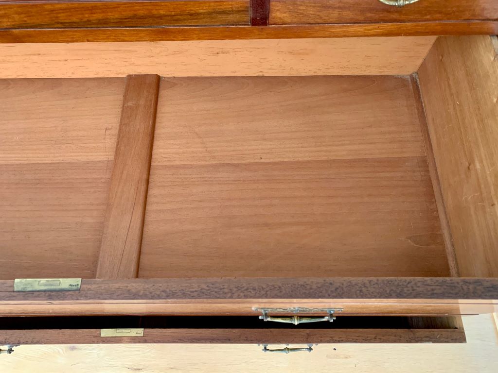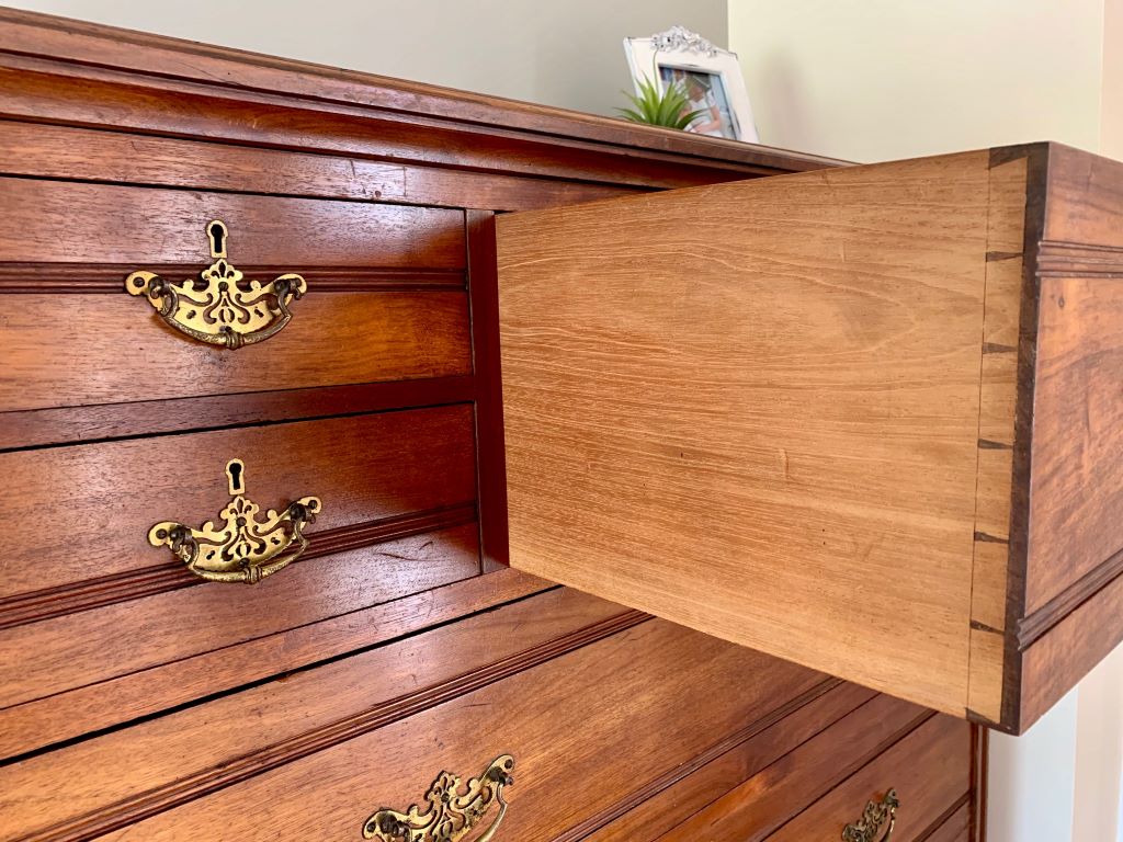 A simply stunning large chest of drawers, dating from around 1915-25. They were produced by the world renowned quality maker Jas (James) Shoolbred of Tottenham Court Road (1820-1931). Constructed form mahogany, this chest is completely original and now offers the perfectly aged colour and patina of a genuine antique quality piece. The style is very much of the Edwardian period in the UK and the original brass handles perfectly reflect this. With 8 drawers in total, the chest offers an incredible amount of very useful storage. All drawers are very clean and free running.