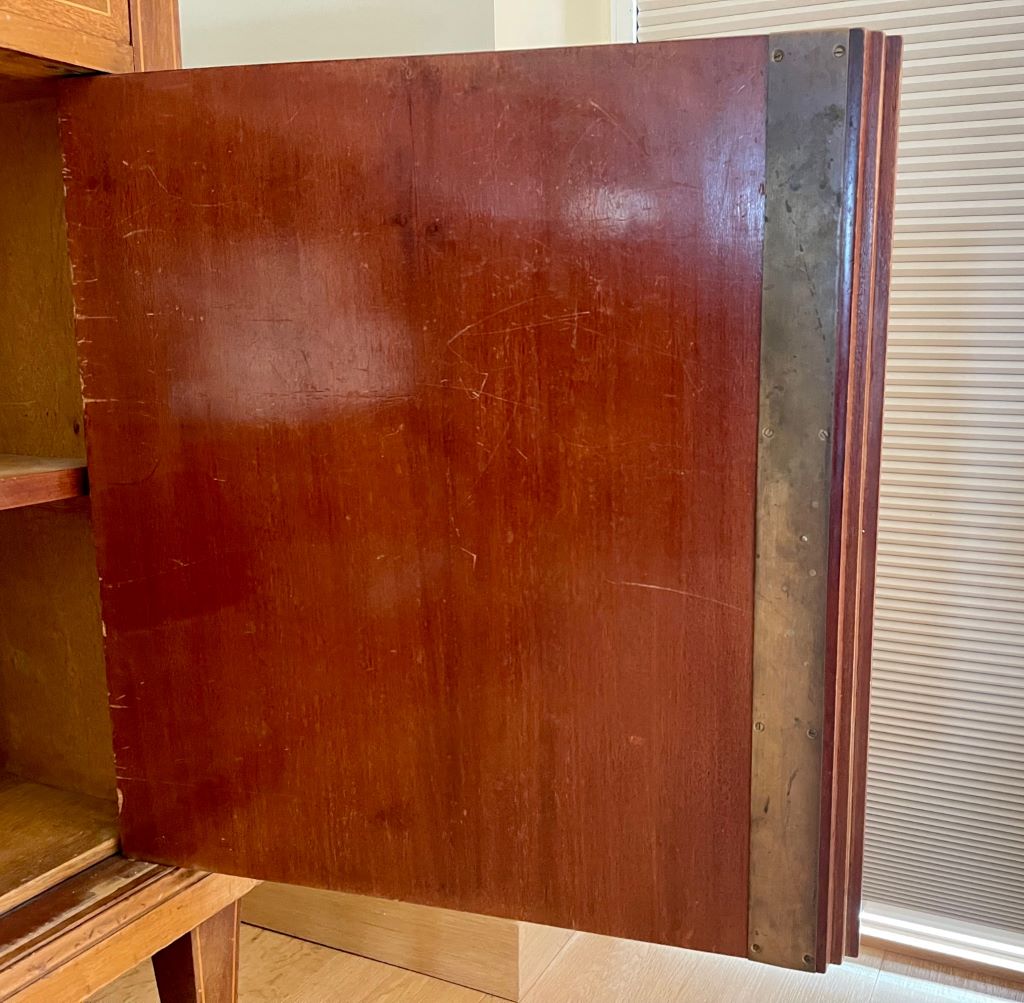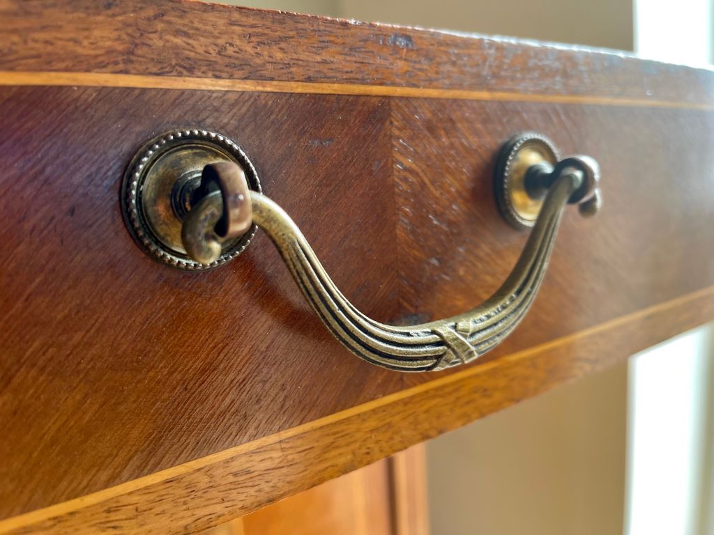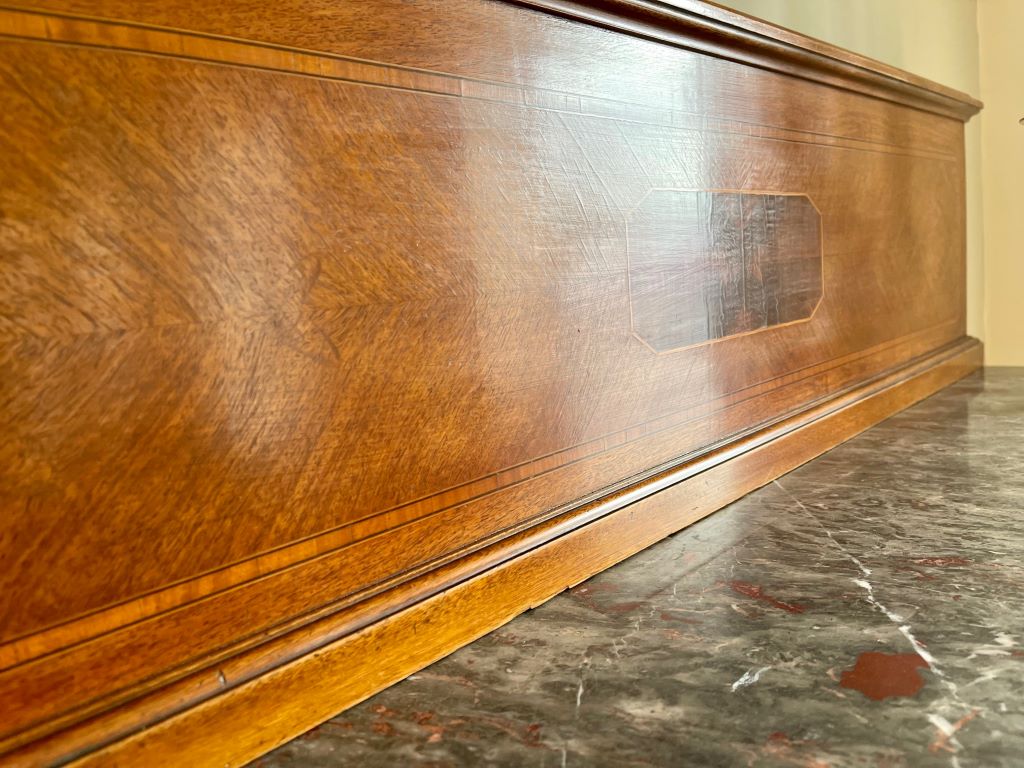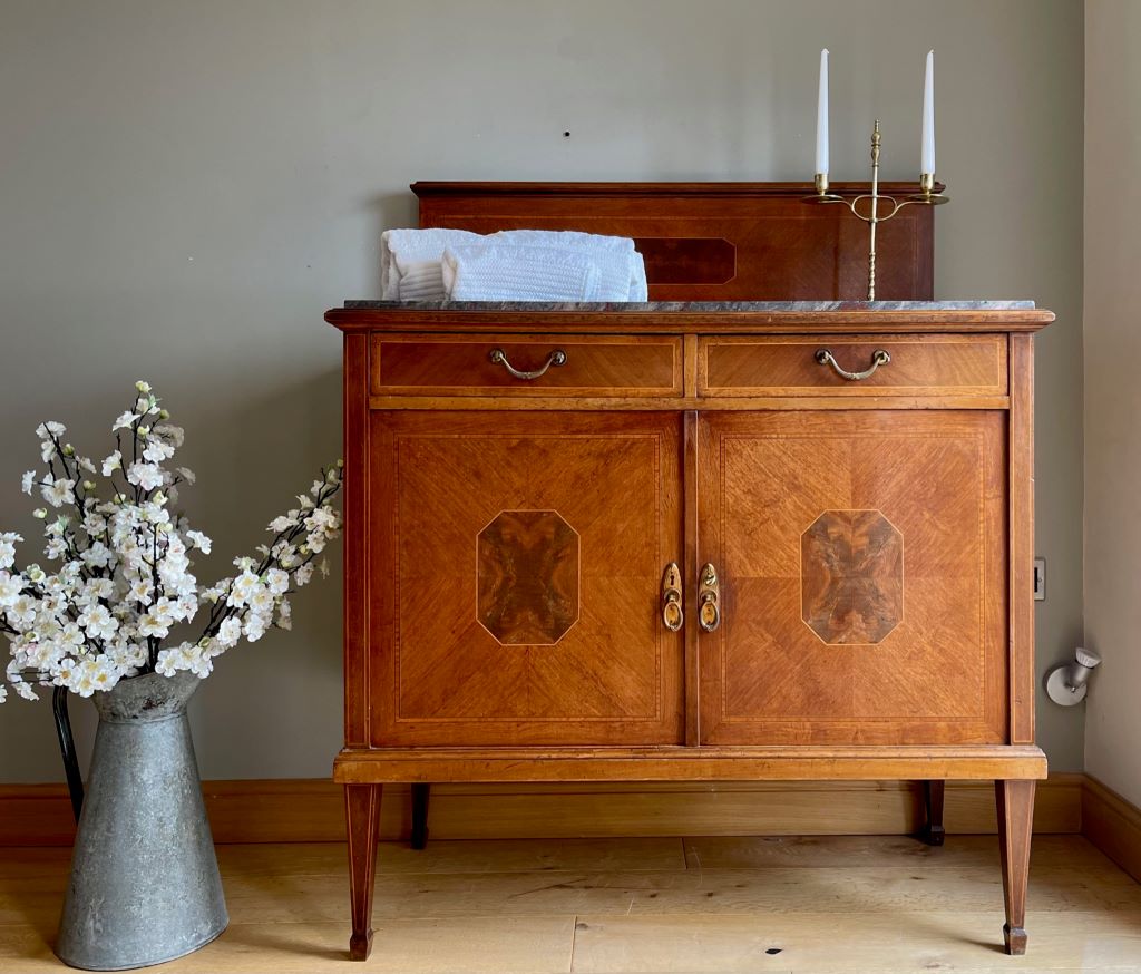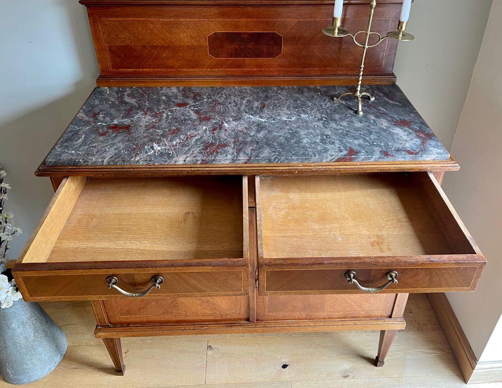 An original early 20th Century French marble top wash stand. We acquired this from a private buyer that purchased the piece in an antique store in Paris, whilst living there. It is a large piece of impressive scale and with many touches of quality. The weight of the piece, together with the quality of the inlaid veneer and the original brass ware all point to an expensive item when new. It would date to around 1910-20’s. Produced from a mixture of fruit and satinwood it has many fine touches of veneer work – including the central octagonal door centre pieces and the border work to the doors and drawers. With heavy weight original brassware displaying reed and ribbon pattern to the drawer handles and also the lower door drop handles. A beautiful piece that would not have to be used as a wash stand or in a bathroom. It would equally make a beautiful hall table, living room sideboard etc. The rear upstand easily removes by four screws if you prefer a simpler finish to the top to give it more of a sideboard/ console table look.