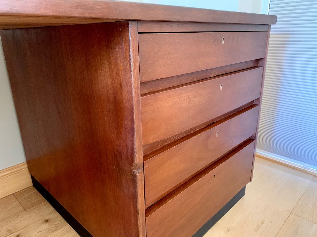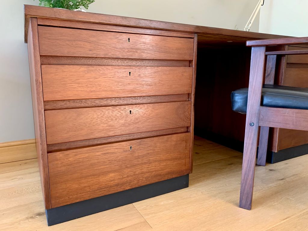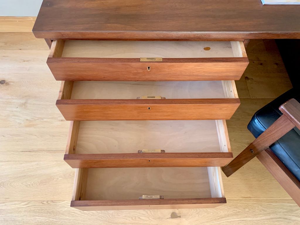 A beautiful mid Century desk dating from around the 1960’s. It is large and heavy, reflecting the quality of solid mahogany and the carpentry. It is fully hand made and quite unique in design. It is very reminiscent of minimalist Scandinavian in design but the writing from the carpenter looks European/ possibly French. We believe it would have been a bespoke made piece, certainly not mass produced.