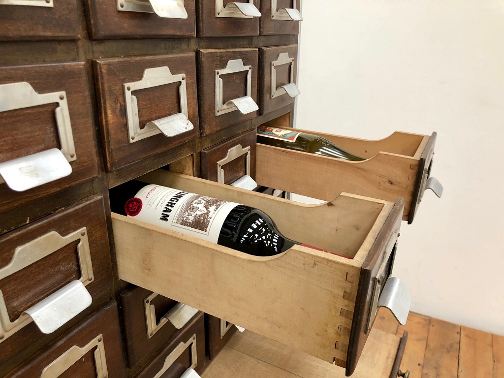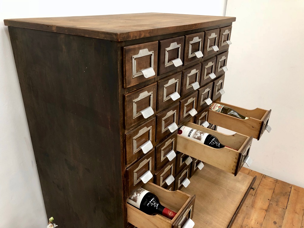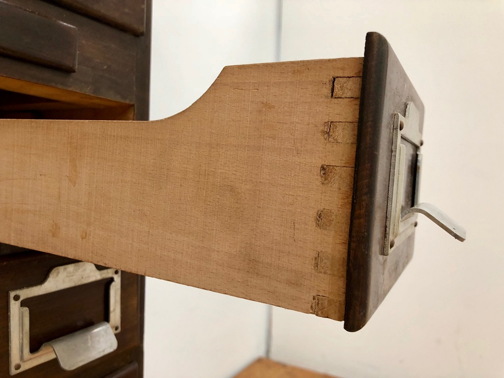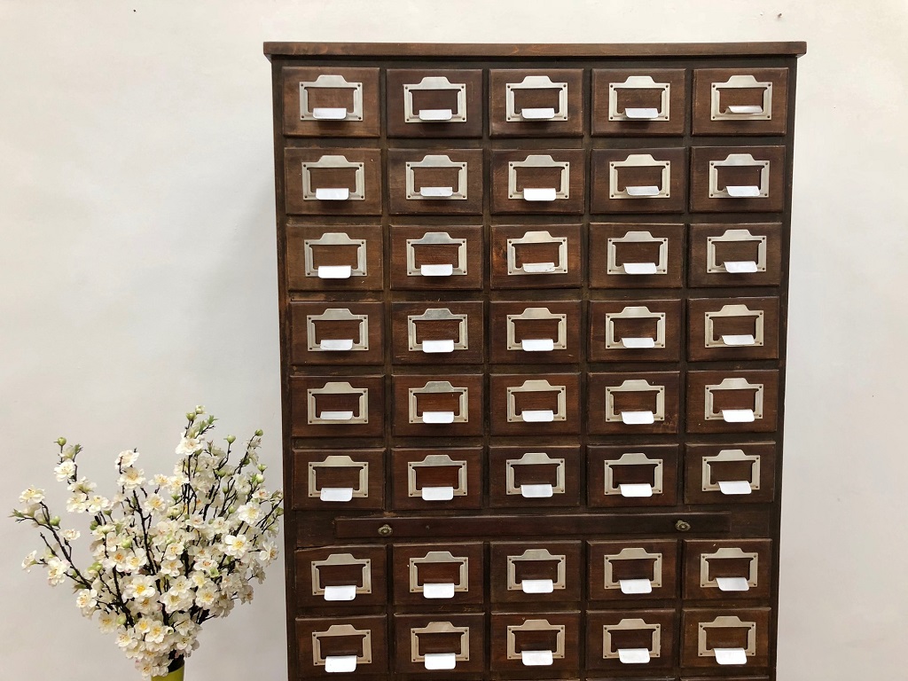 At 172cm tall with solid, thick oak frame and drawer fronts this piece weighs approximately 100kg – reflecting the quality of manufacture and the expense when new. Two drawer fronts had to be replaced due to damage. All 58 other drawers, fronts and label holders are original.