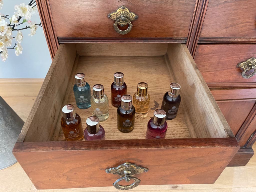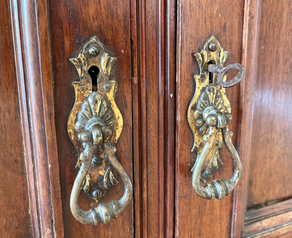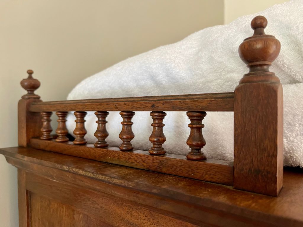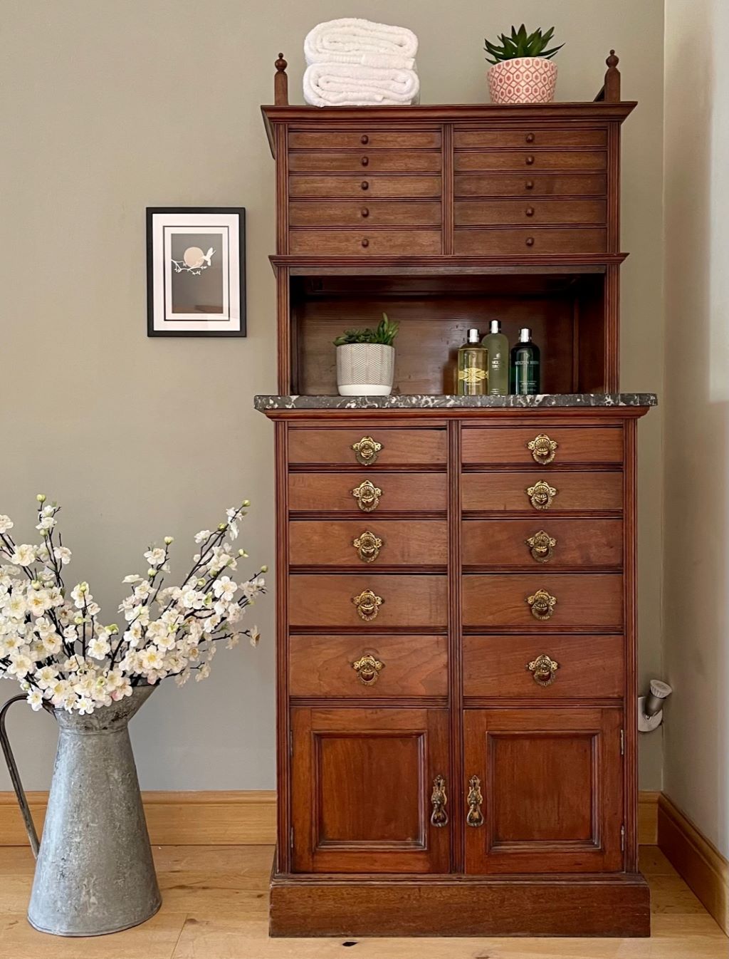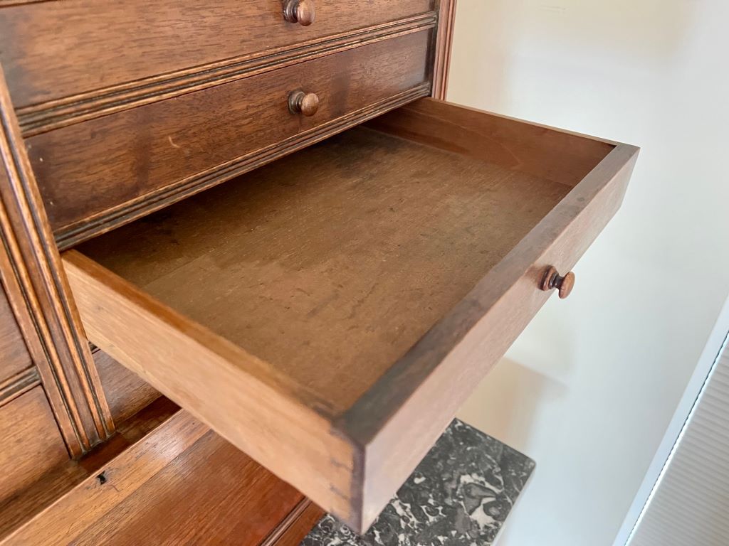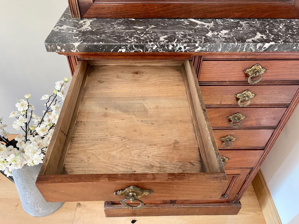 We are unashamedly in love with this cabinet and it has lit up many eyes from the people that have seen the piece in the flesh. Stunning! It is hand made from mahogany with its original marble top and porcelain insert (within the top cupboard section). All of the brass handles on the lower drawers and the turned wooden knob handles are completely original and in tact. We absolutely adore the turned balustrades and finials on the top gallery! Signs of true quality craftsmanship throughout the whole piece.
