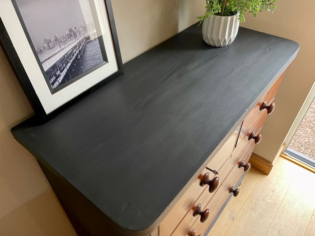 An original chest of gorgeous Victorian drawers in mahogany. The drawers date from around 1860-80 and are presented in a two over three configuration. The chest comes complete with their original solid mahogany turned handles. We stripped the sides and top of the chest due to veneer damage and refinished in Farrow & Ball Off Black with a clear wax finish for protection. We kept as much of the original veneer by leaving the drawers in tact for contrast against the black paintwork.