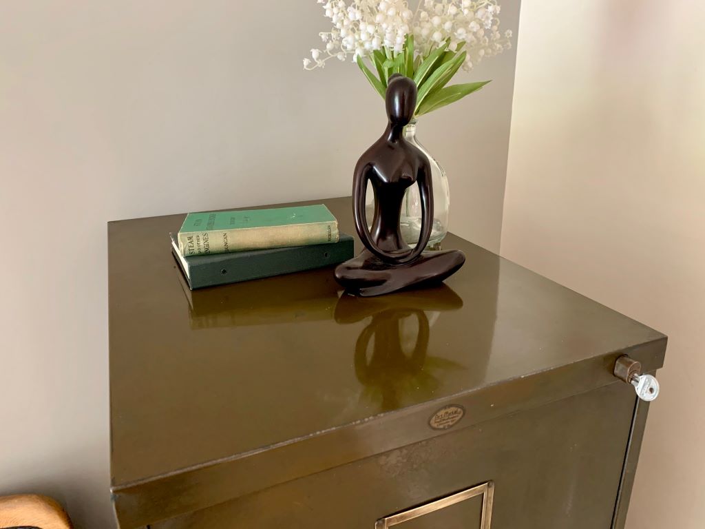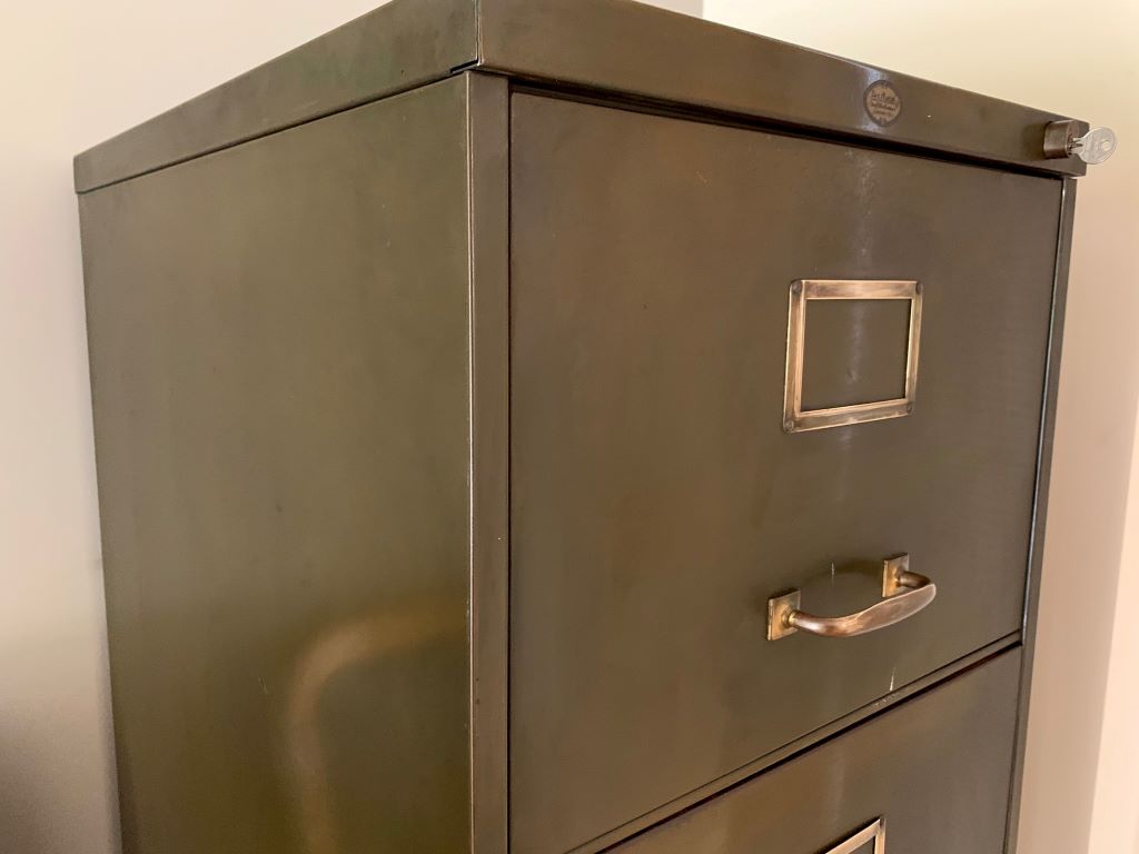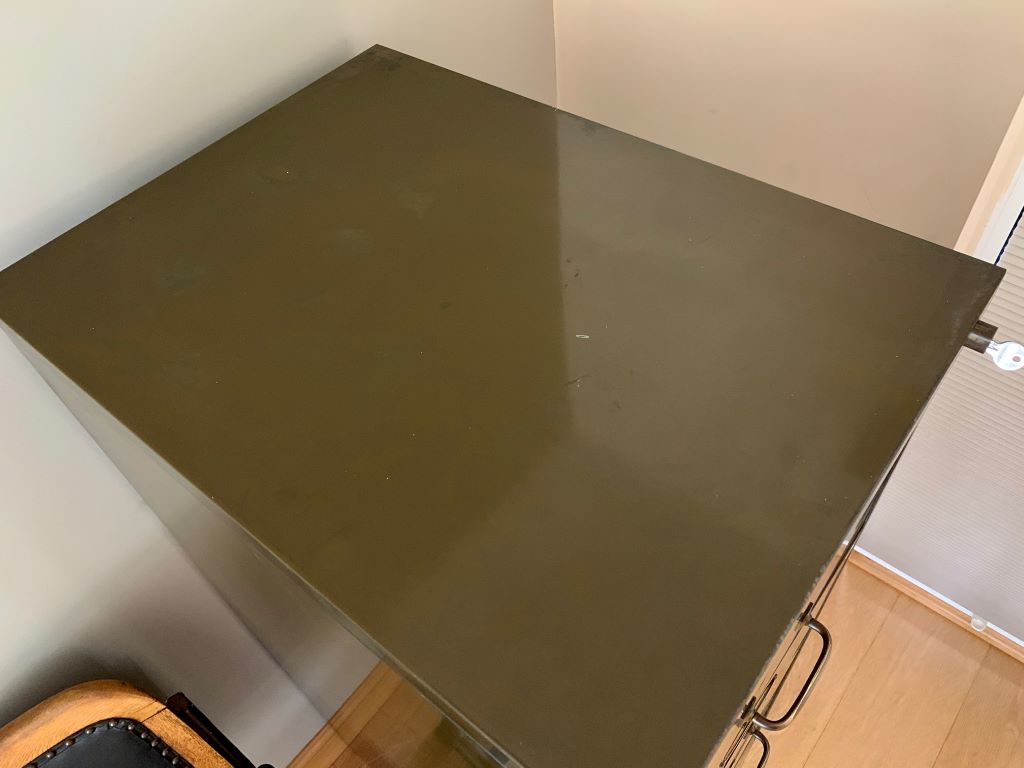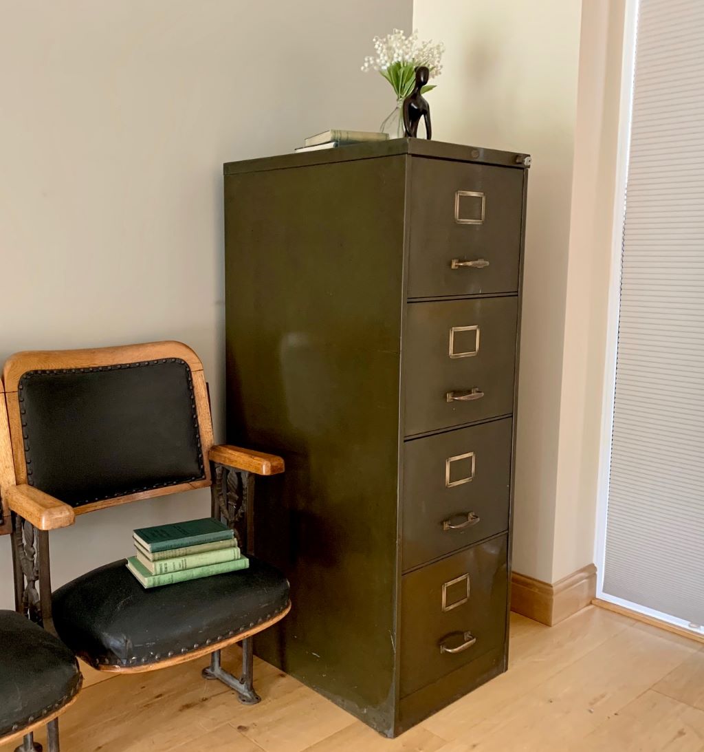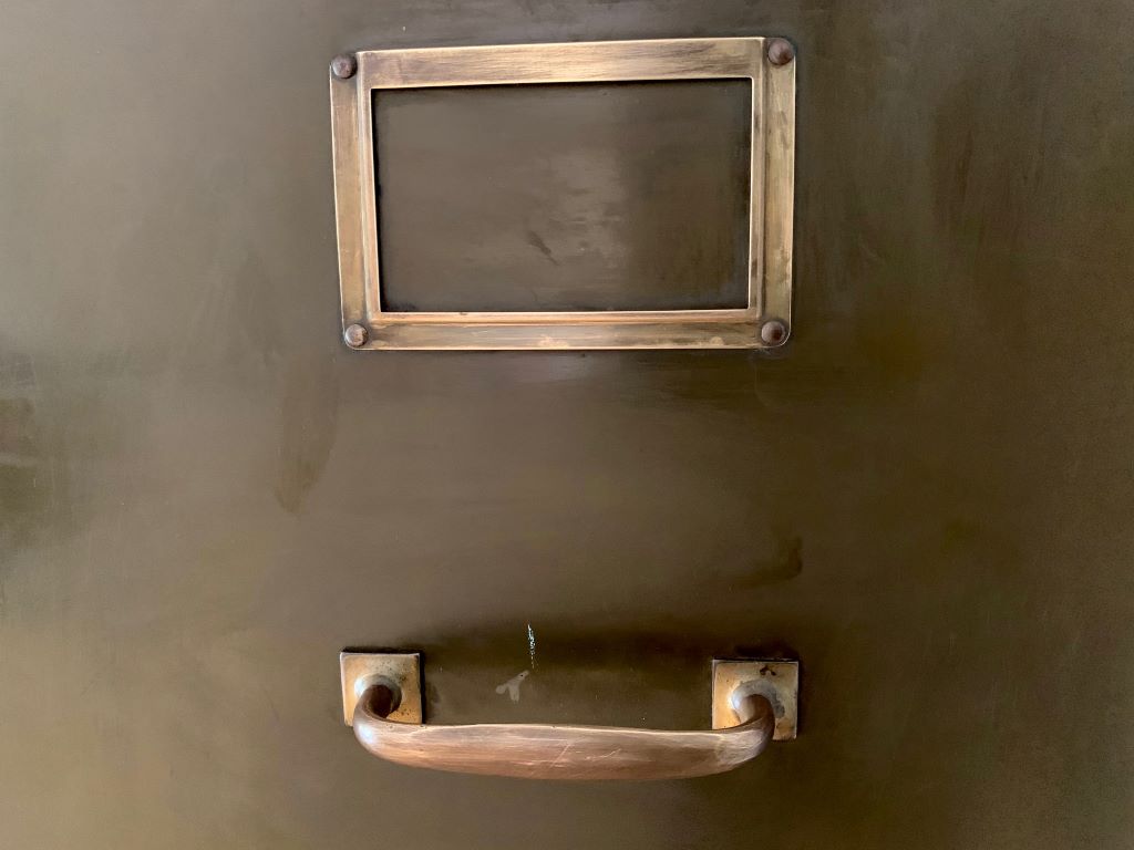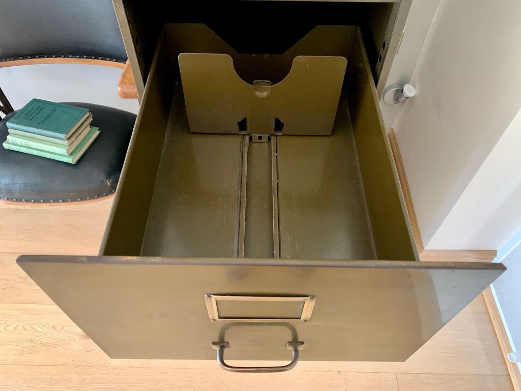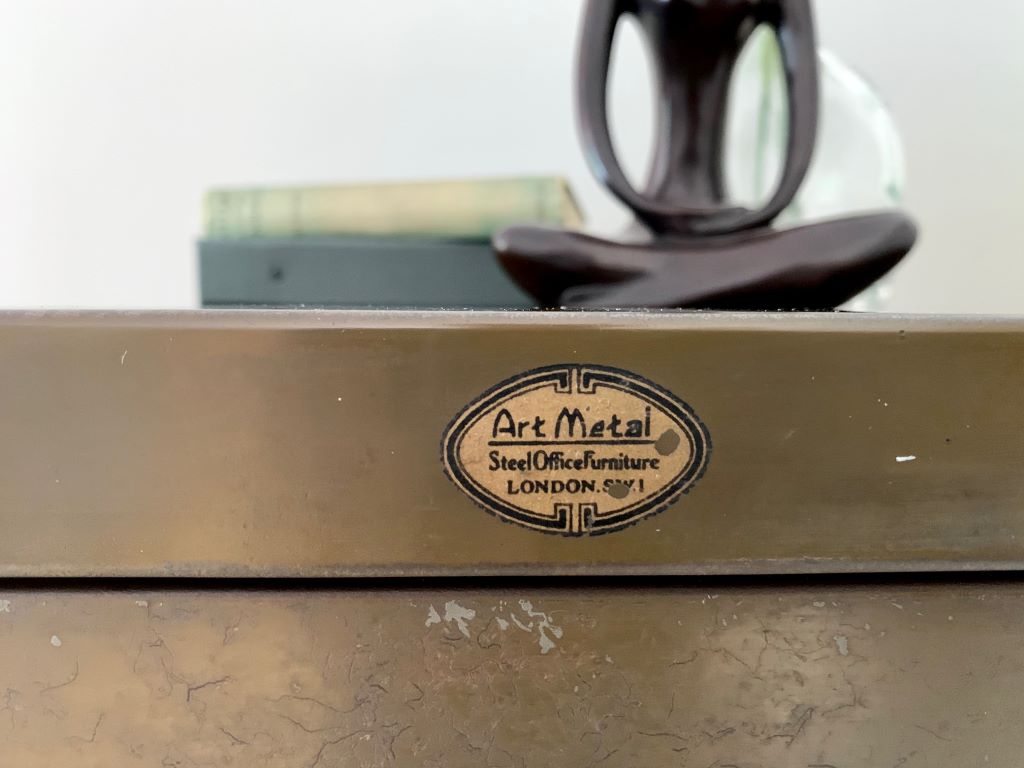 A great set of original mid century steel filing drawers by Art Metal (London, SW1). Most of these cabinets are by Roneo. Art Metal cabinets are much harder to find; especially in this condition Great colour and condition, with perfectly aged original brass ware. A very nice size for home or office. The cabinet comes complete with key for the lock. The cabinet and drawers have all been fully cleaned and the runners re-oiled. Superb condition for its age with plenty of industrial design and character. Industrial style and practicality all rolled in to one.