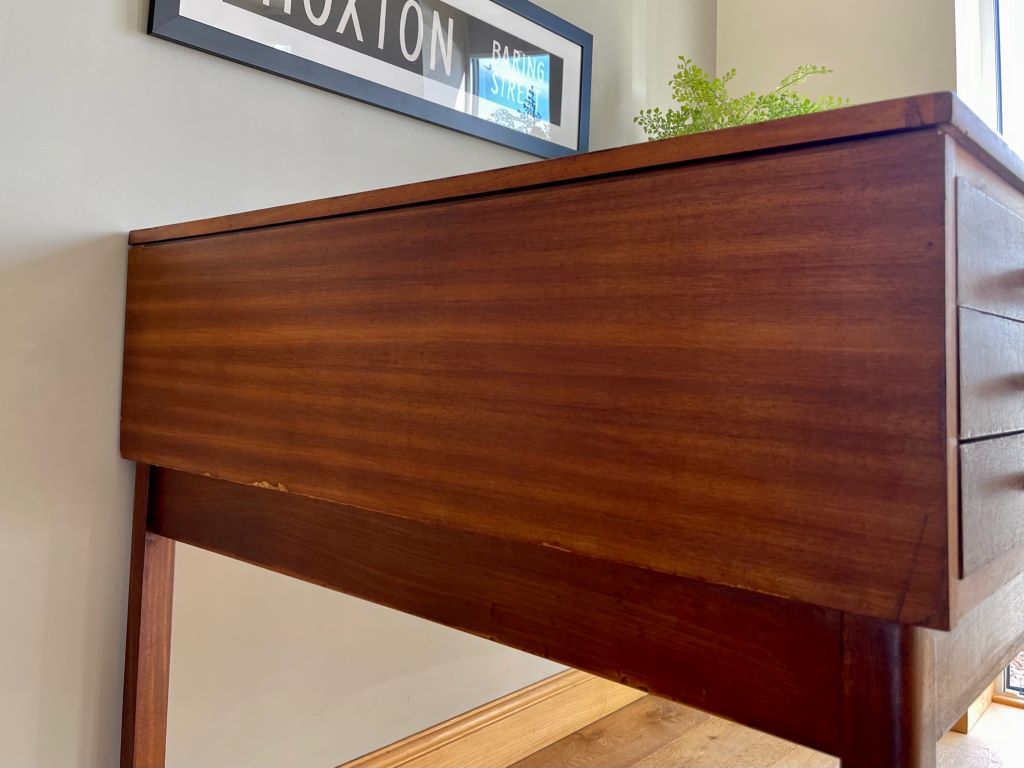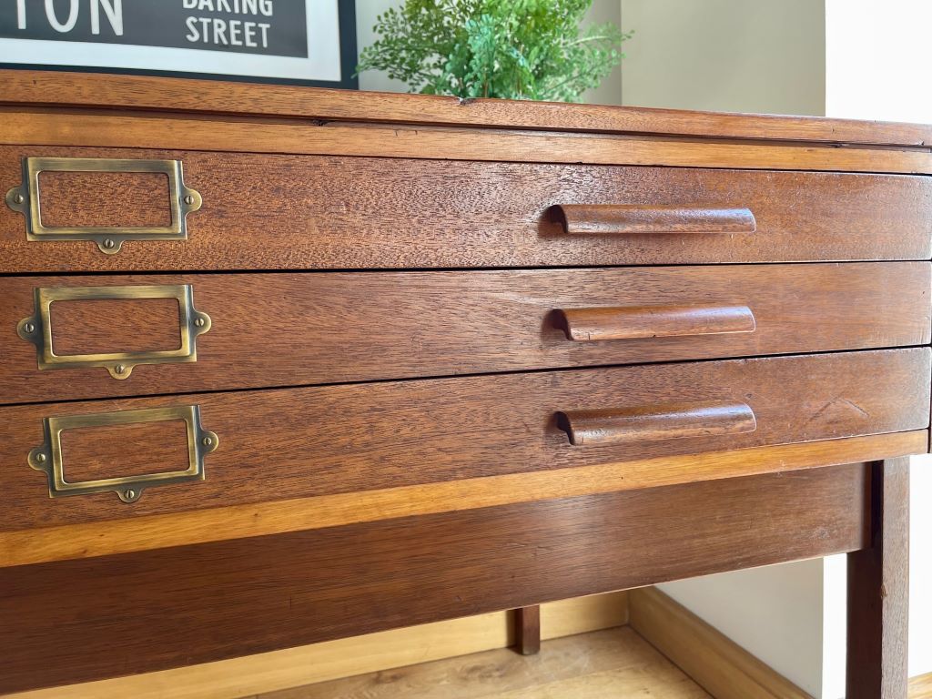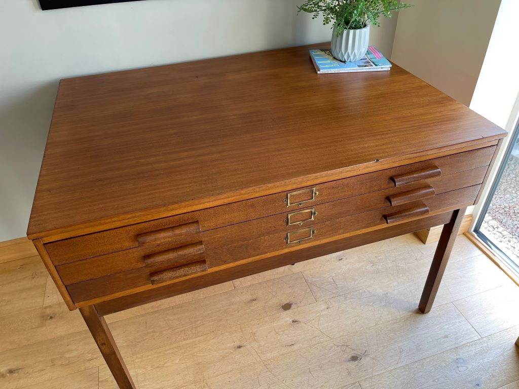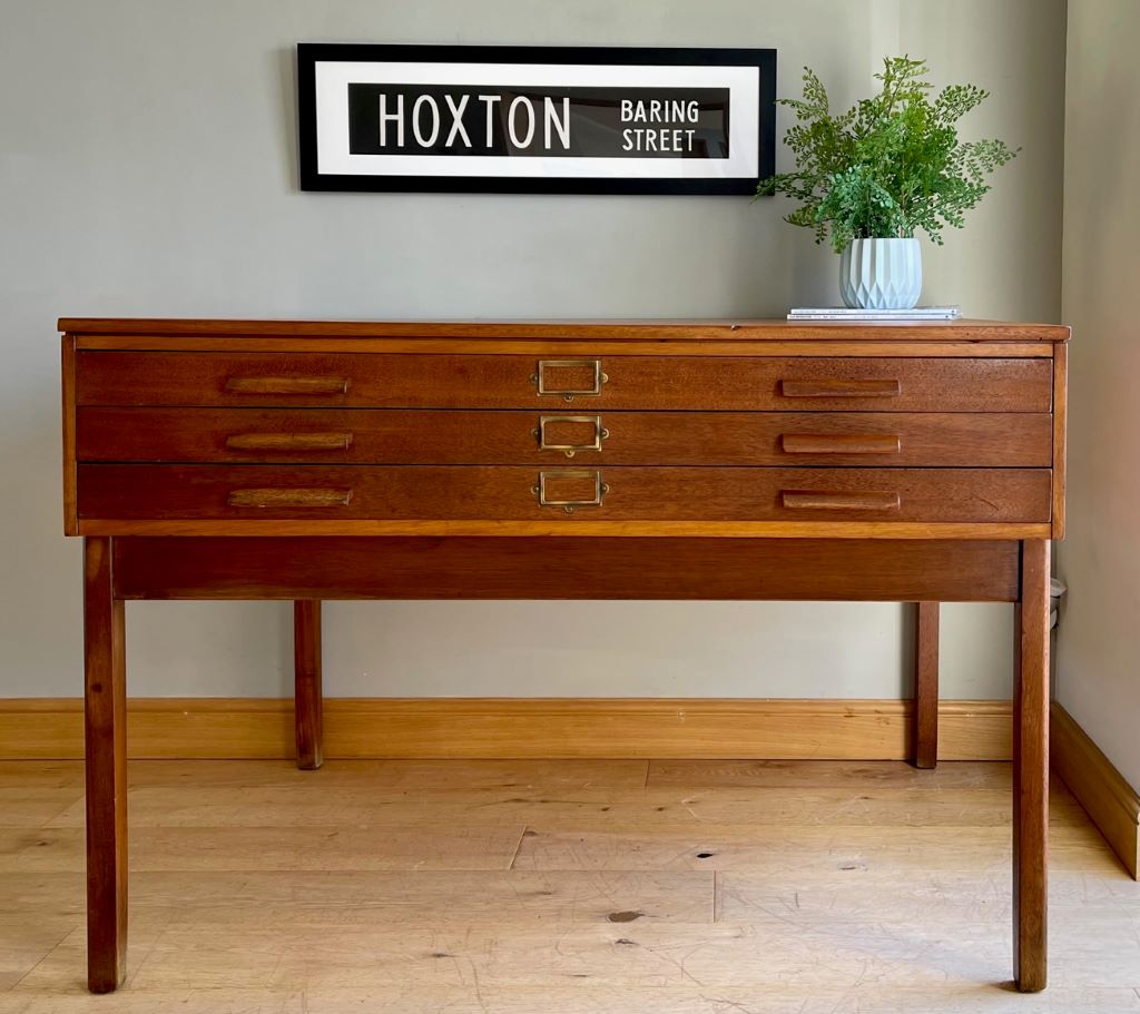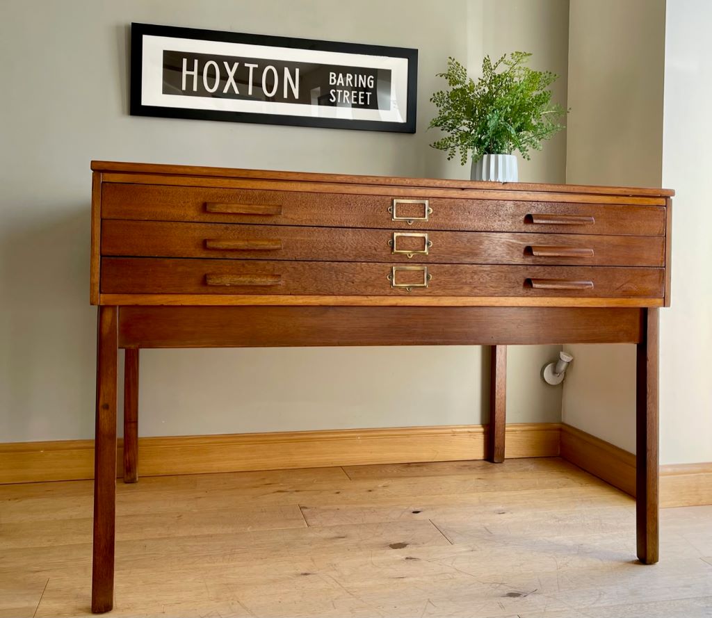A superb original mid Century plan chest on its original removable frame. The beautifully aged teak drawers sit on their original legs which are easily removed for transportation and positioning. The legs are attached by bolts and wing nuts. The three drawers are all very clean inside and free running. We adore the colour and flexibility of this piece. Use as a chest of drawers as photographed or remove the drawers from the base to make a fantastic statement coffee table? Incredibly popular pieces now whether it be for storing artwork, collections, magazines, as a TV stand etc etc.