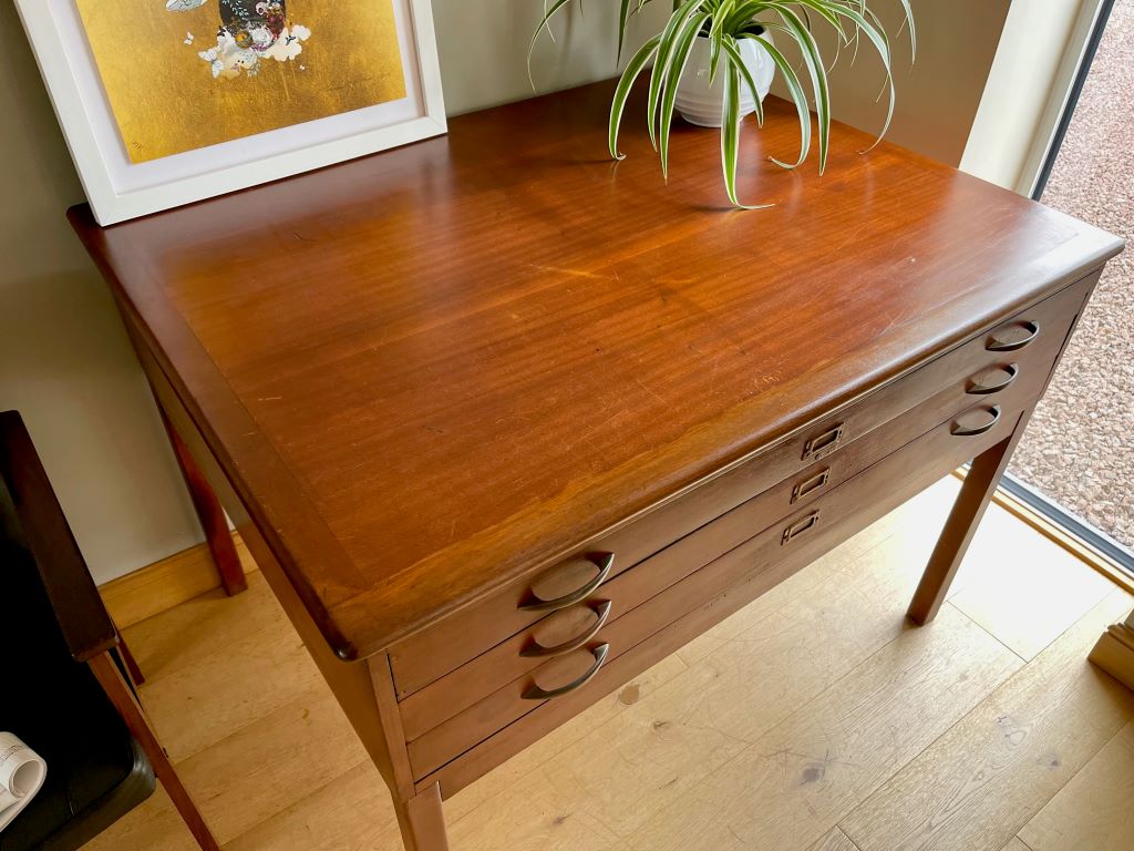 A superb original mid Century plan chest on removable legs. This piece came to us directly from a small engineering firm in Lancashire where it had been all of its life. The drawers sit on their original legs which are easily removed for transportation and positioning. The legs are attached by bolts and wing nuts. The three drawers are all free running. We adore the colour and honesty of this piece. Used exactly what it was originally made for, holding hand drawn large scale drawings. Incredibly popular pieces now whether it be for storing artwork, collections, magazines, as a TV stand etc etc.