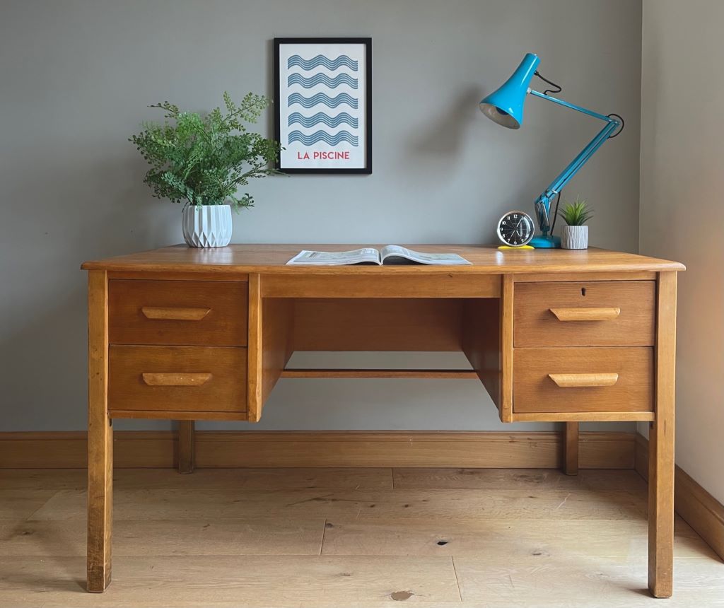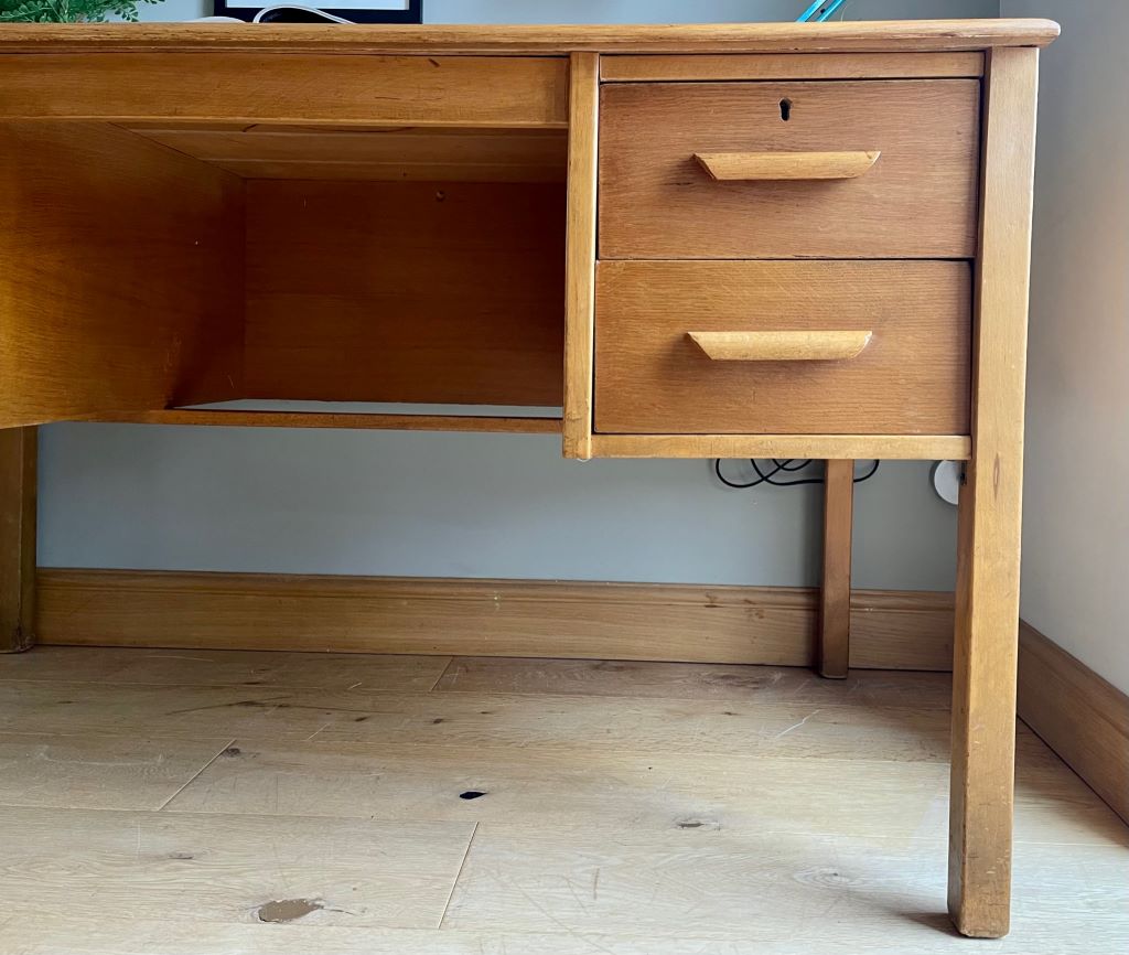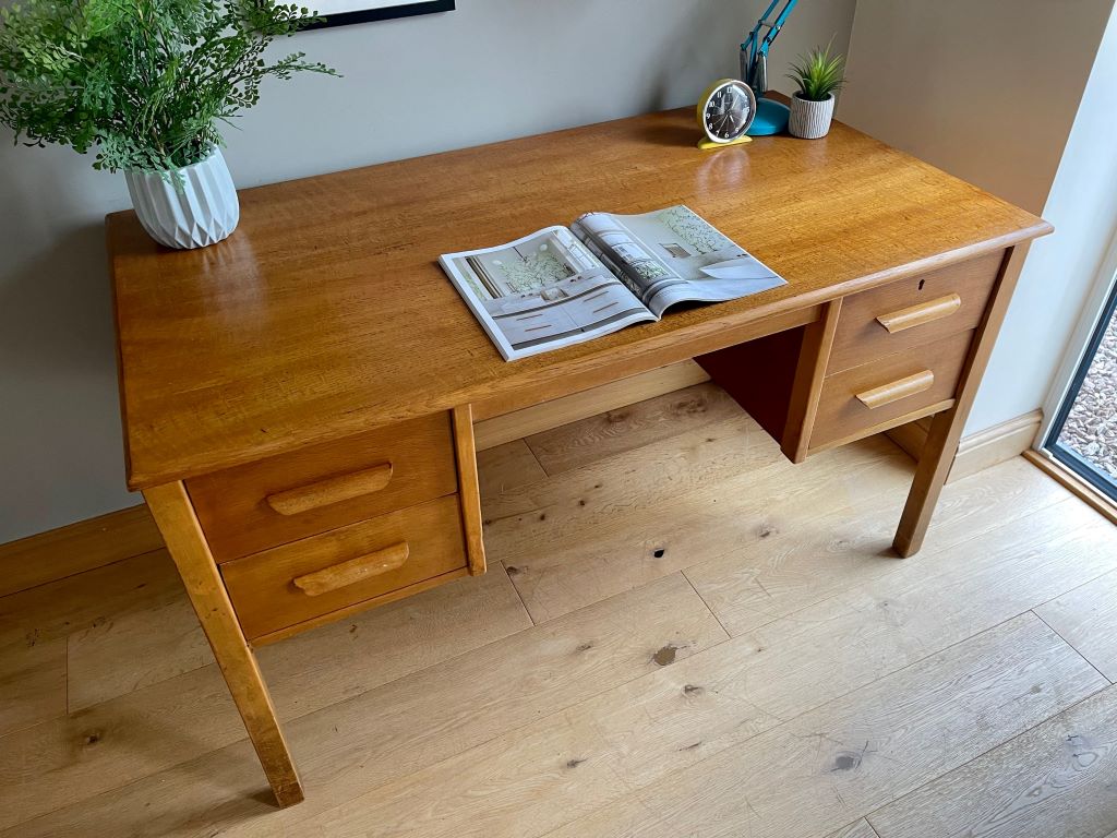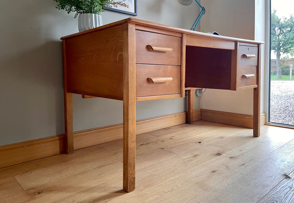 An very smart mid century oak desk with a beautiful work surface. It dates from around the mid to late 1960’s and is in completely original condition but fully cleaned and gently restored by us. This desk came to us from a solicitors office, where it had spent its whole life from new. It is presented in a beautifully aged colour and patina with a really nicely sized work surface for home use. The drawers run freely and have been cleaned and sanded back internally.