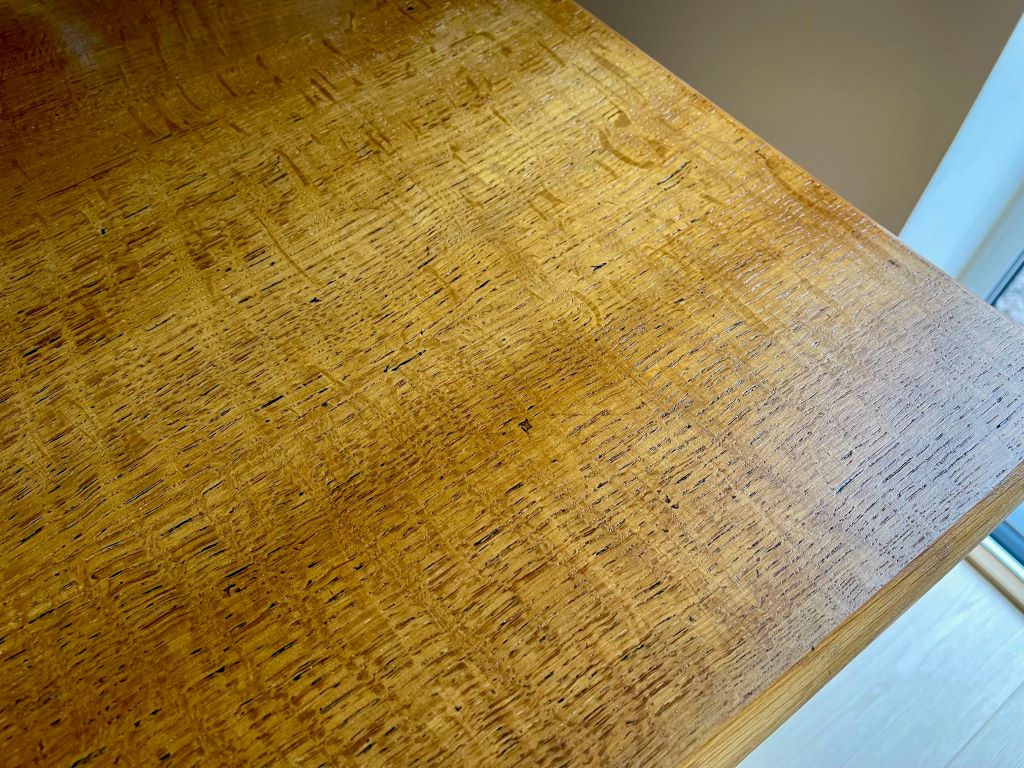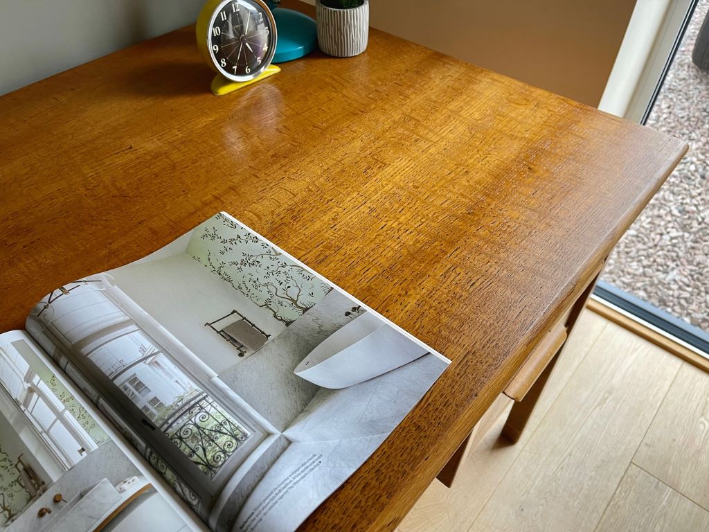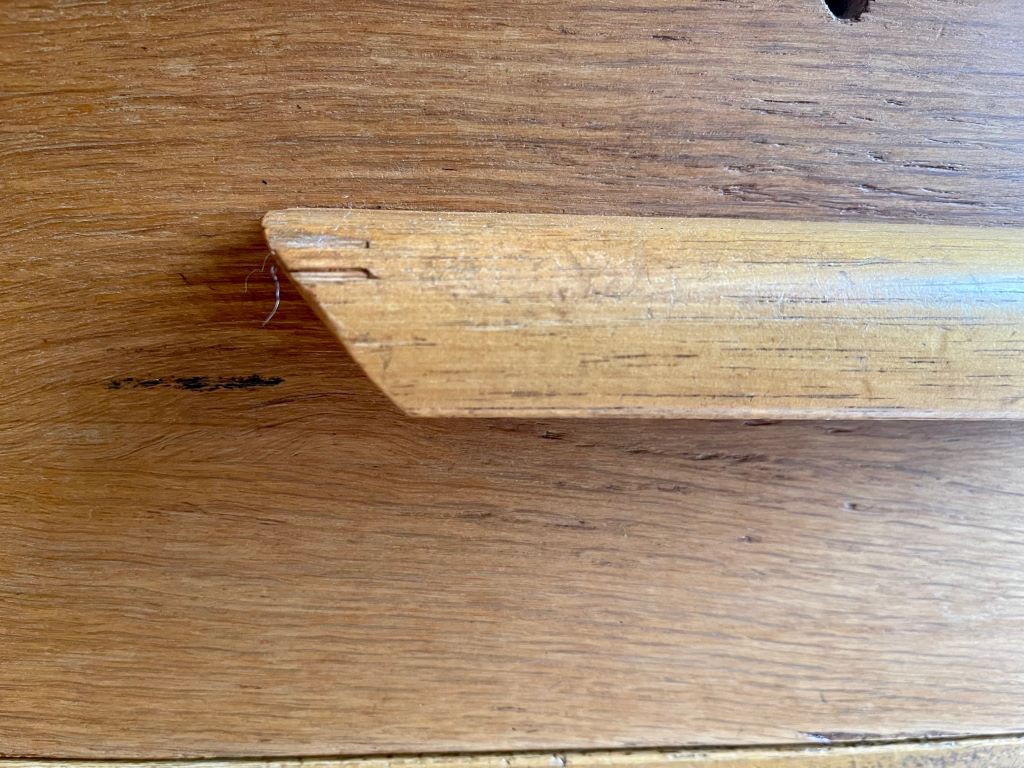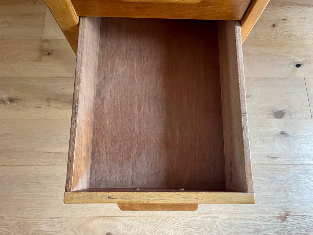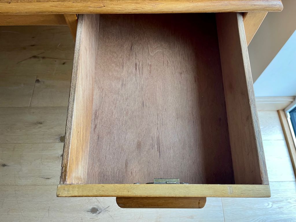 An very smart mid century oak desk with a beautiful work surface. It dates from around the mid to late 1960’s and is in completely original condition but fully cleaned and gently restored by us. This desk came to us from a solicitors office, where it had spent its whole life from new. It is presented in a beautifully aged colour and patina with a really nicely sized work surface for home use. The drawers run freely and have been cleaned and sanded back internally.