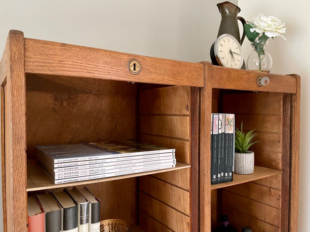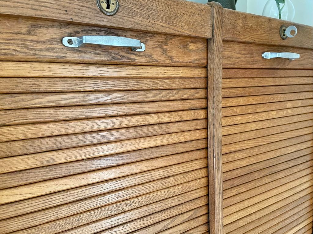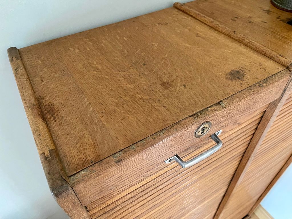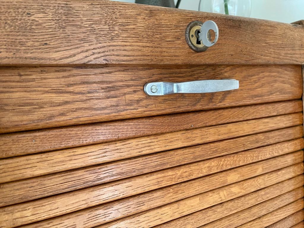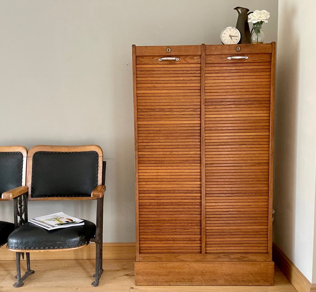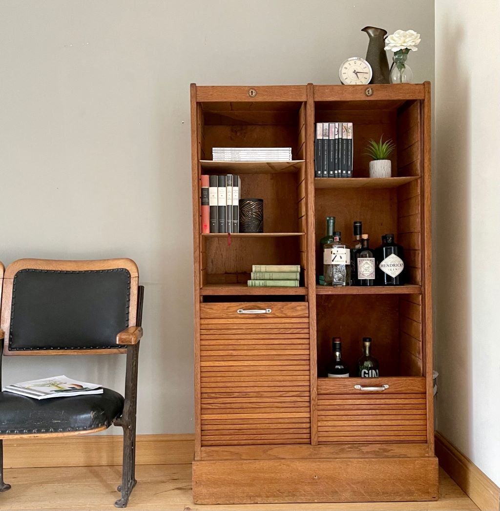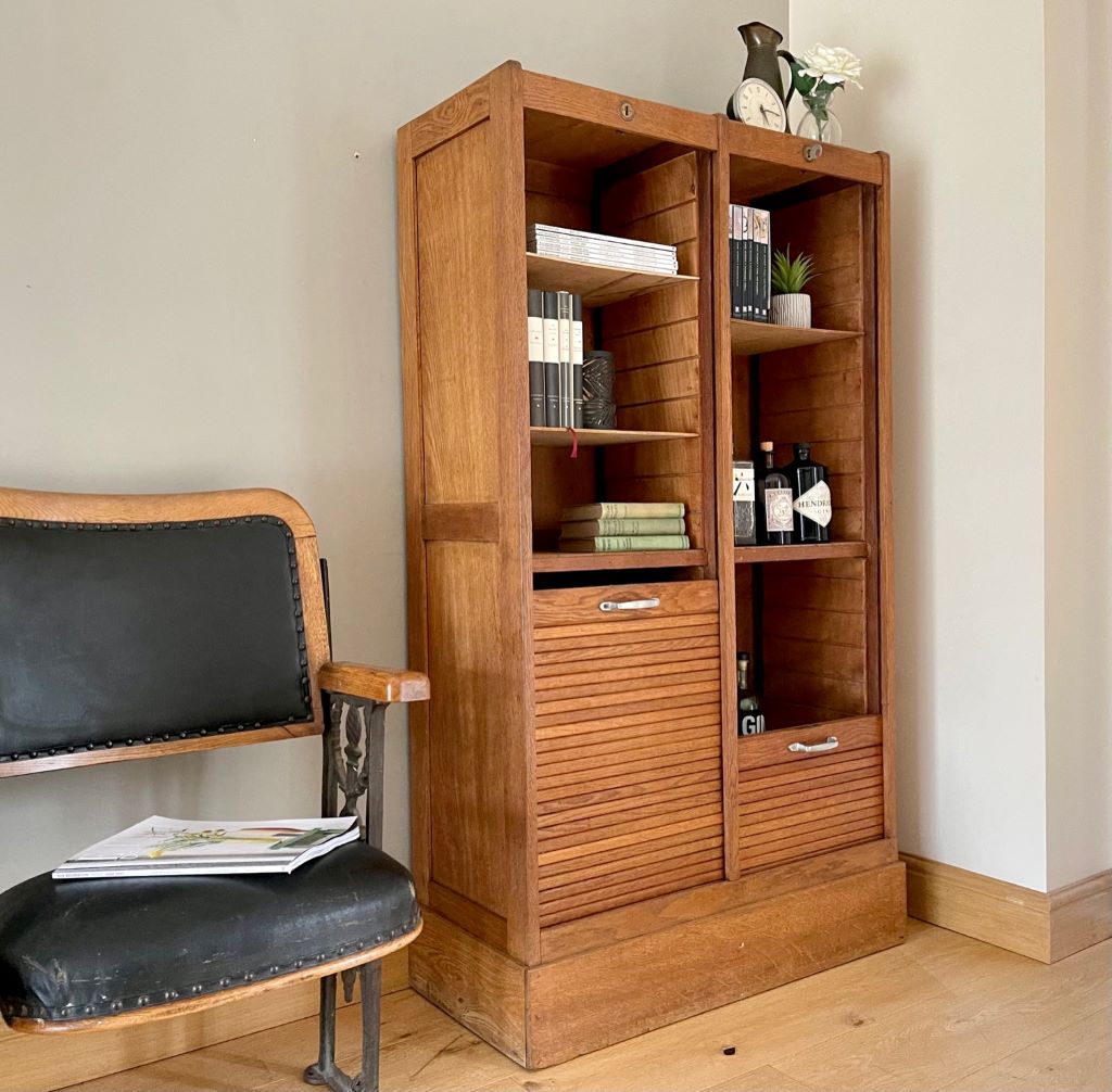 A very nice antique French double tambour cabinet in Oak, dating from the mid 20th Century (c. mid 1950’s to early 1960’s).  It comes with original handles, locks and one key, together with lots of removable and adjustable internal shelves. We love the colour, size and condition on this cabinet. The the size is perfect for the home.  Not too large to over power but offering lots of storage and having a real presence. Both doors run exactly as they should and the locks work well (spring loaded release).