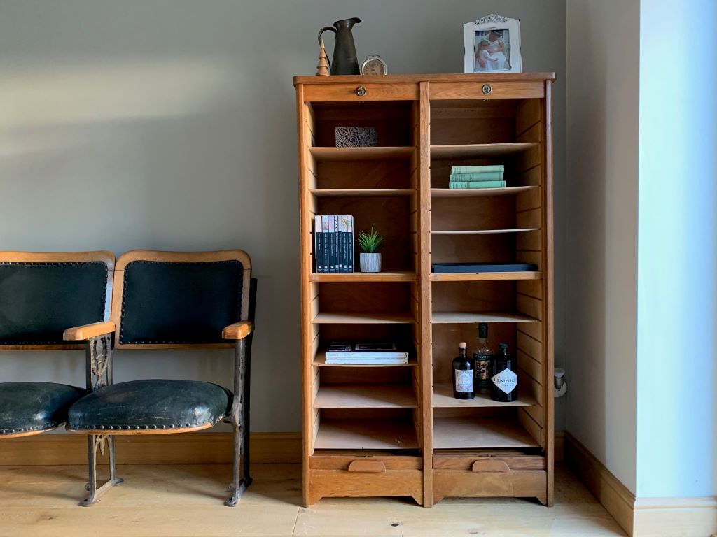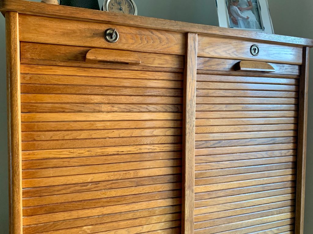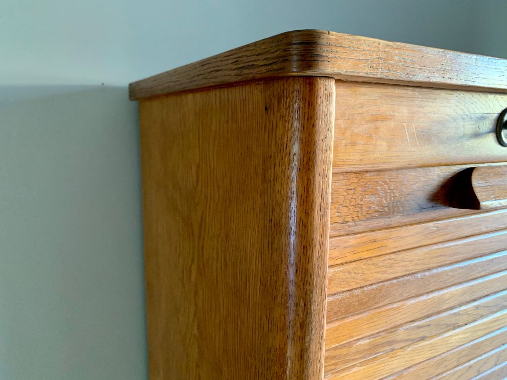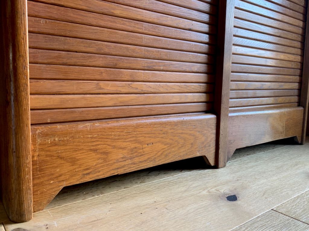 A very nice Antique French double tambour cabinet in Oak, dating from the mid 20th Century (c. late 1950’s to early 1960’s). It comes with original handles, locks and one key, together with lots of removable and adjustable internal shelves. We love the rounded edges to the top and sides of the framework too. The colour and condition of the oak are beautiful and the size is perfect for the home. Not too large to over power but offering lots of storage and having a real presence.