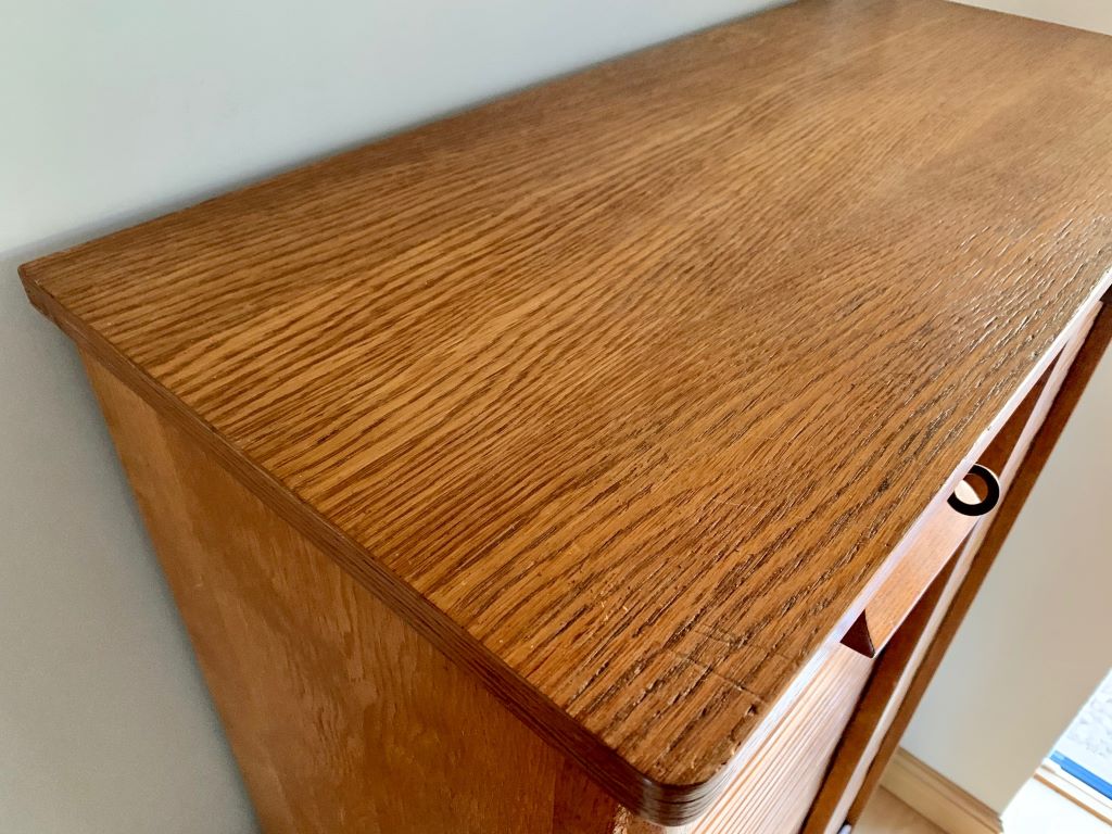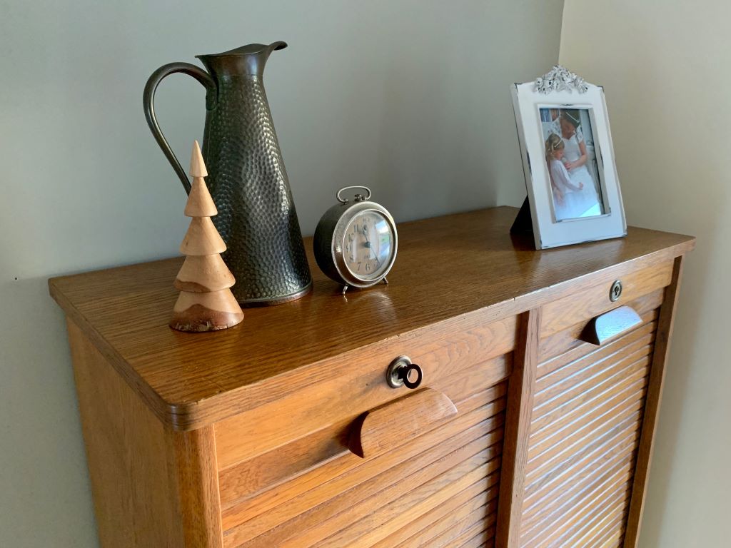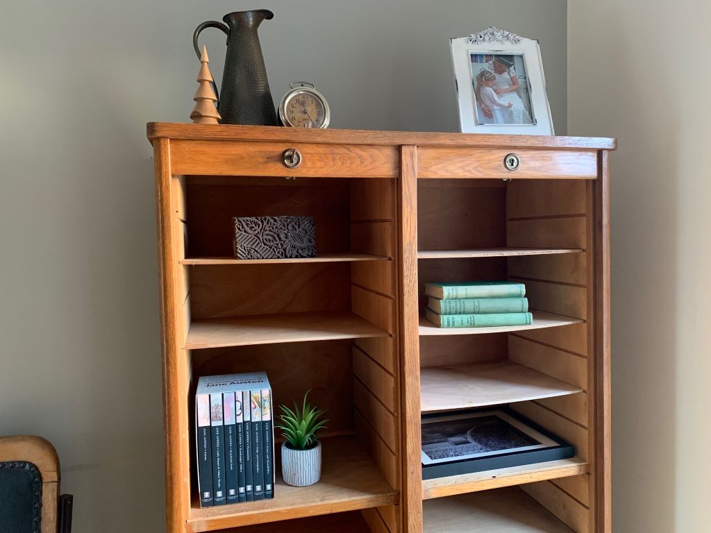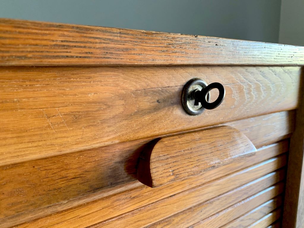 A very nice Antique French double tambour cabinet in Oak, dating from the mid 20th Century (c. late 1950’s to early 1960’s). It comes with original handles, locks and one key, together with lots of removable and adjustable internal shelves. We love the rounded edges to the top and sides of the framework too. The colour and condition of the oak are beautiful and the size is perfect for the home. Not too large to over power but offering lots of storage and having a real presence.