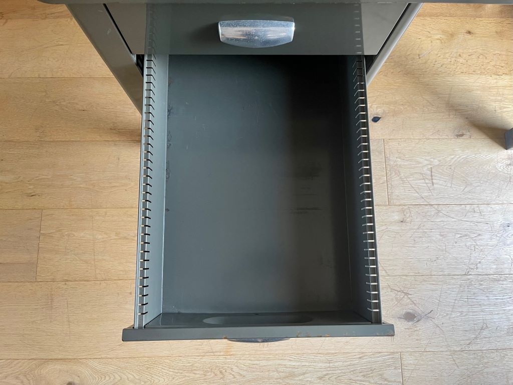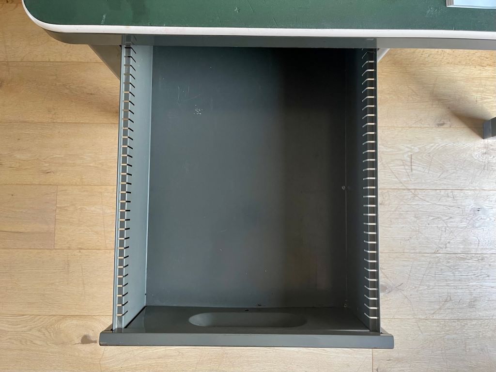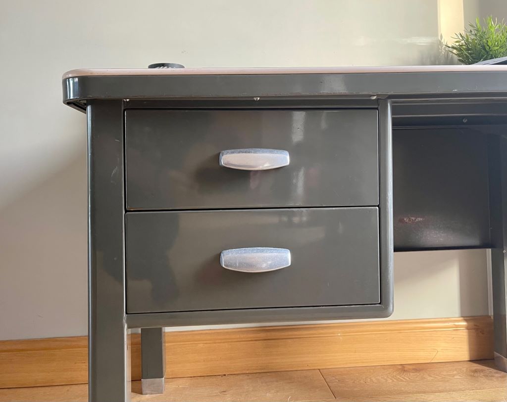 A superb mid century steel desk in exceptional original condition. So many of these desks are in poor condition with dents, scratches, rust etc. No surprise given their industrial use over the last 60 years or more? This one is in outstanding original condition with very clean, free running drawers and its original green top. The desk is in outstanding condition with very few marks. The colour is a real mix of grey/ green, predominantly grey but certainly has a green colour to it. It was manufactured by MetalCub in the 1950’s to early 1960’s and now makes a super desk for a tighter space or a teenager’s study desk?