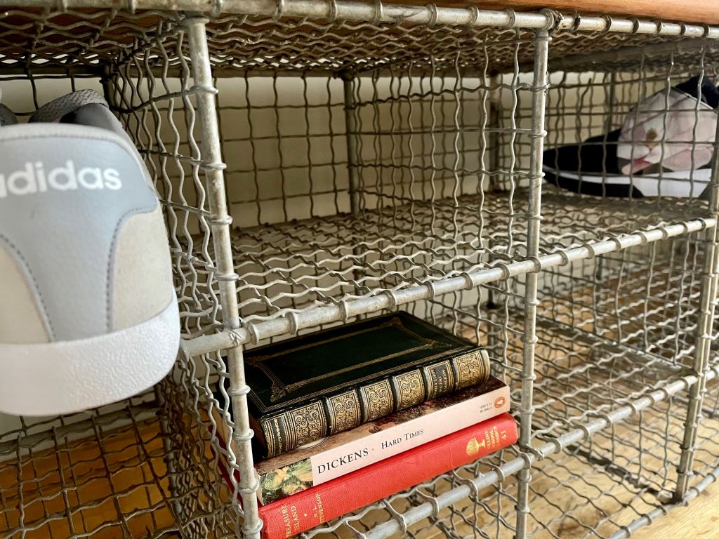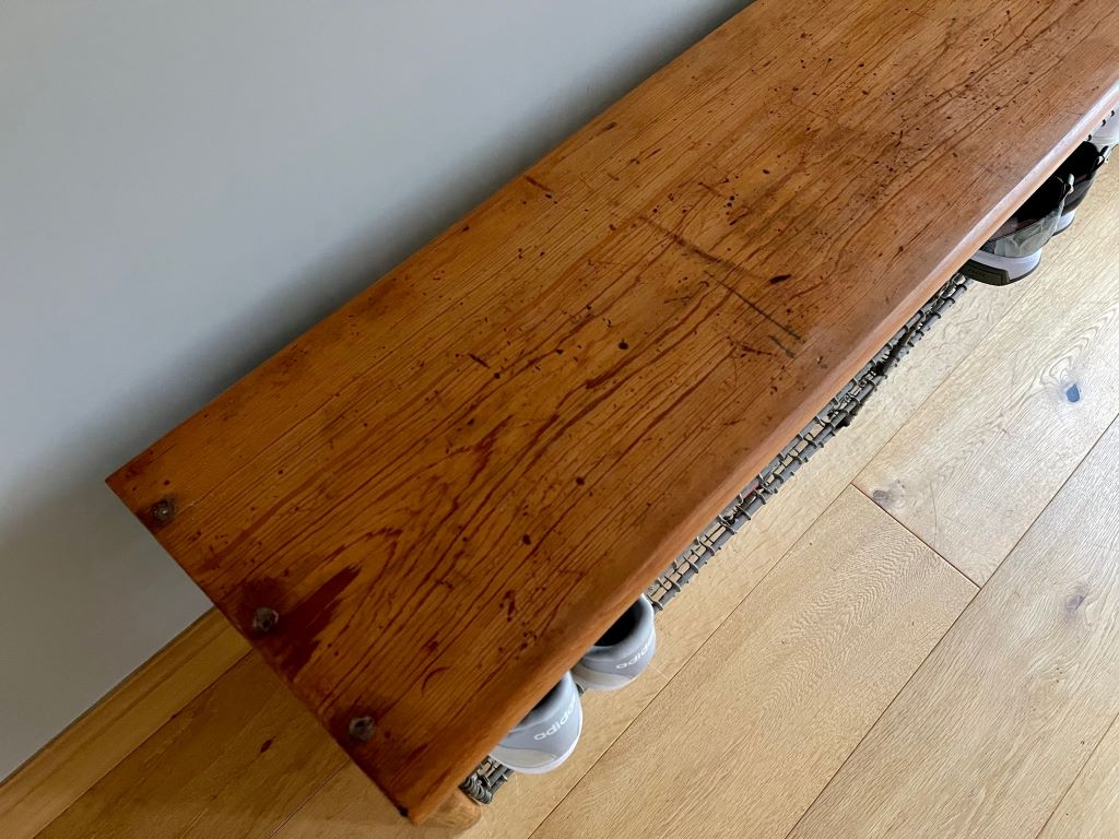 This gym bench dates to around the late 1950’s to early 1960’s. It is a heavy solid piece being surrounded in 30mm thick wood and having 18 show baskets. SO much storage!