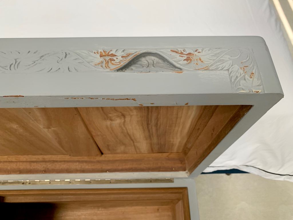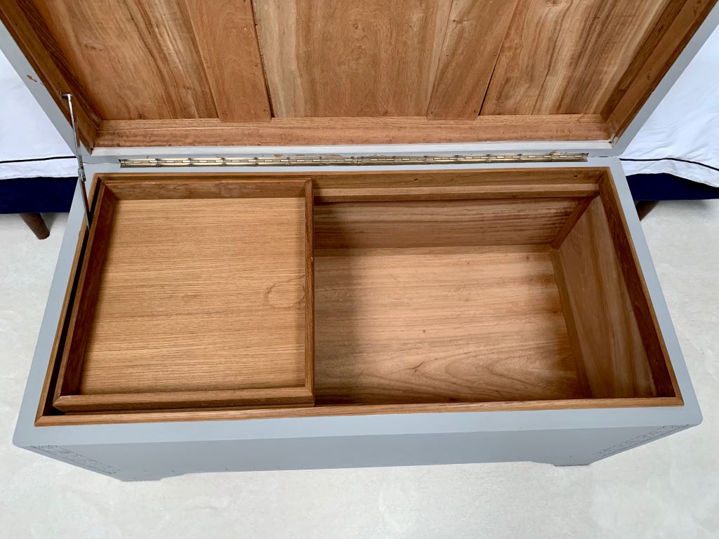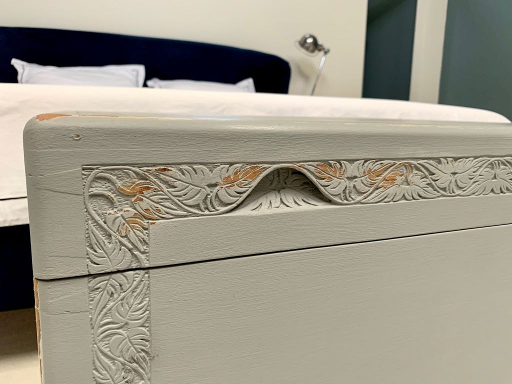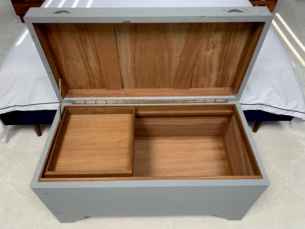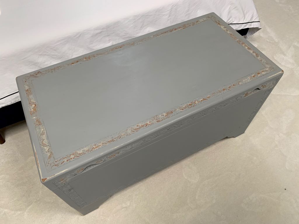 A beautiful mid century ottoman/ chest from South East Asia. It is made from camphor wood to give it a beautiful smell for any blankets or linens stored inside. We refinished the piece in Farrow & Ball Manor House Grey and distressed. Stunning carved pattern gives it a very pretty and unique style. Can obviously be use to store blankets, cushions, books, CD’s, Toys etc.