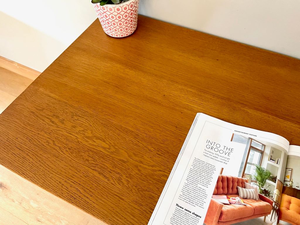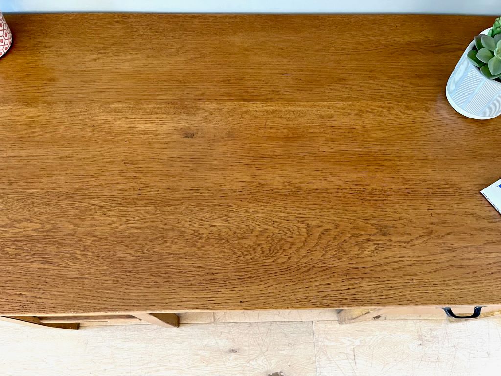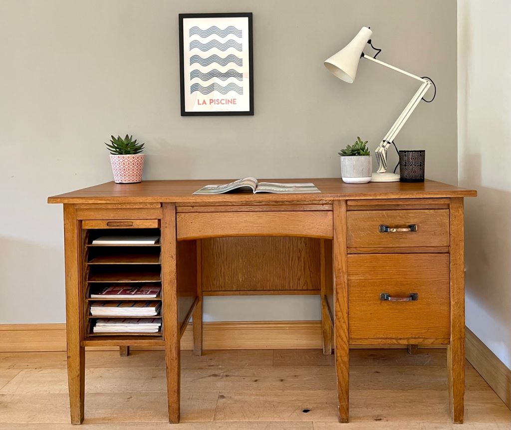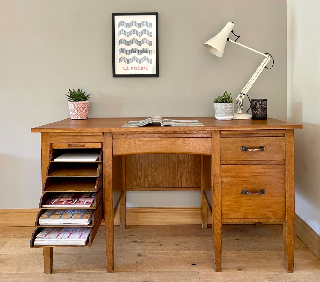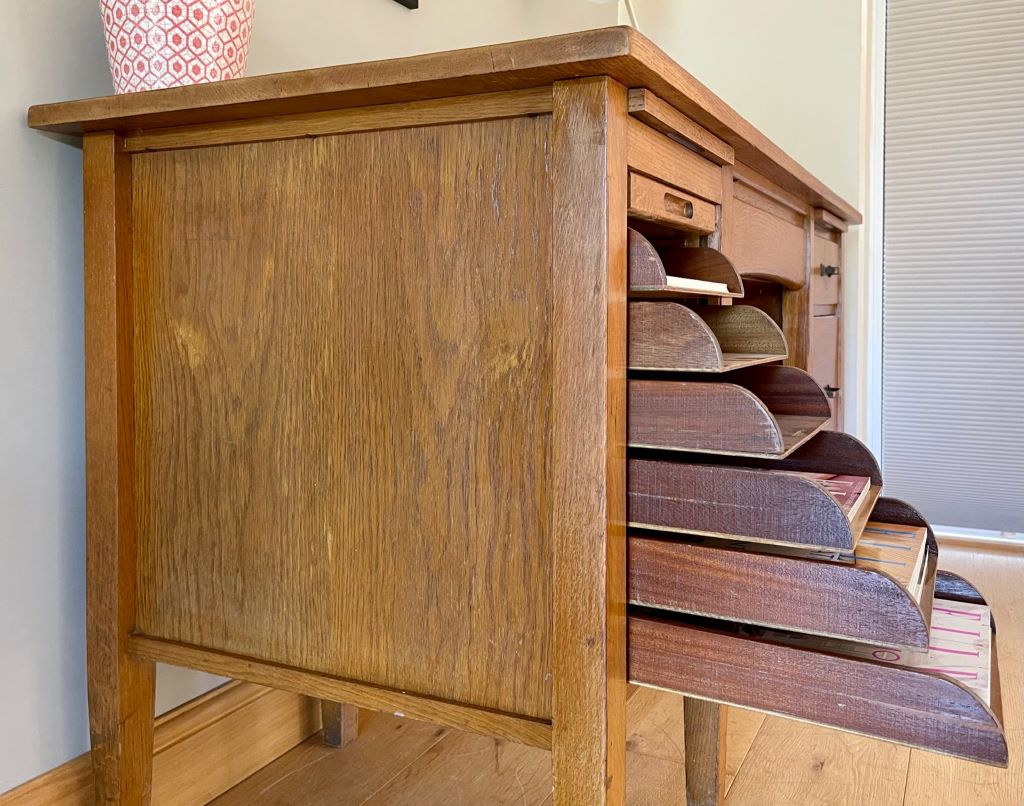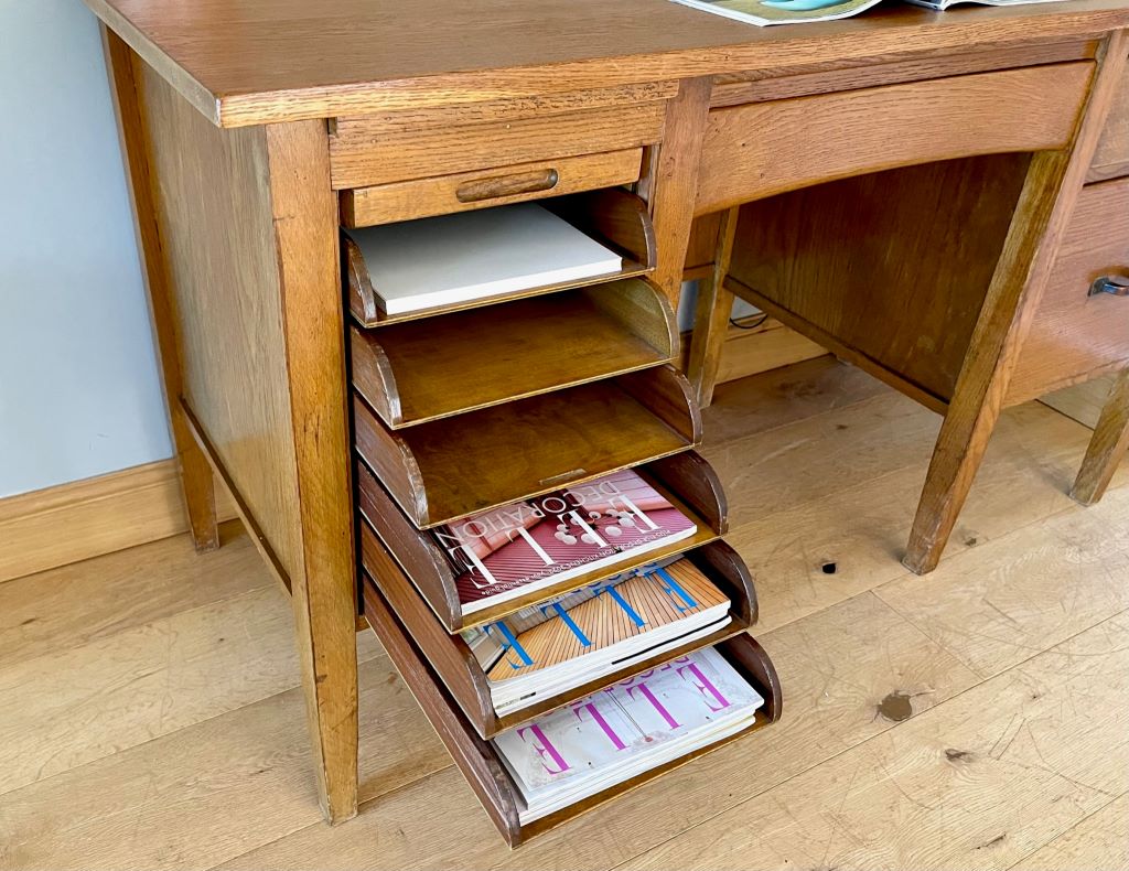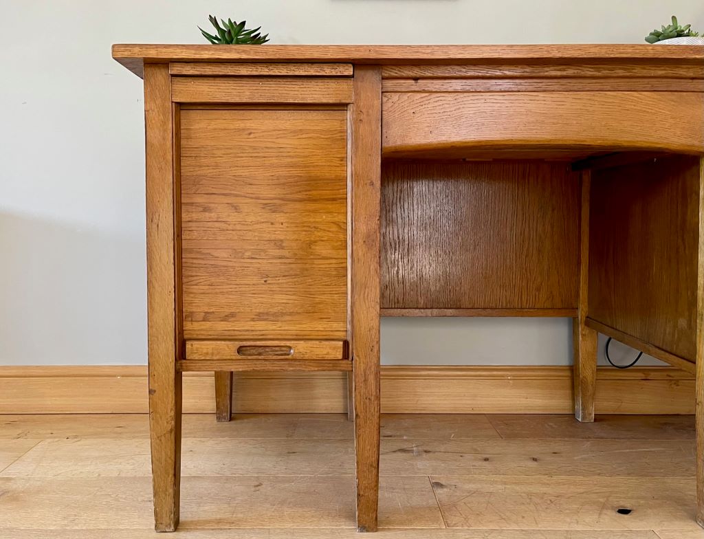 A super looking 1950’s desk constructed from beautifully coloured oak. It is in a perfectly aged colour and tone. The left pedestal has 6 gorgeous pull out filing type trays all covered by a tambour door; just fantastic. The desk also offers a deep filing drawer and a regular drawer in the left pedestal. With a central kneehole drawer as well there is a huge amount of awesome storage! We refurbished the top as it was peeling and faded but is now ready for regular use by a lucky new owner. The desk is not too deep, making it perfect if you have narrow doors or staircase etc. A great size for regular use but not a worry on whether it will fit in to your space.