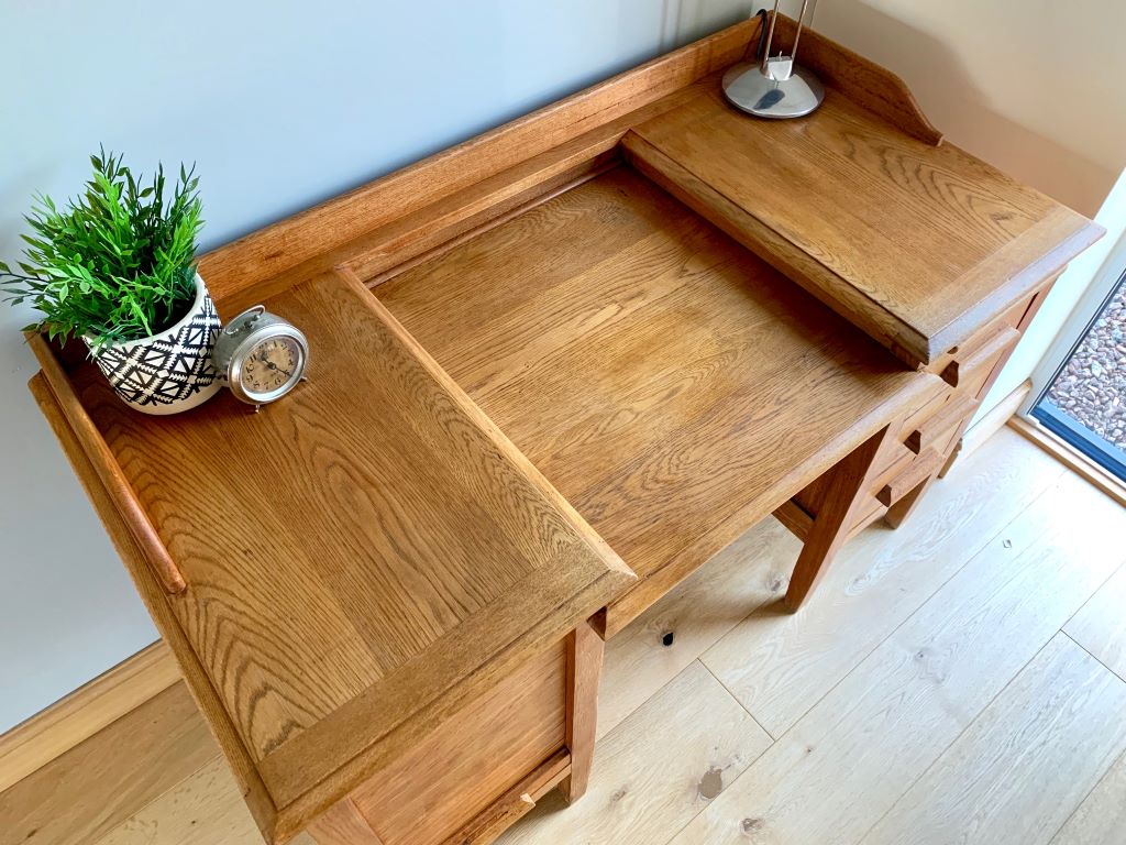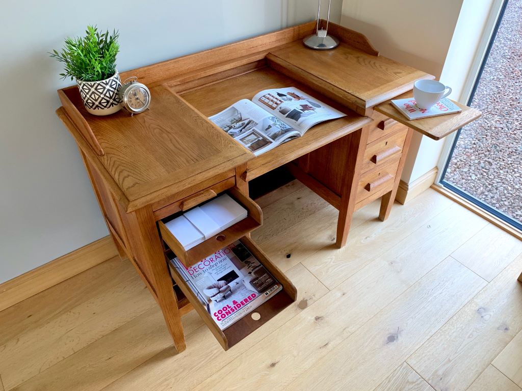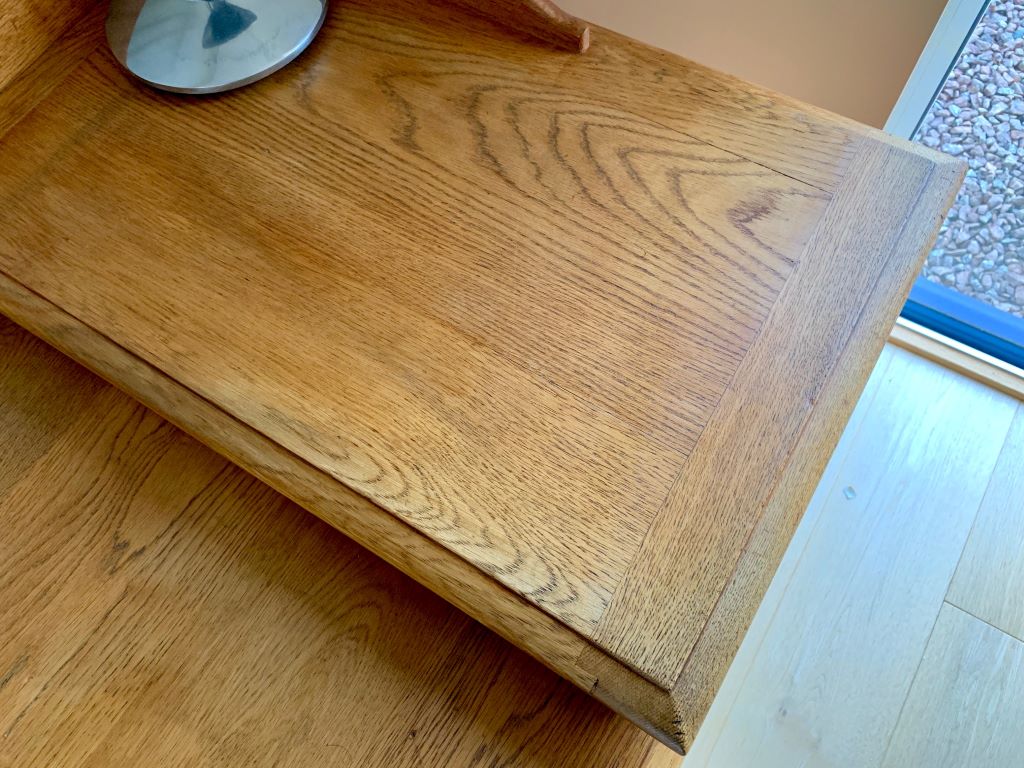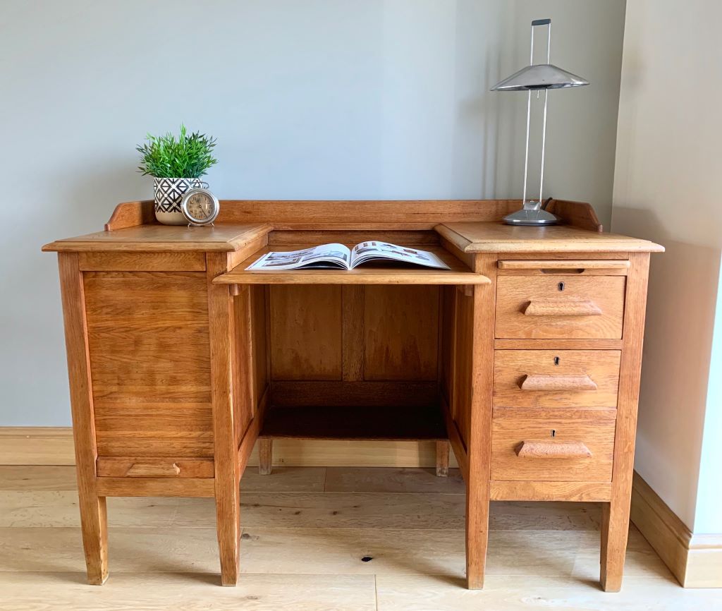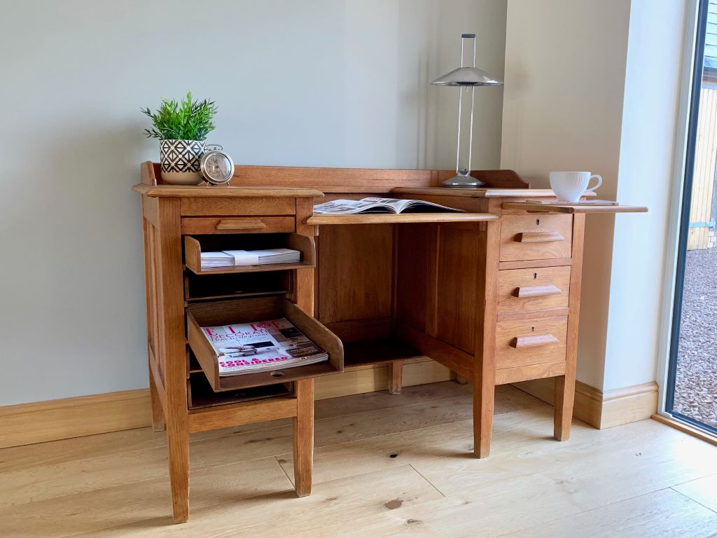 We love the overall shape, colour and condition. Unusual design, top quality radial cut oak and without doubt a fantastic colour. The colour and condition are exactly as you would want an original vintage desk of this age. The size of the desk also makes it very usable without being over powering, or an issue trying to fit through doors and in to your space.